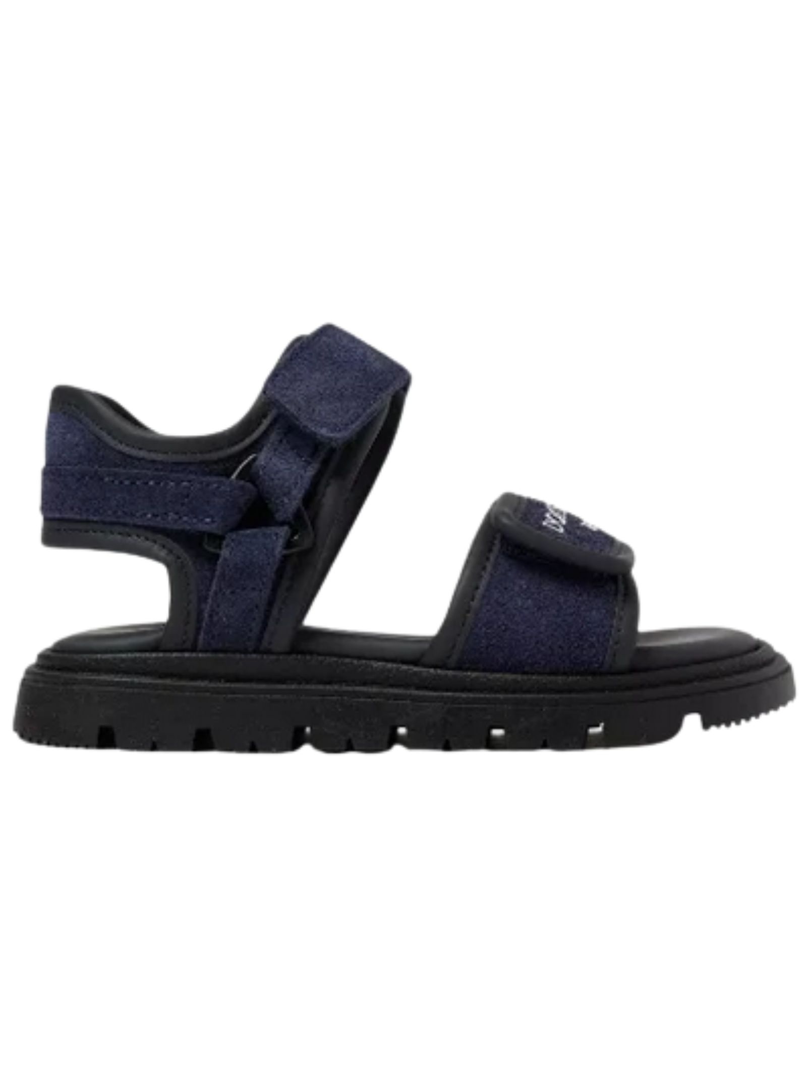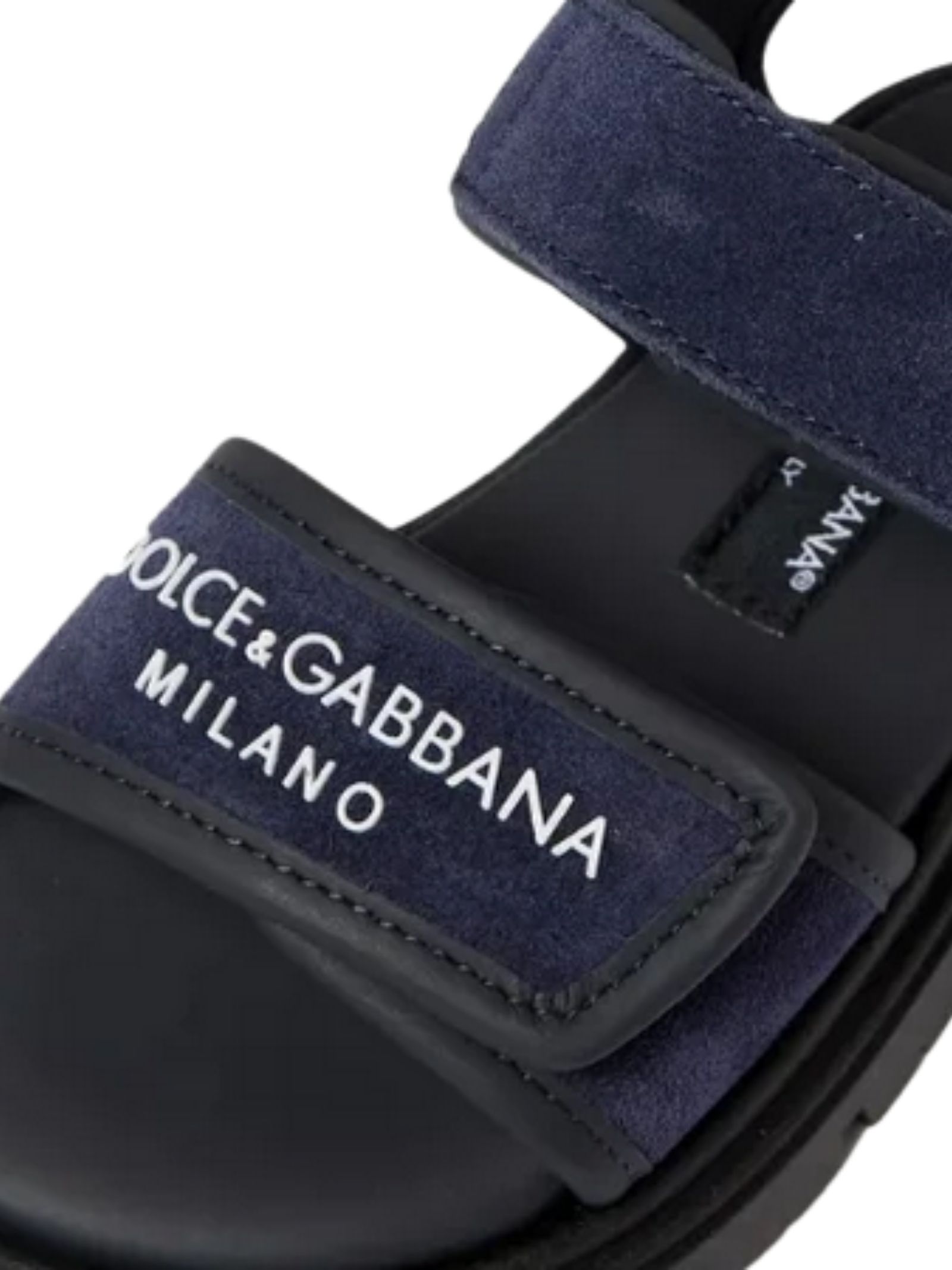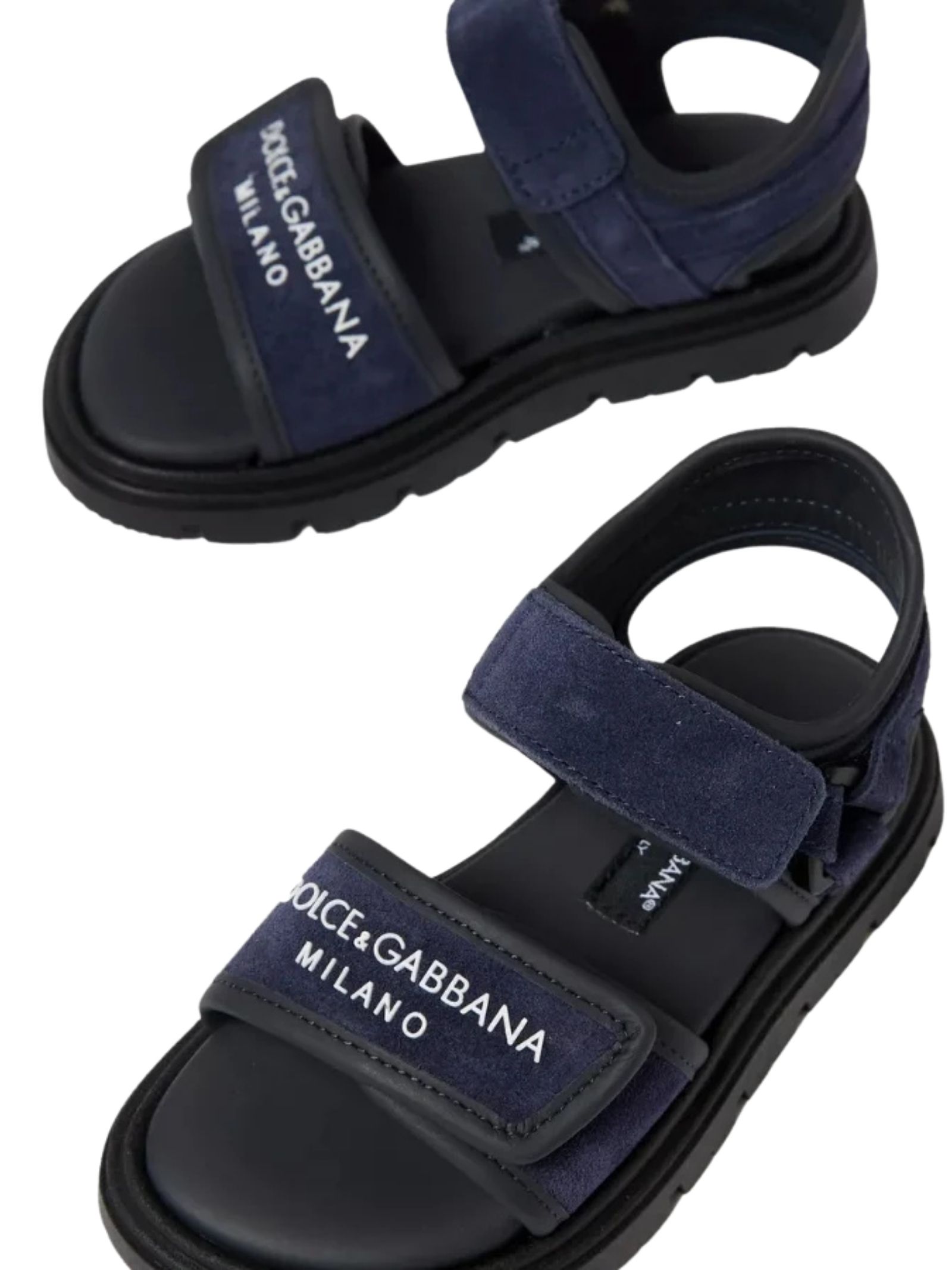 Dolce & Gabbana Kids blue suede sandals with a double velcro closure, contrasting logo, lambskin insole, logo fabric label, and rubber sole with grooves. Made in Italy.