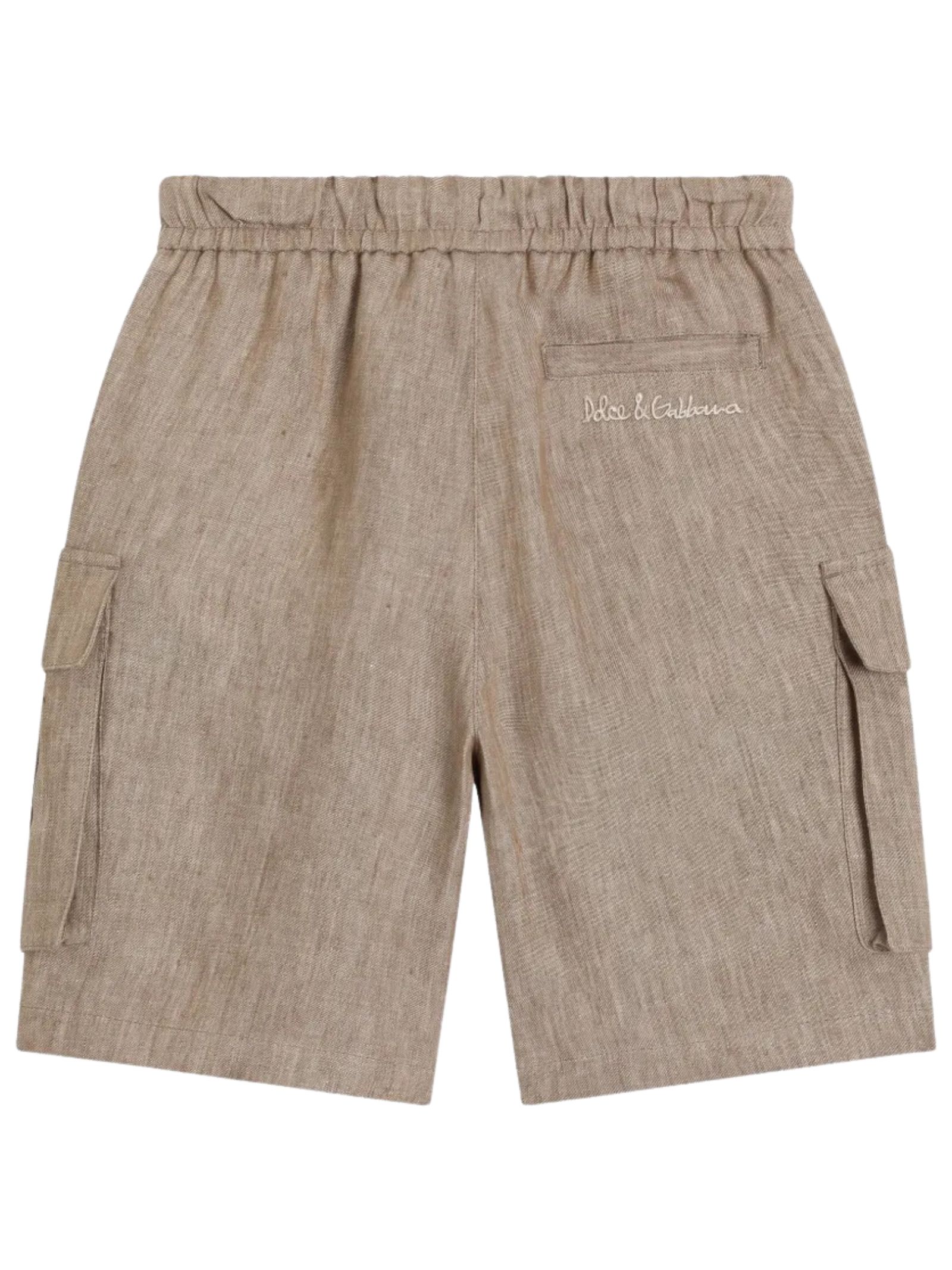 Dolce & Gabbana Kids sand-colored Bermuda shorts, elasticated waist with drawstring, two diagonal side pockets, one back pocket, two cargo pockets, embroidered logo on the back, regular fit. Composition: 100% linen. Made in Italy.