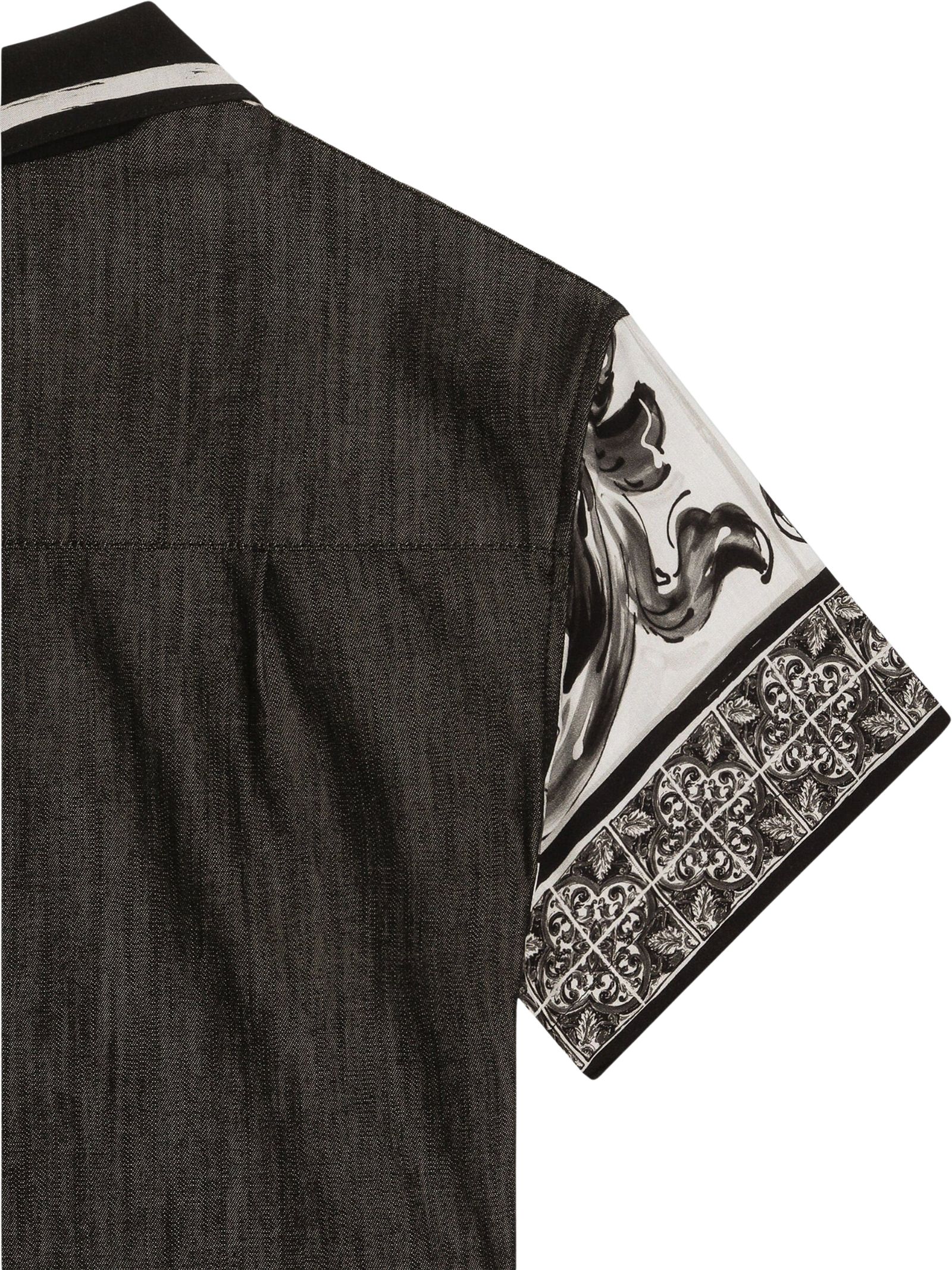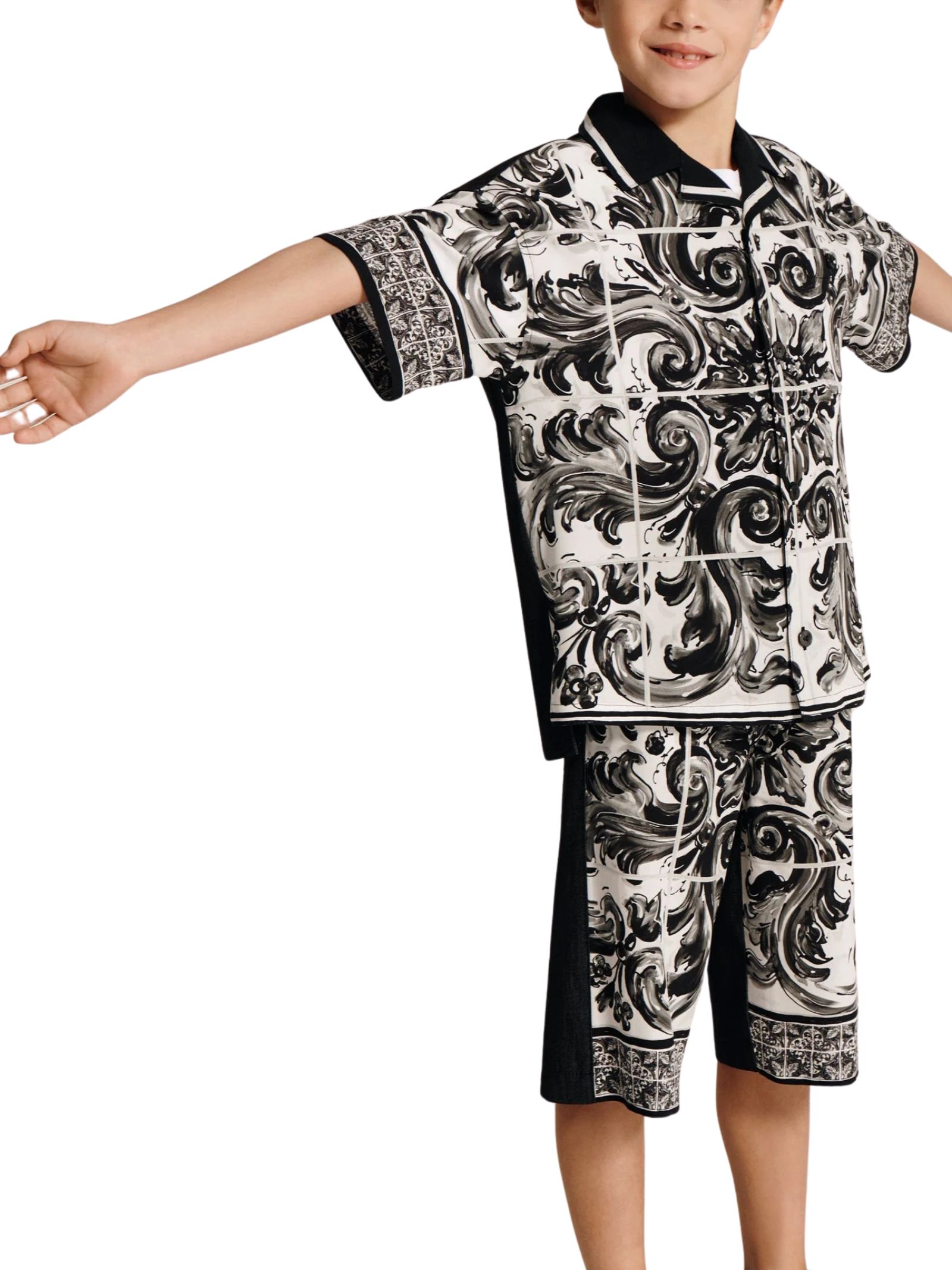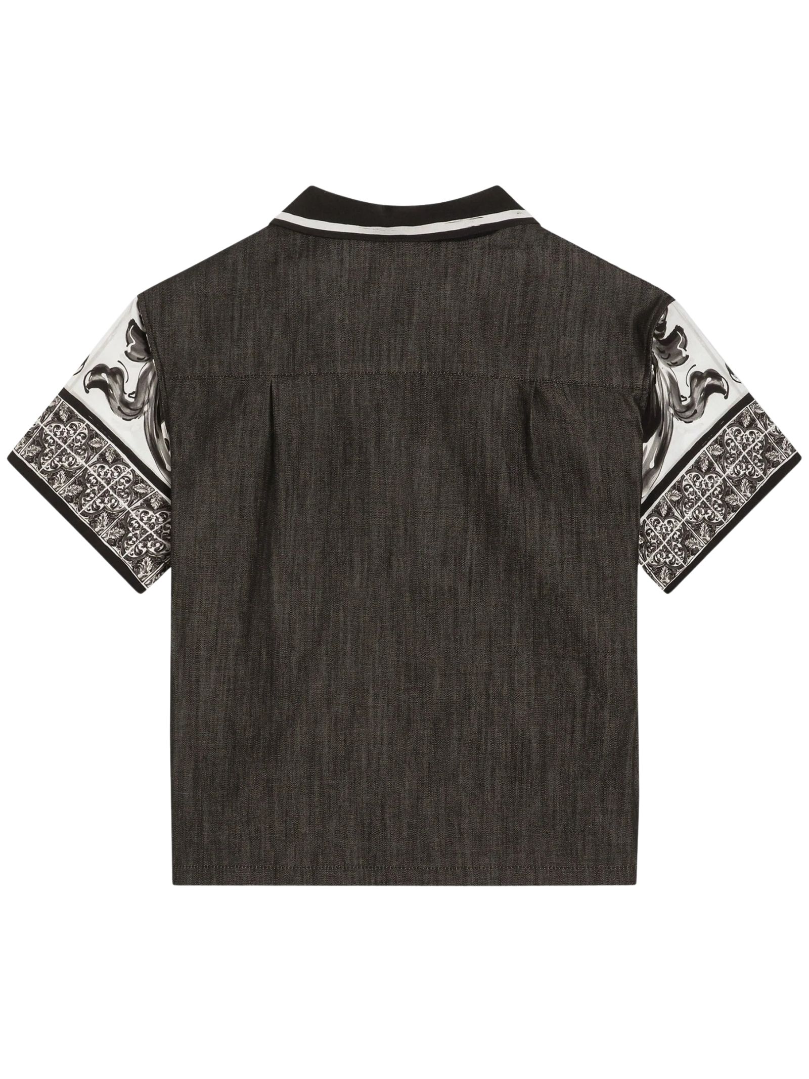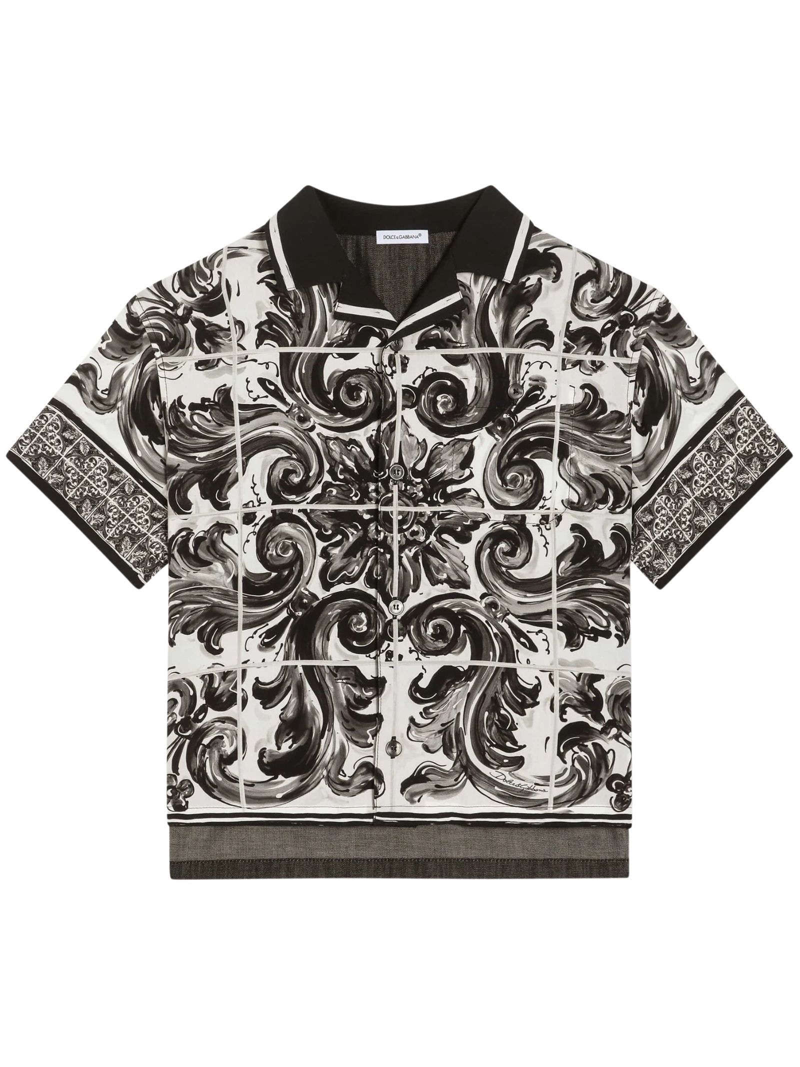 Dolce & Gabbana Kids black/white majolica-print shirt featuring denim blocks, an oversized fit, a chest pocket, short sleeves, and an open collar. Print placement may vary due to the handmade nature of the piece. Composition: 50% Cotton, 50% Viscose. Made in Italy.
