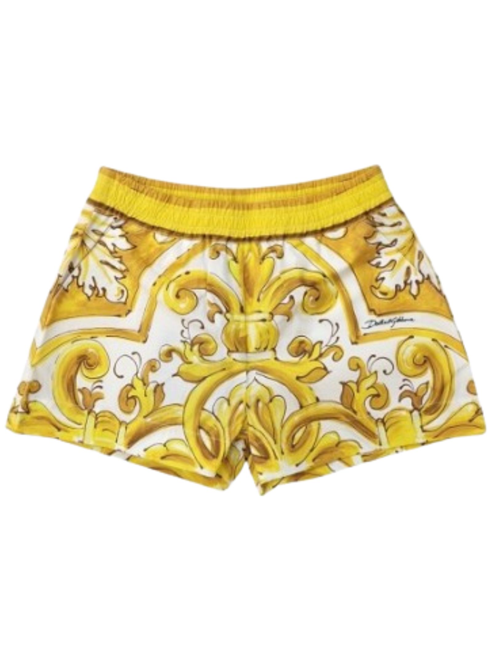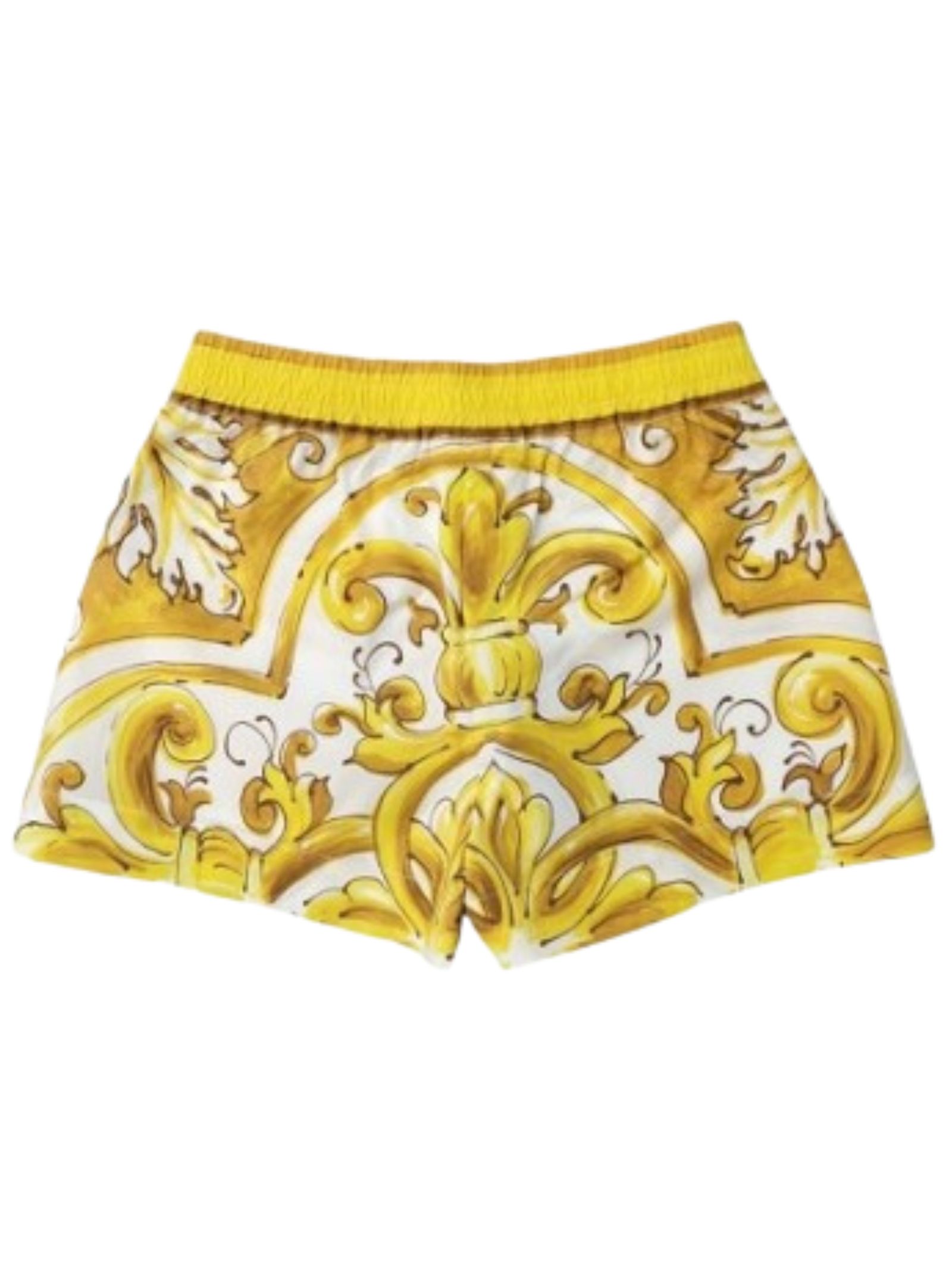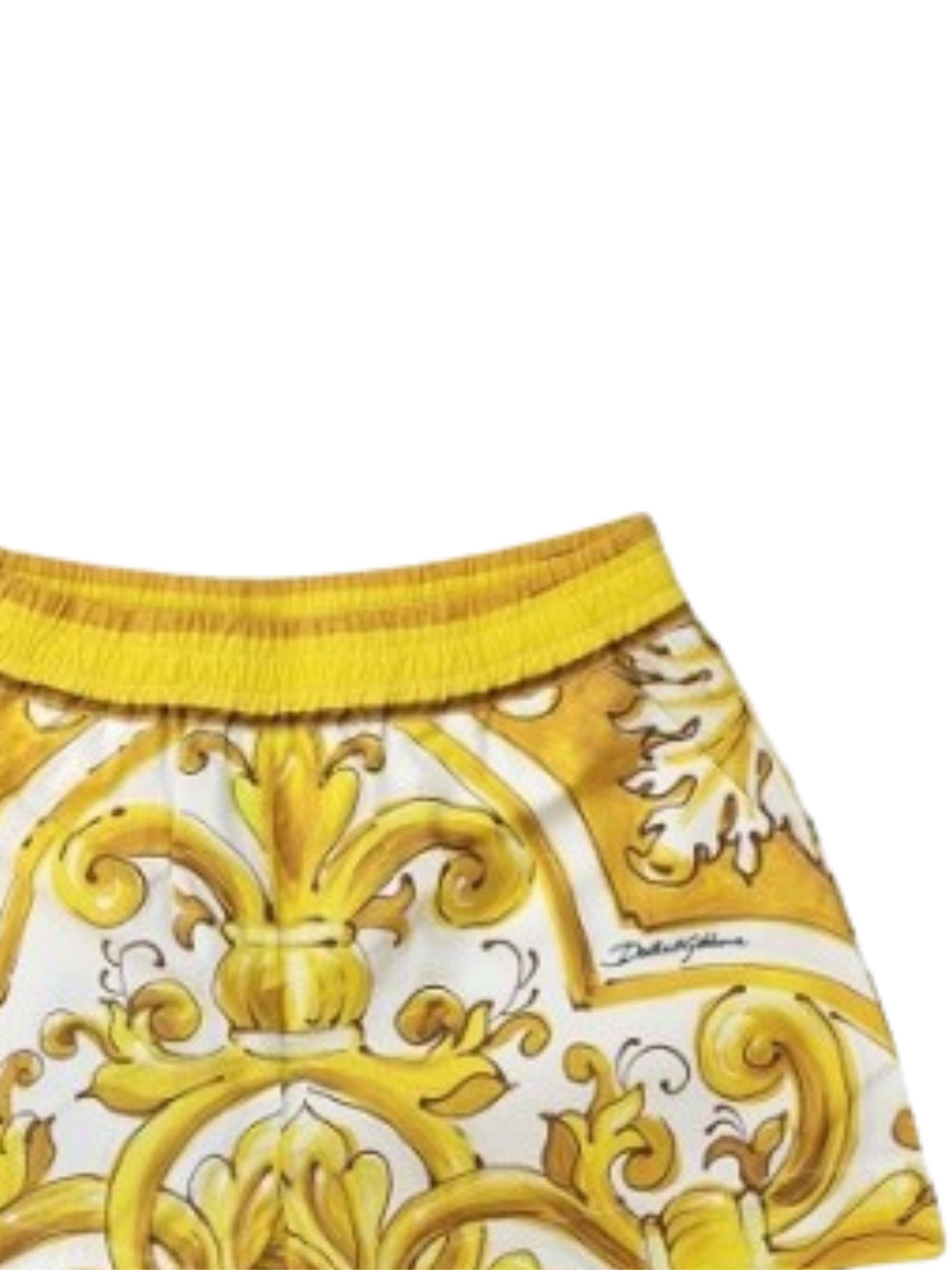 Dolce & Gabbana Kids' white/gold majolica-patterned shorts with an elastic waistband, two side pockets, and a regular fit. Composition: 100% cotton. Made in Italy.