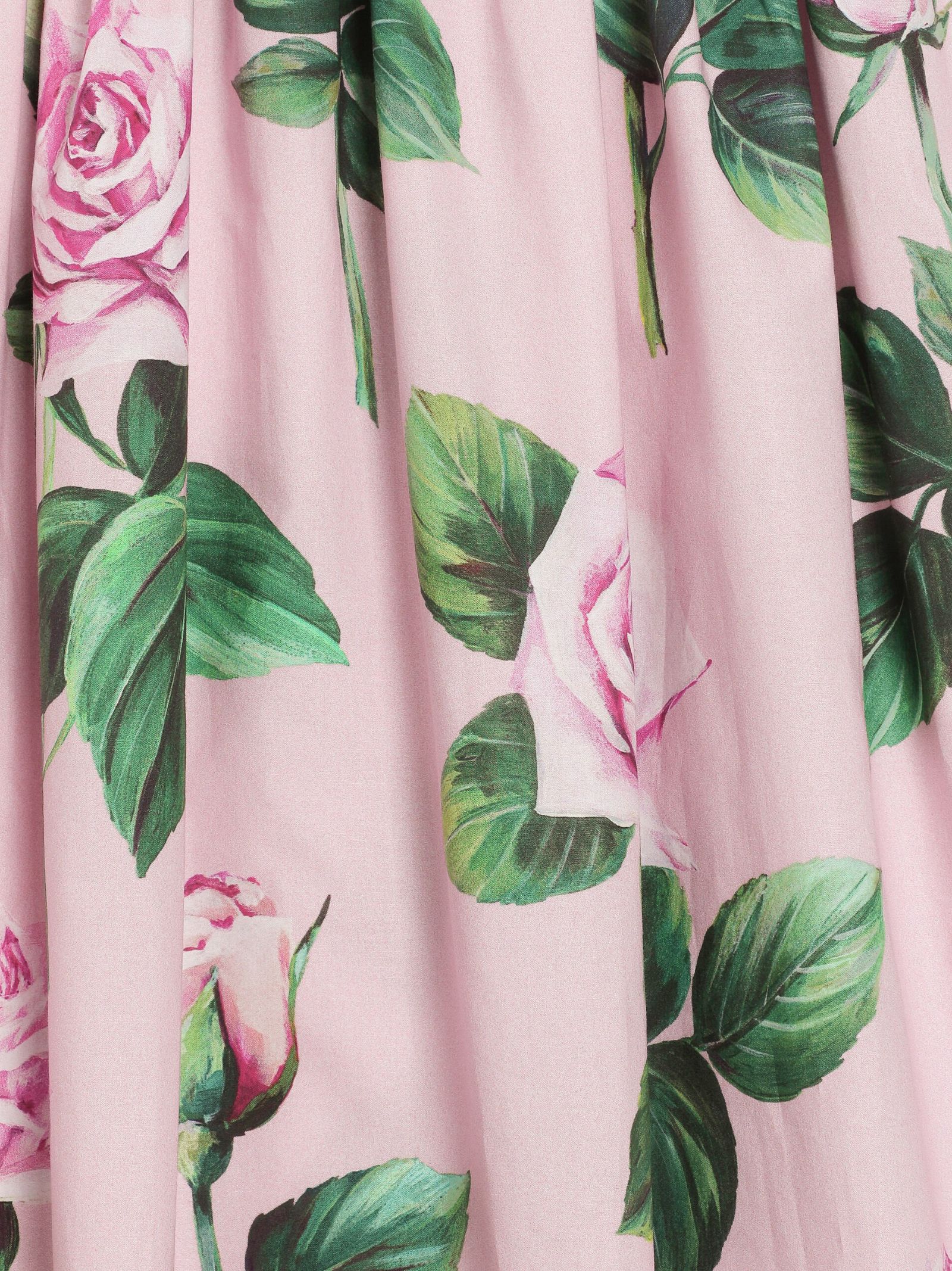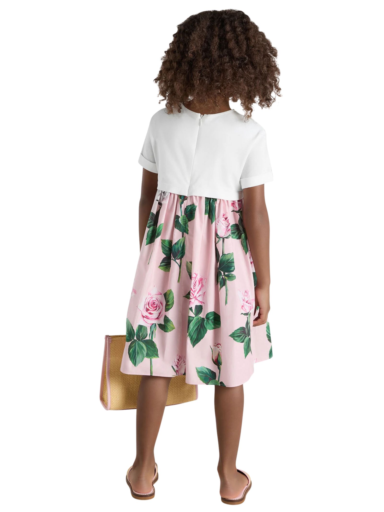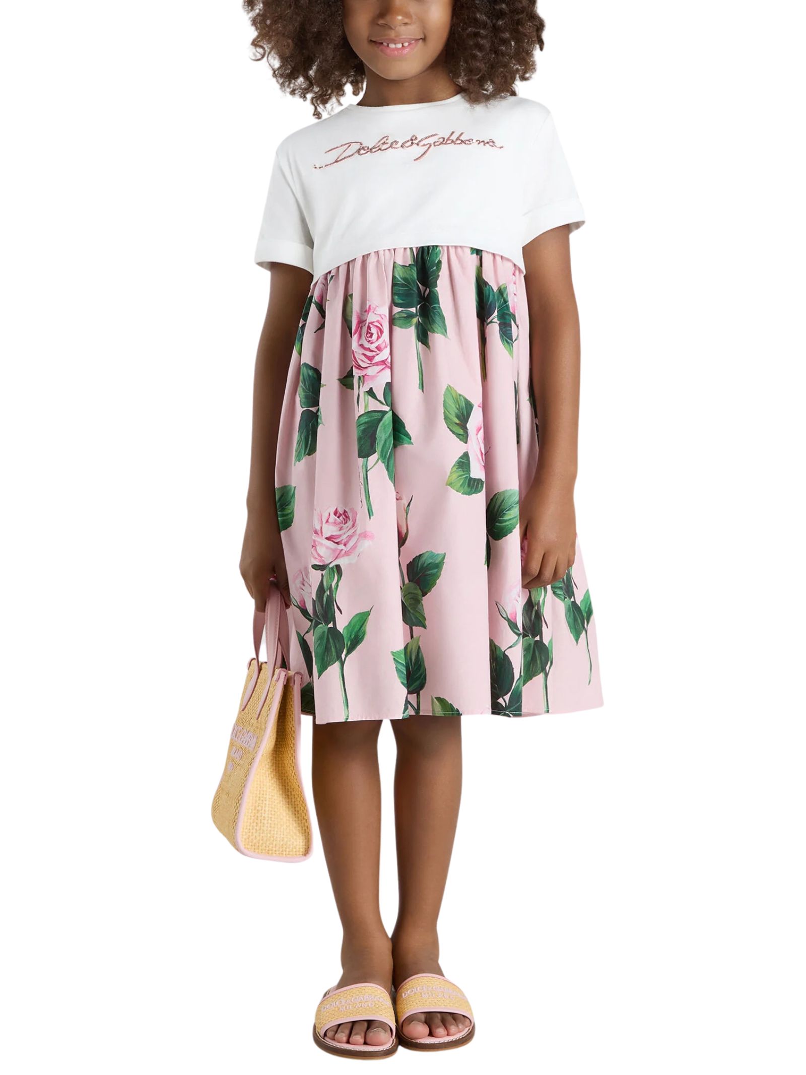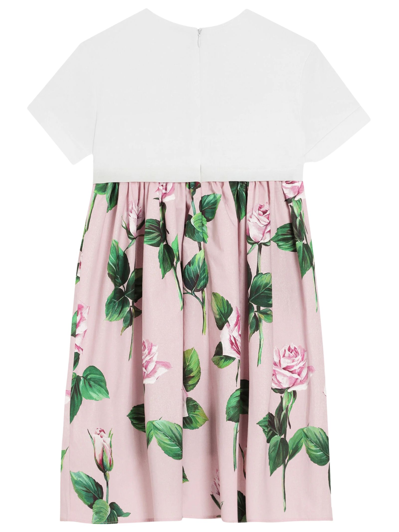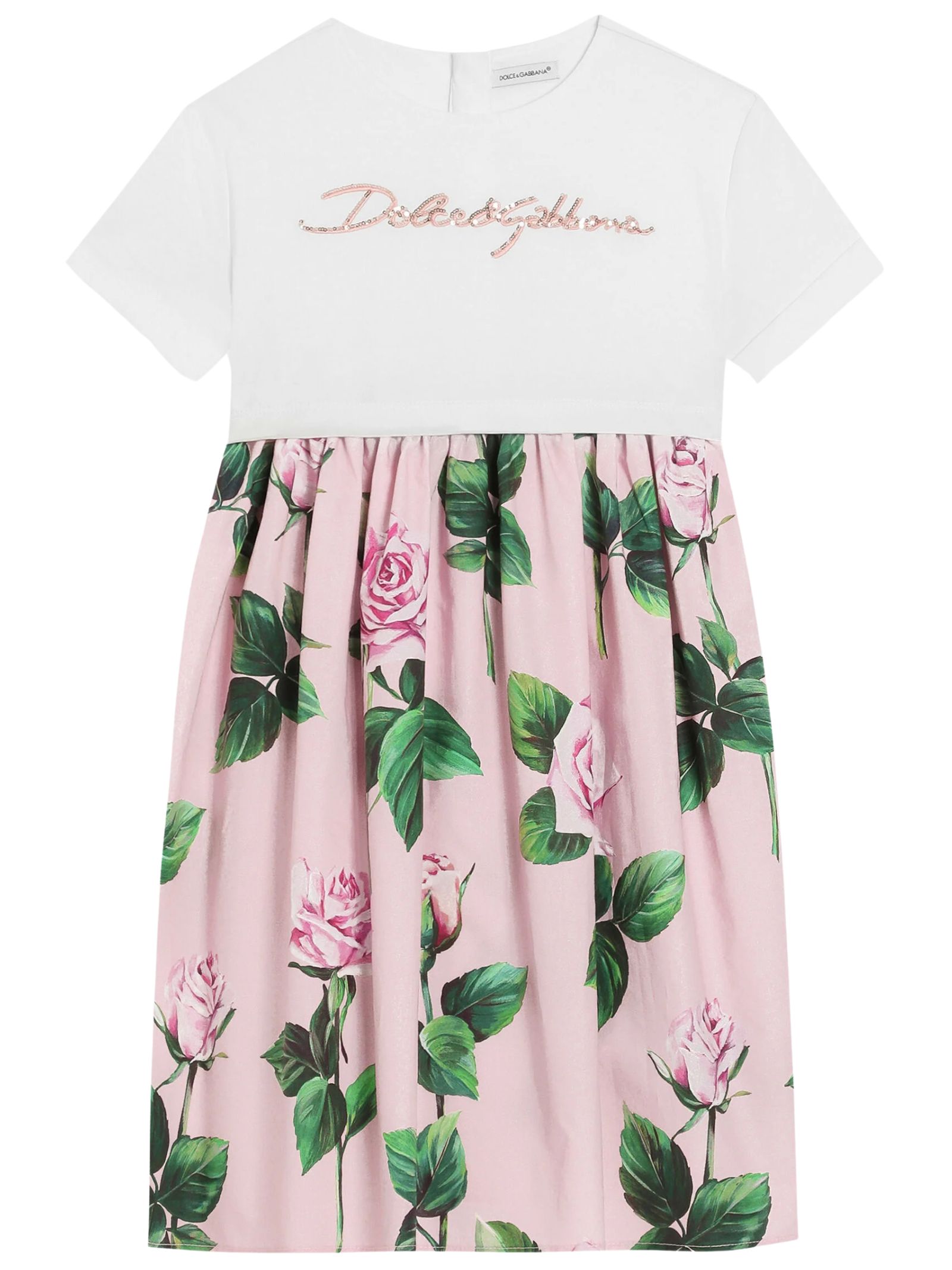 Dolce & Gabbana Kids pink/white dress, crew neck, short sleeves with cuffs, central logo embroidery with sequins, floral print, hidden back zip closure, regular fit. Composition: 100% cotton. Made in Italy.