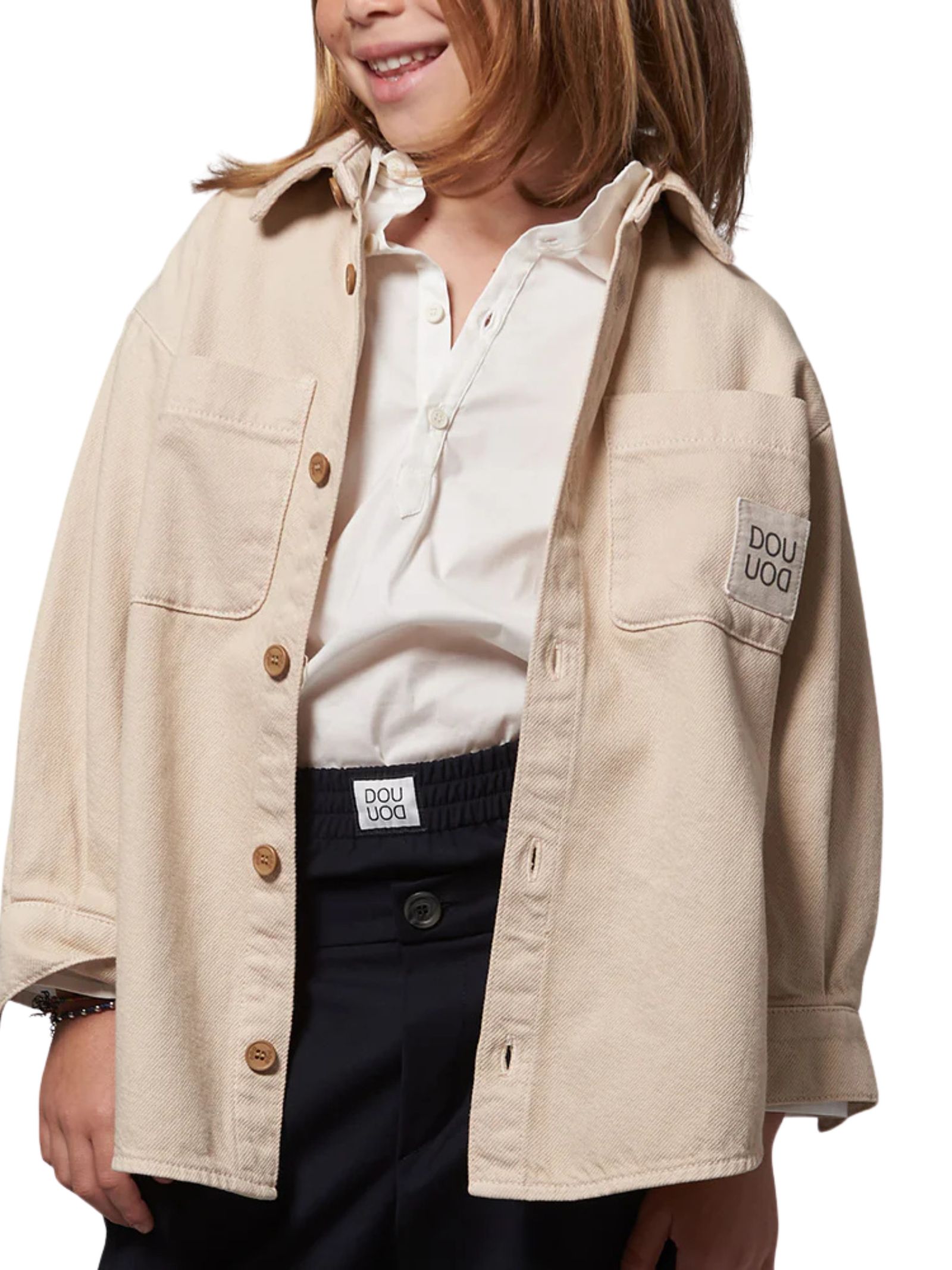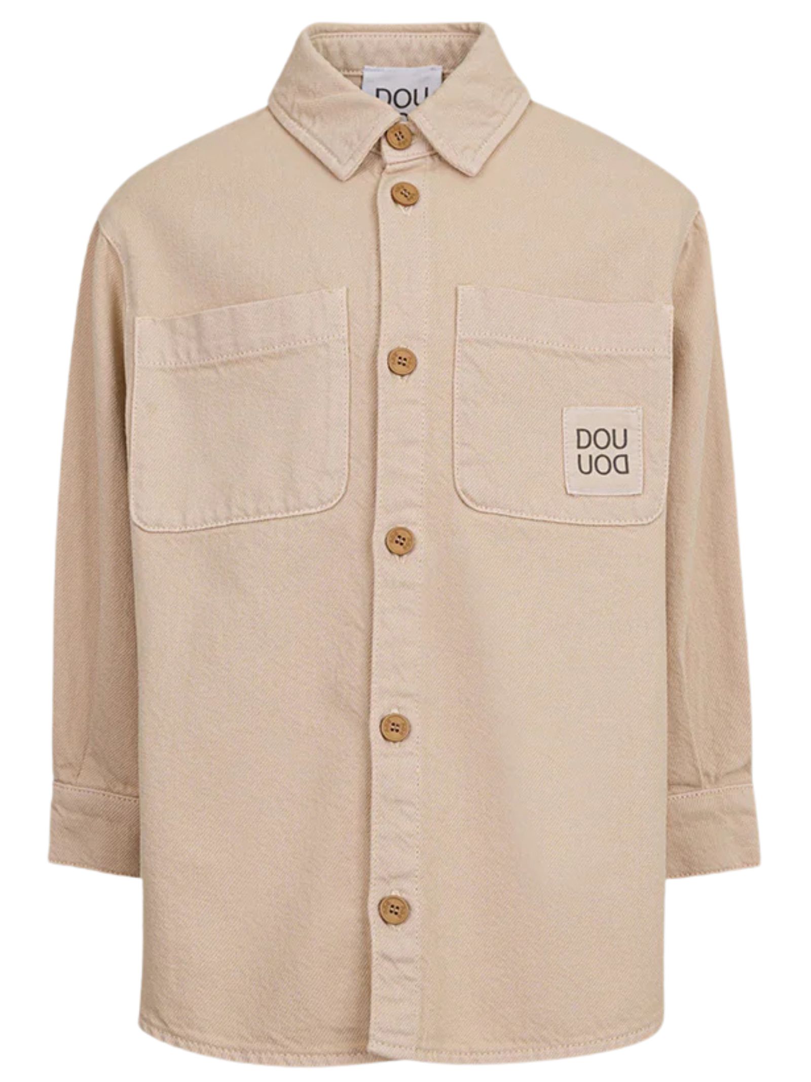 Dou Dou Kids beige denim shirt, long sleeves, button closure, two flap pockets, regular fit. Composition: 100% cotton