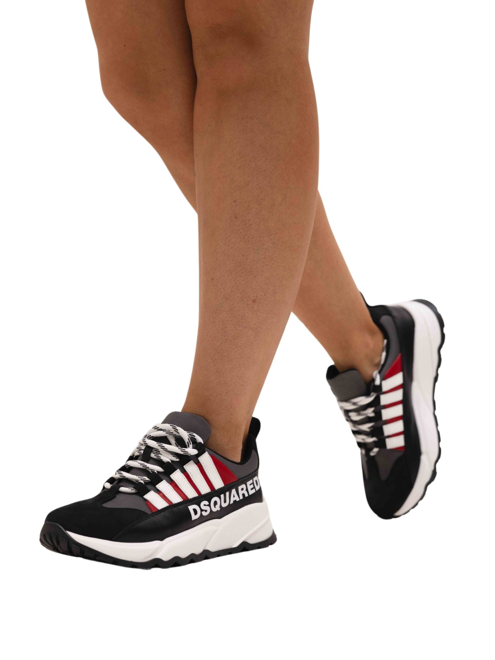 DSQUARED2 Kids black leather shoes, white contrasting side striped inserts, round toe model in suede leather, front lace-up fastening, grey/red contrasting details, padded tongue, side logo, rubber sole and leather insole. Lining: 100% calfskin Exterior: 100% calfskin Sole: 100% rubber. Made in Italy