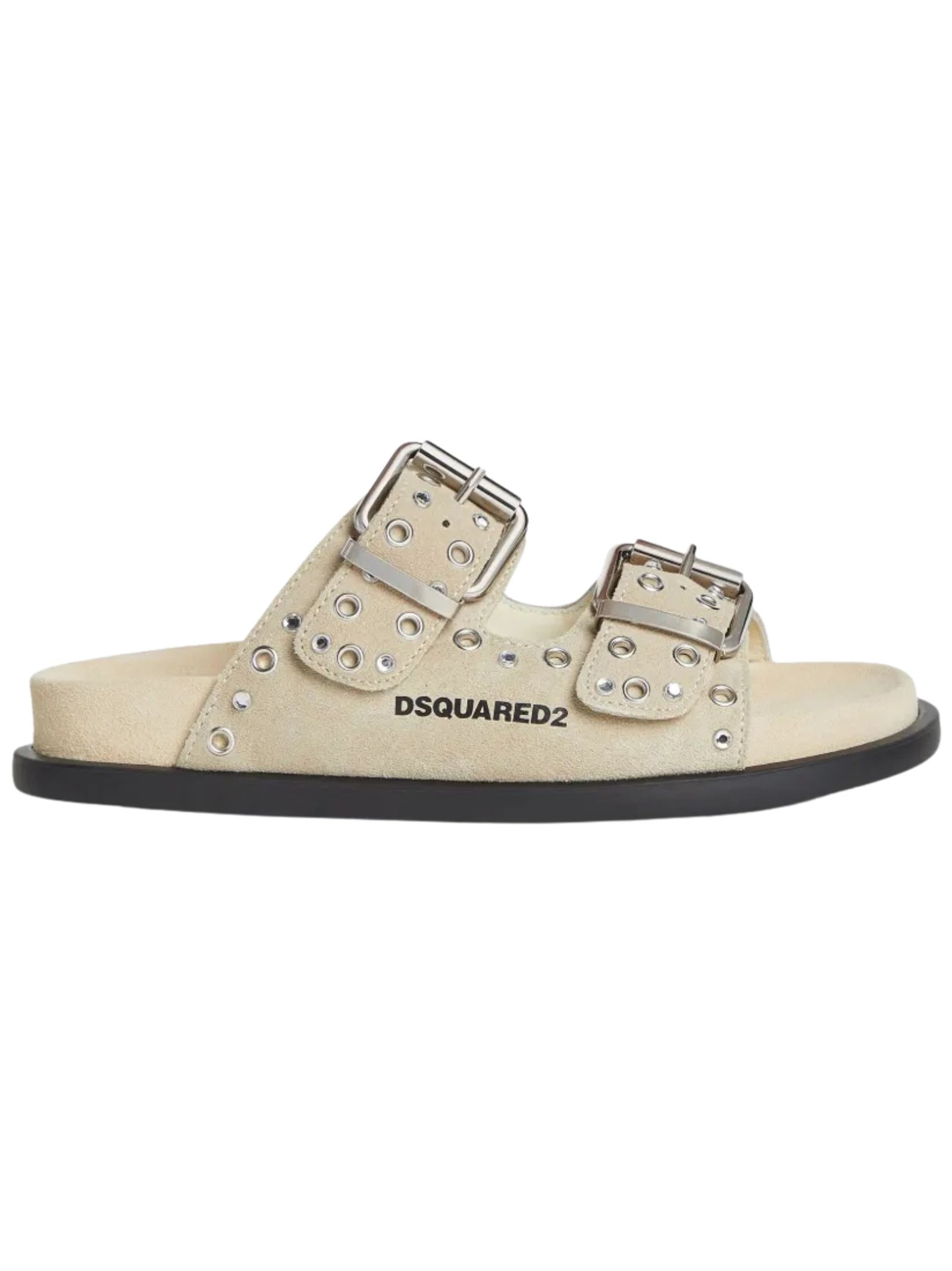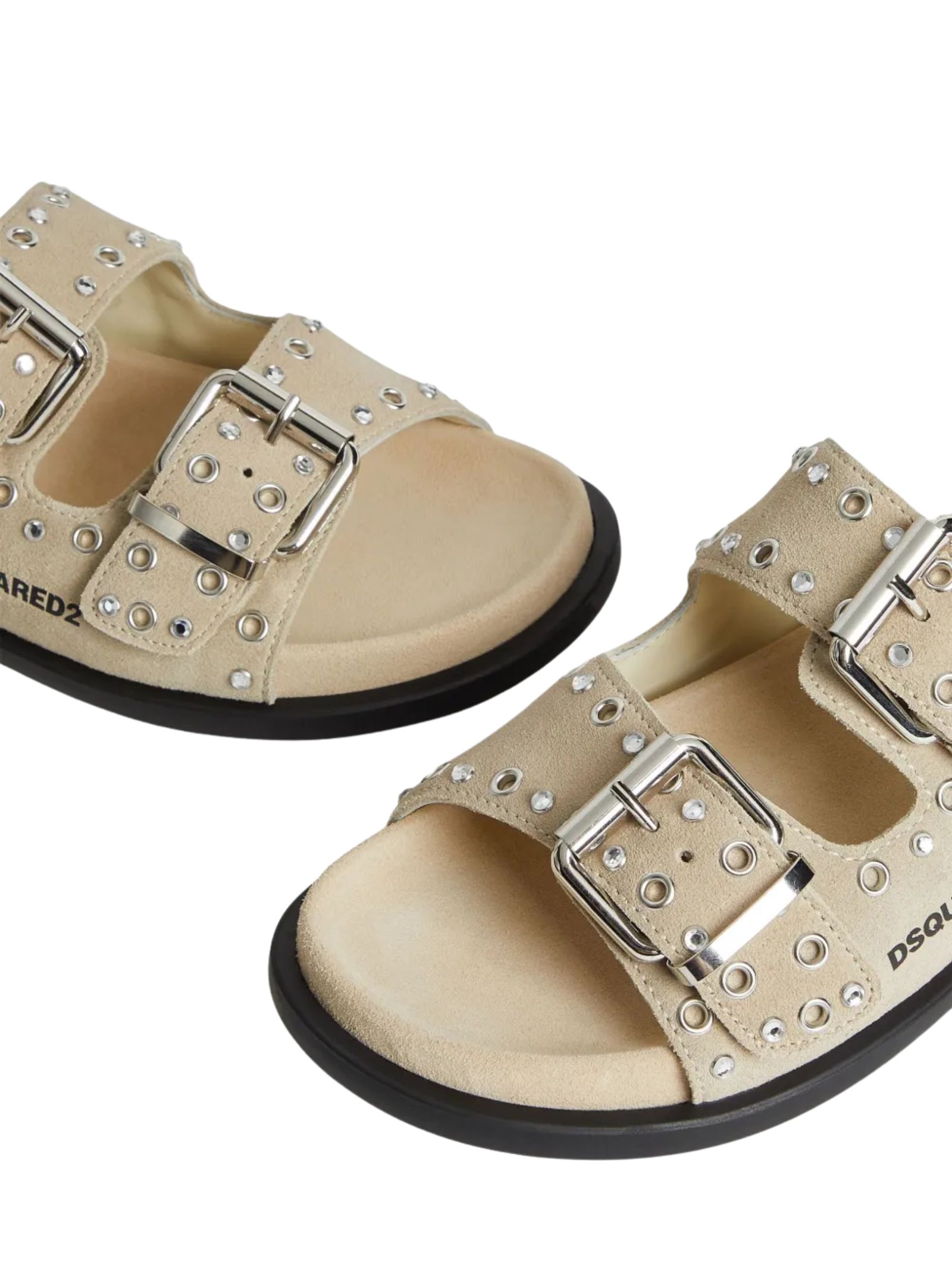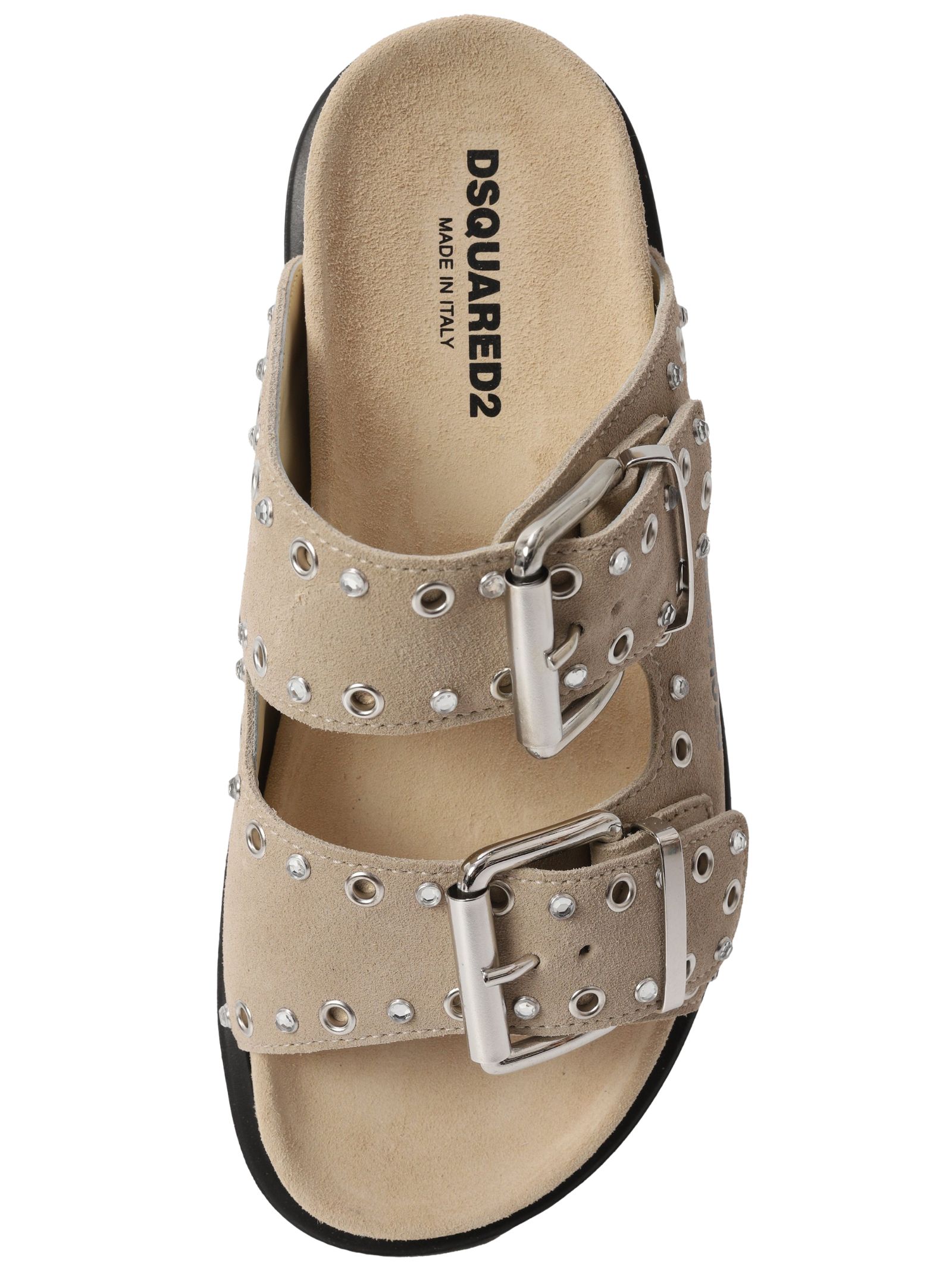 Dsquared2 Kids sand-colored slides, suede, rhinestone appliqués, side buckle closure, slip-on design, flat rubber sole, logo insole. Sole: 100% rubber. Lining: 100% calfskin. Exterior: 100% calfskin. Made in Italy
