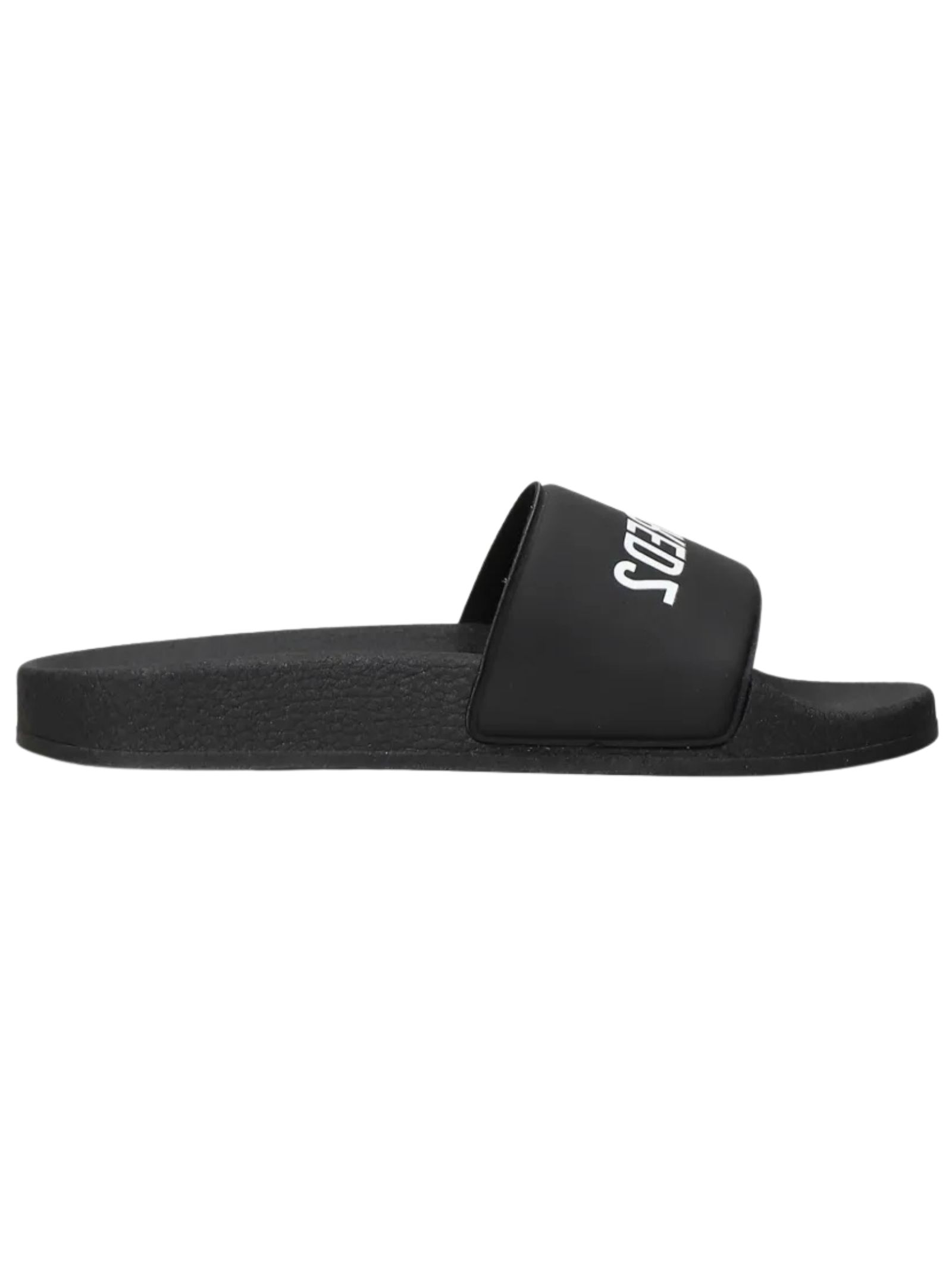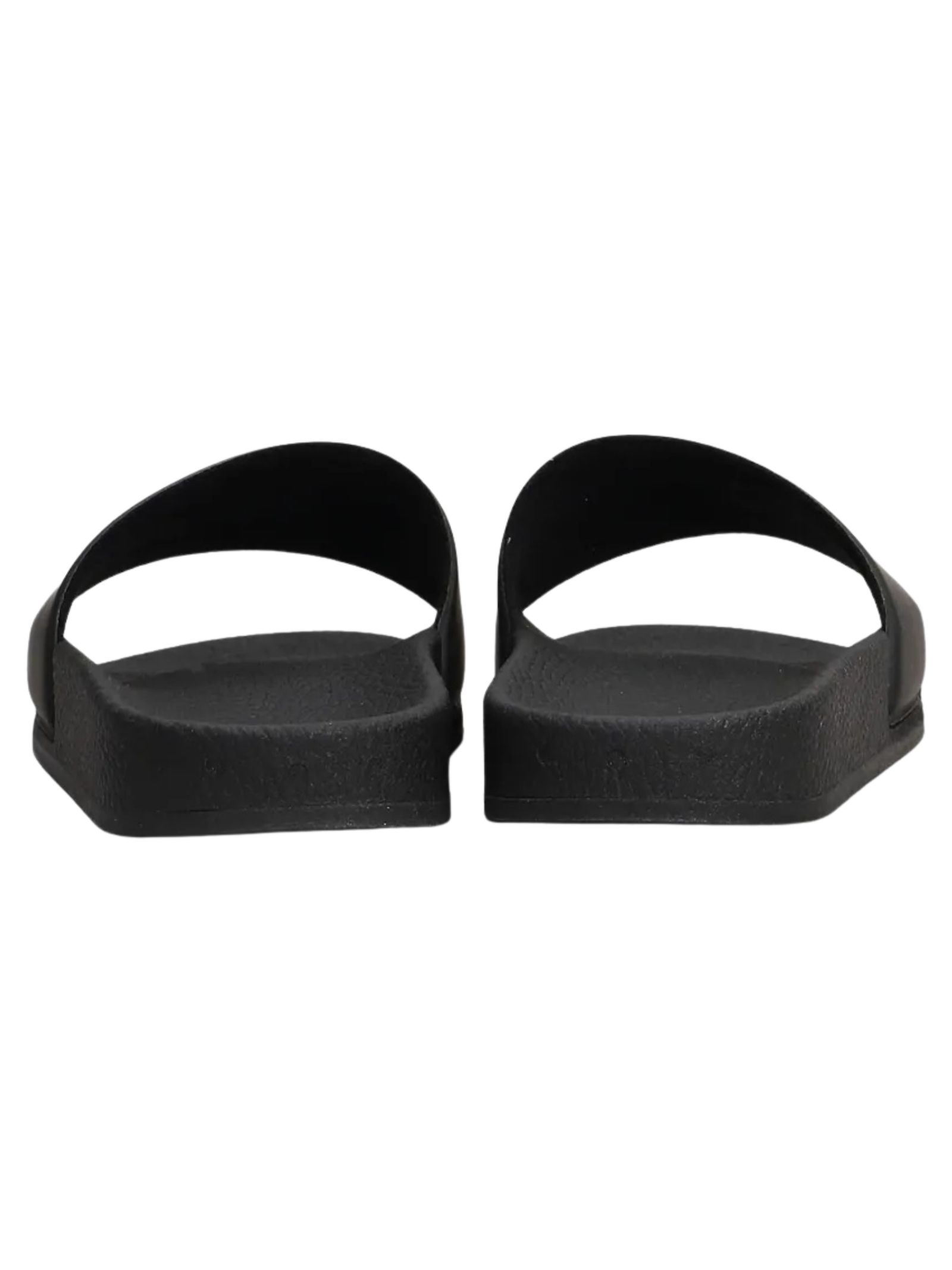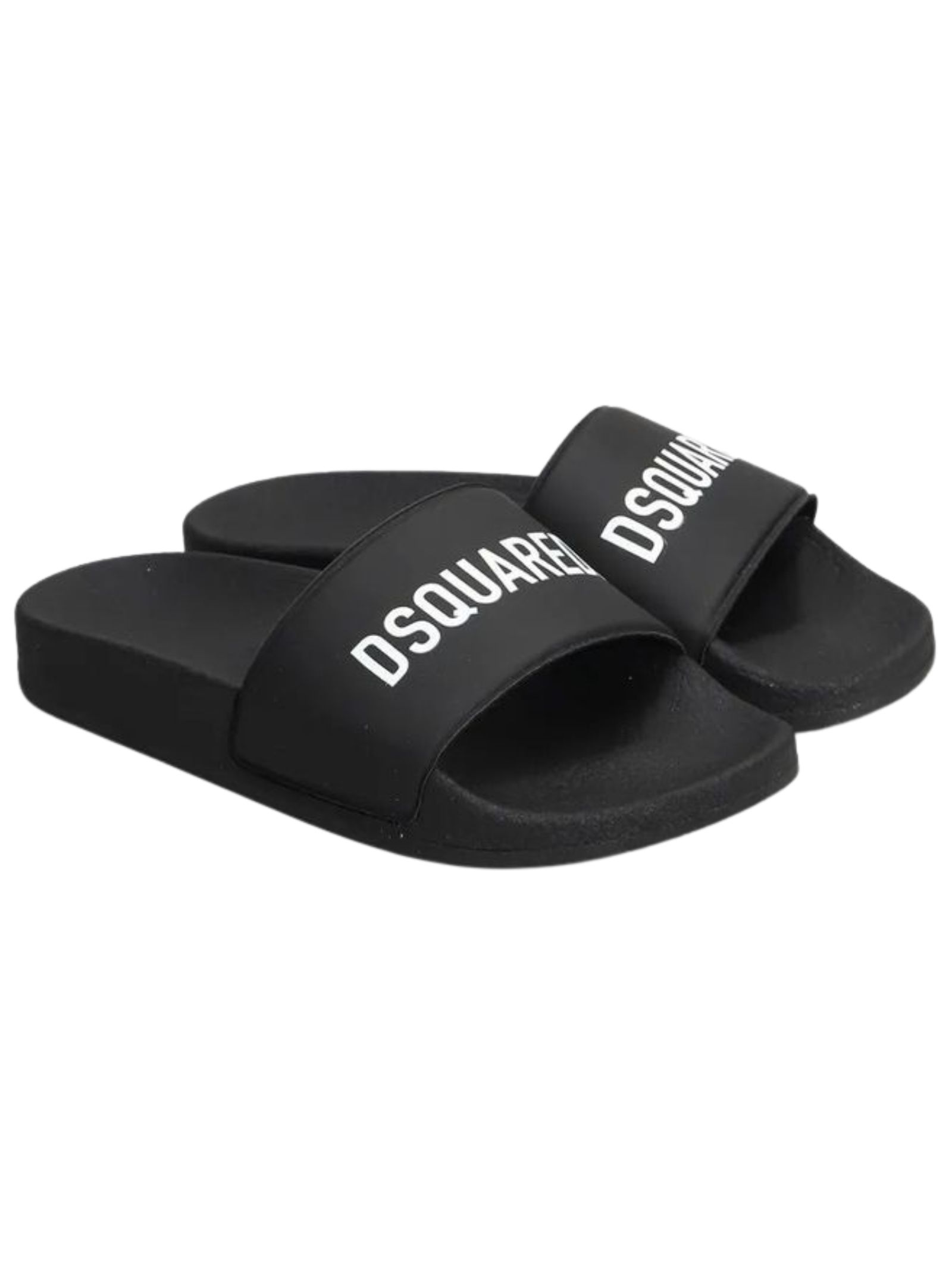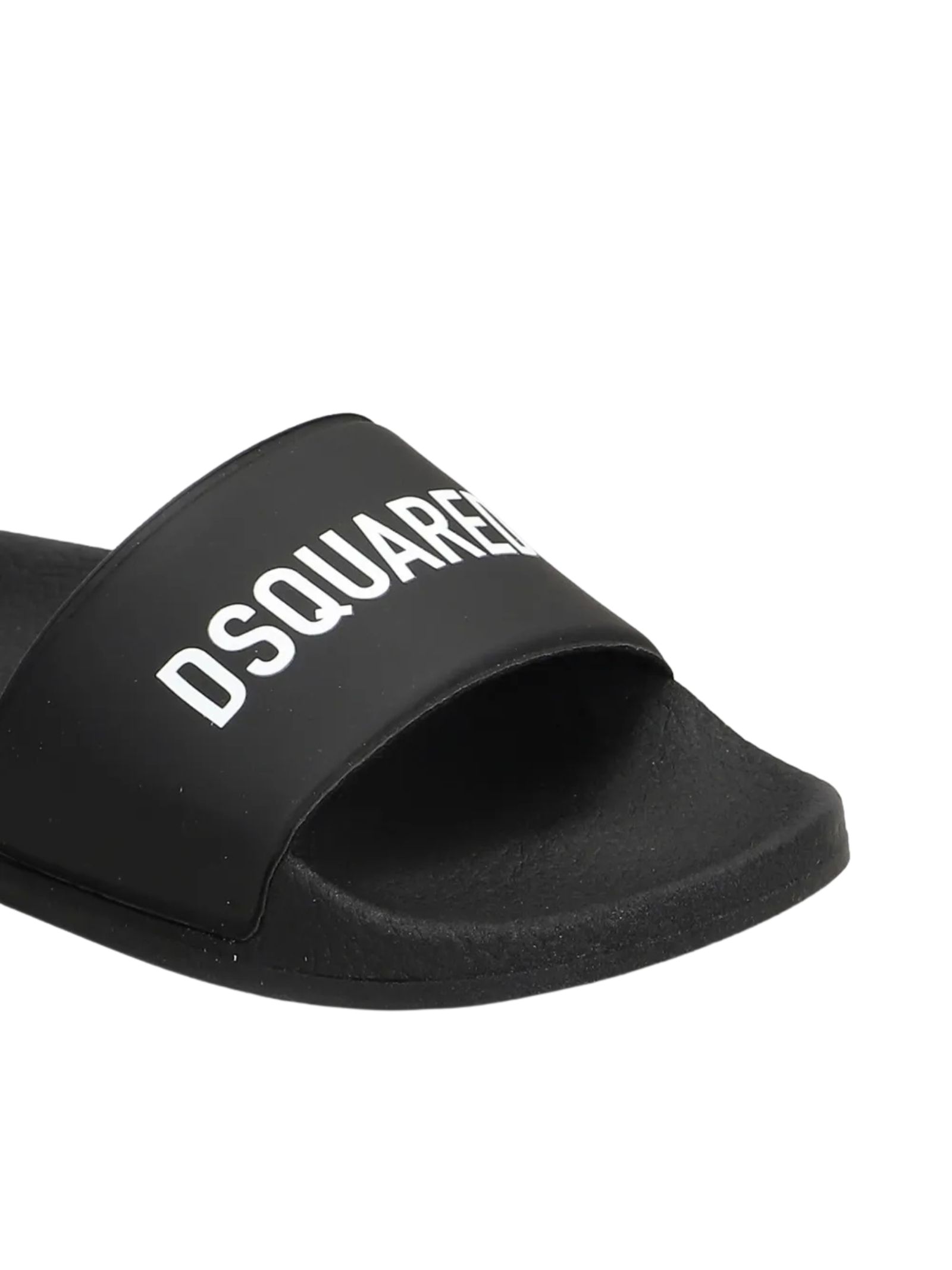Dsquared2 Kids black slides with an open toe, a contrasting white logo band, a slip-on design, a contoured footbed, and a flat rubber sole. Material: 100% PVC. Made in Italy.