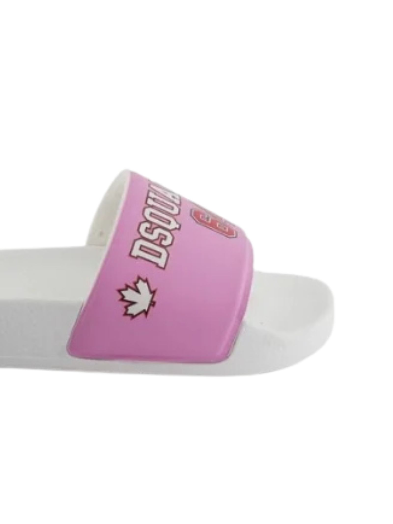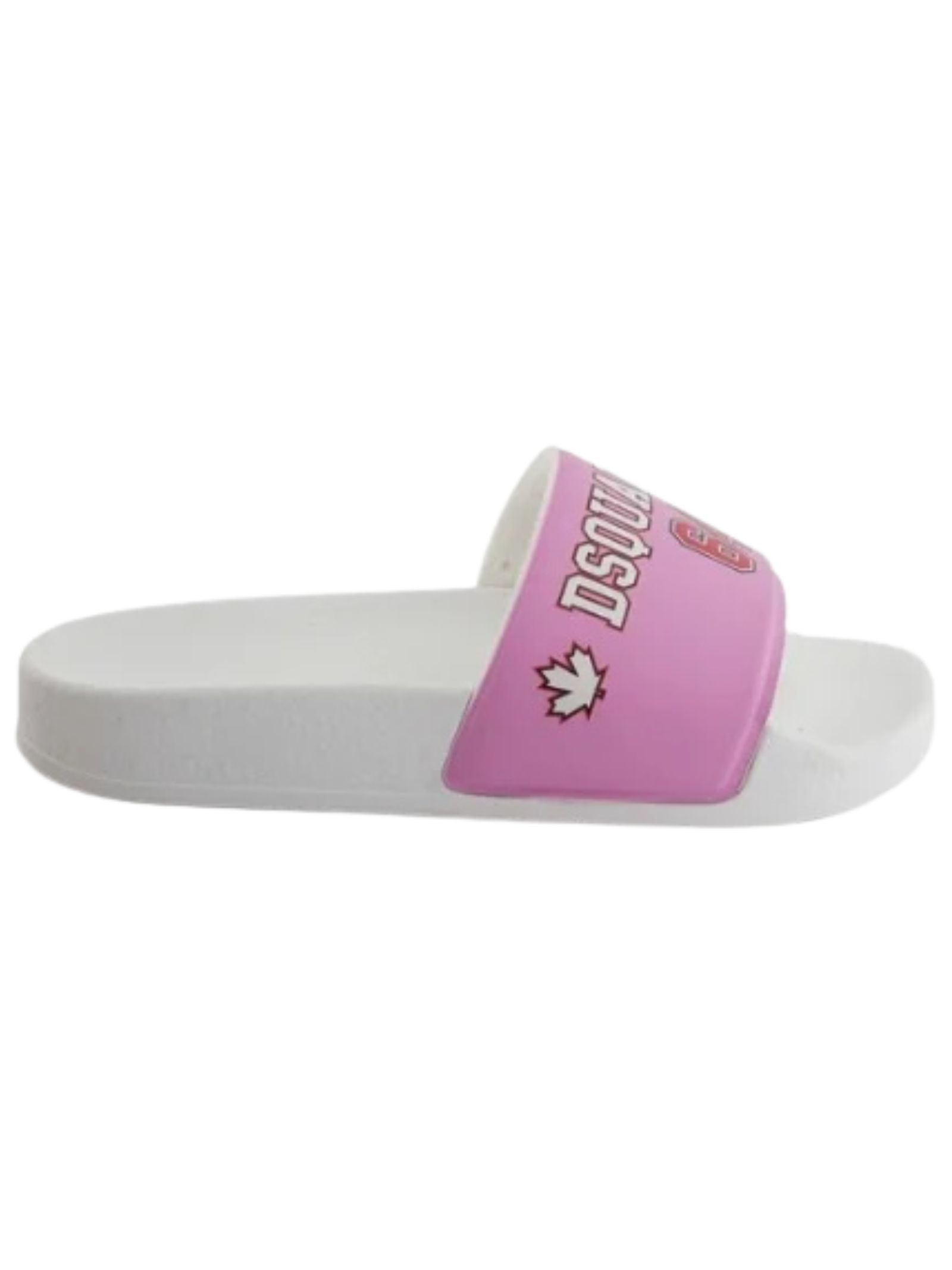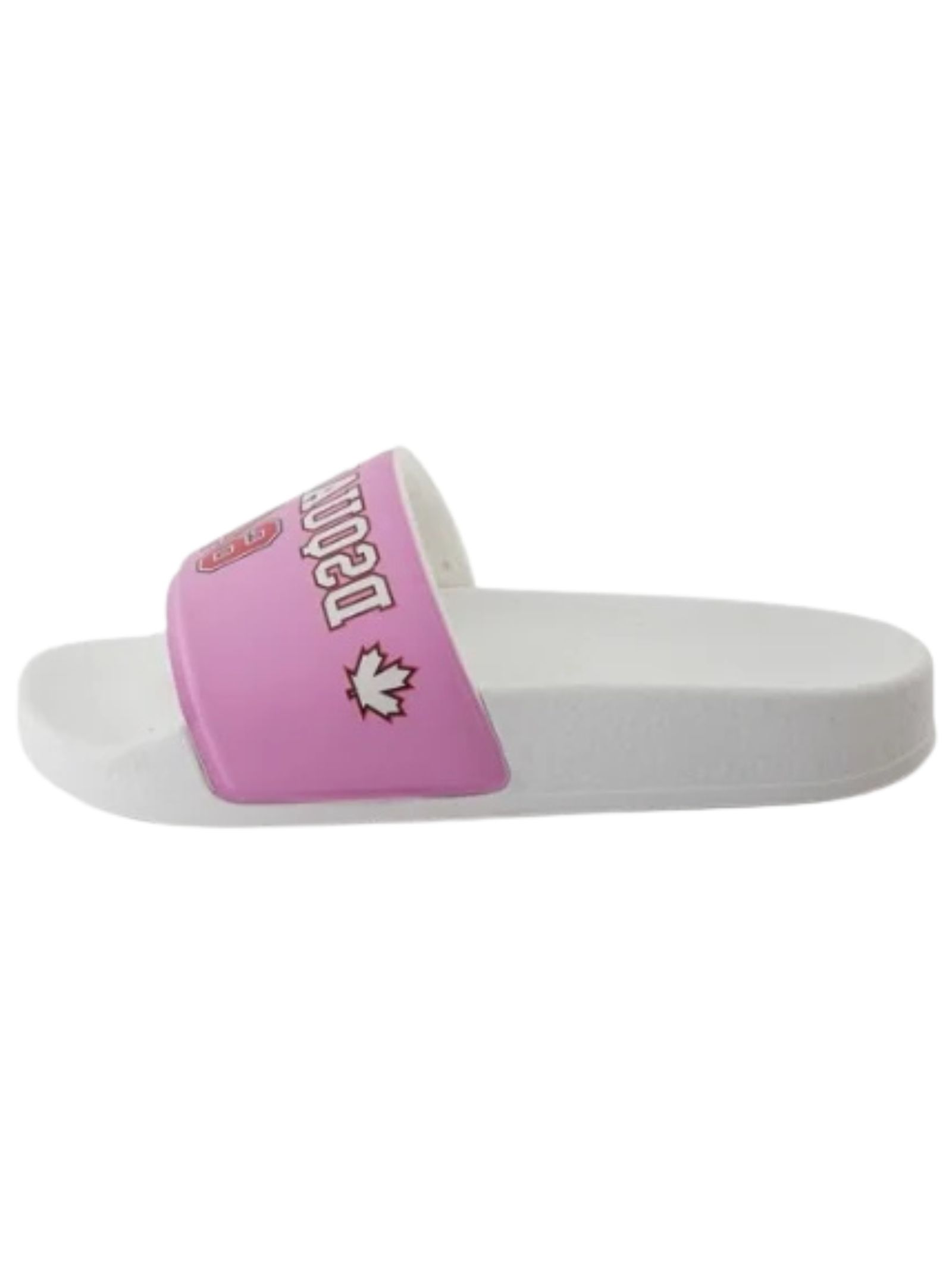 Dsquared2 Kids pink slides with an open toe, contrasting white/red logo band, slip-on design, contoured footbed, and flat rubber sole. Material: 100% PVC. Made in Italy.