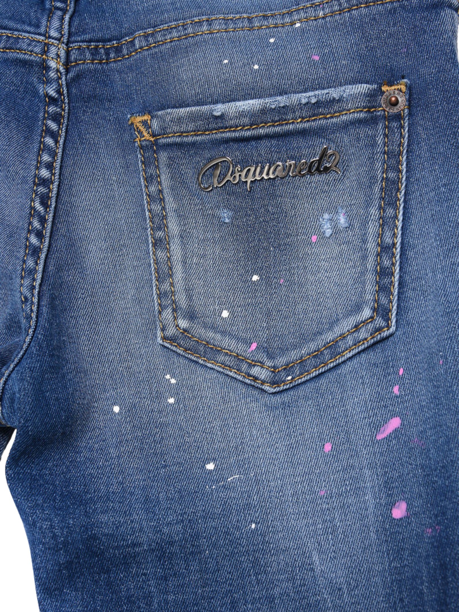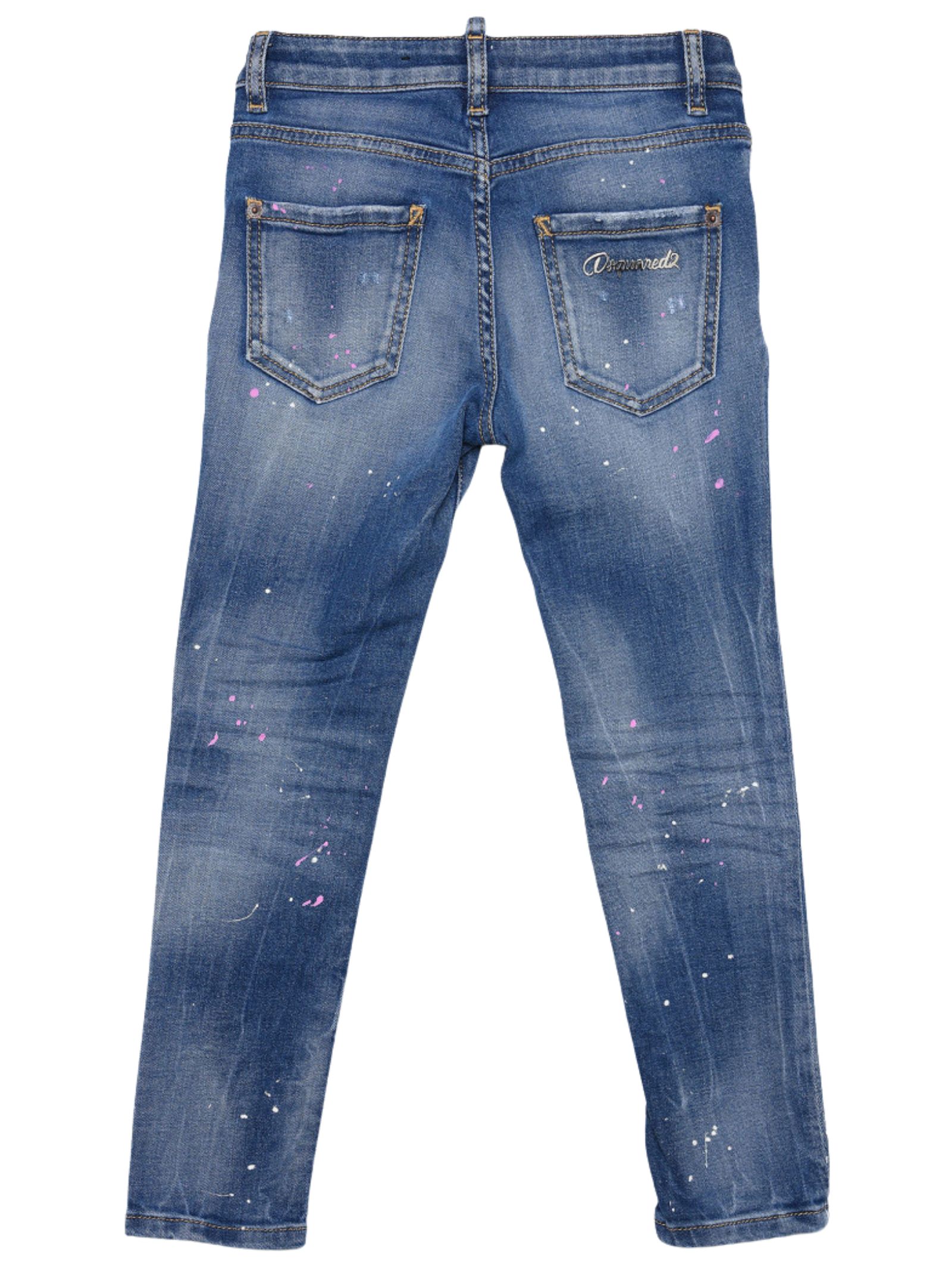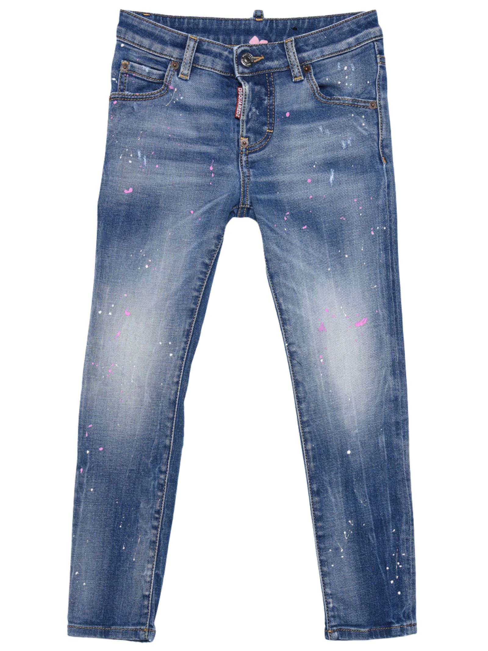Dsquared Kids blue jeans, Cool Girl model with a straight fit, made of light denim, characterized by a bleached marbled effect with pink/white shades and contrasting whiskering, design characterized by ergonomic visible stitching, metal logo on the back, slim fit. Composition: 98% Cotton 2% Elastane
