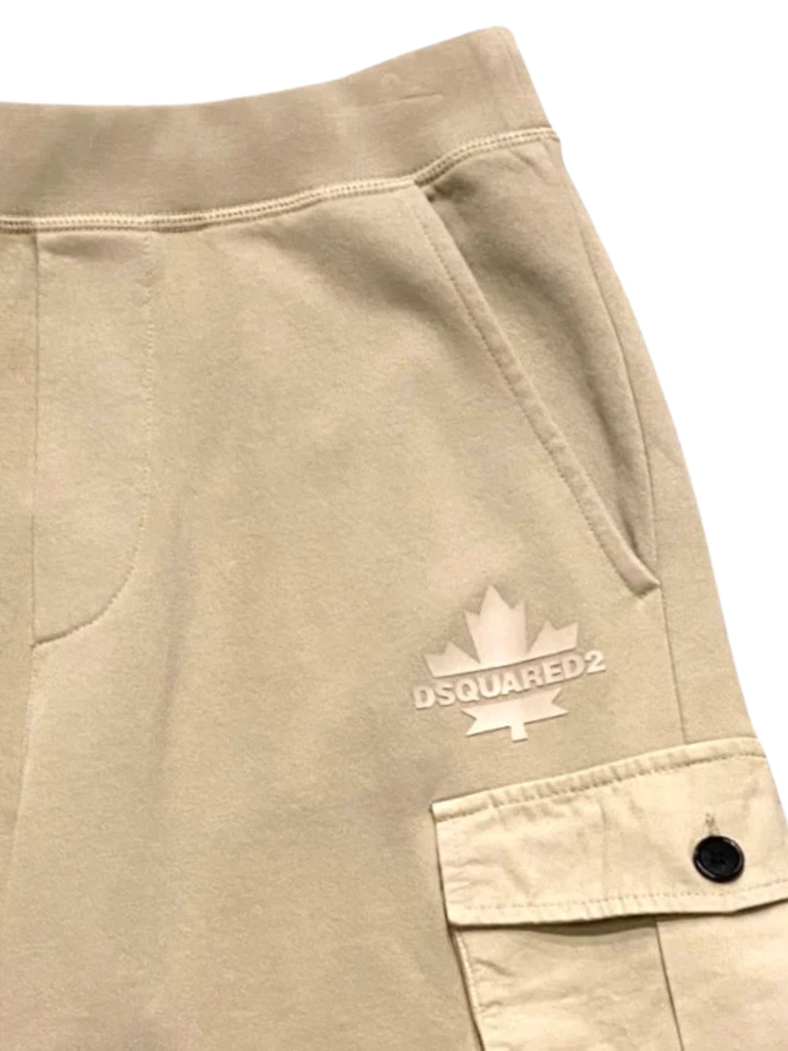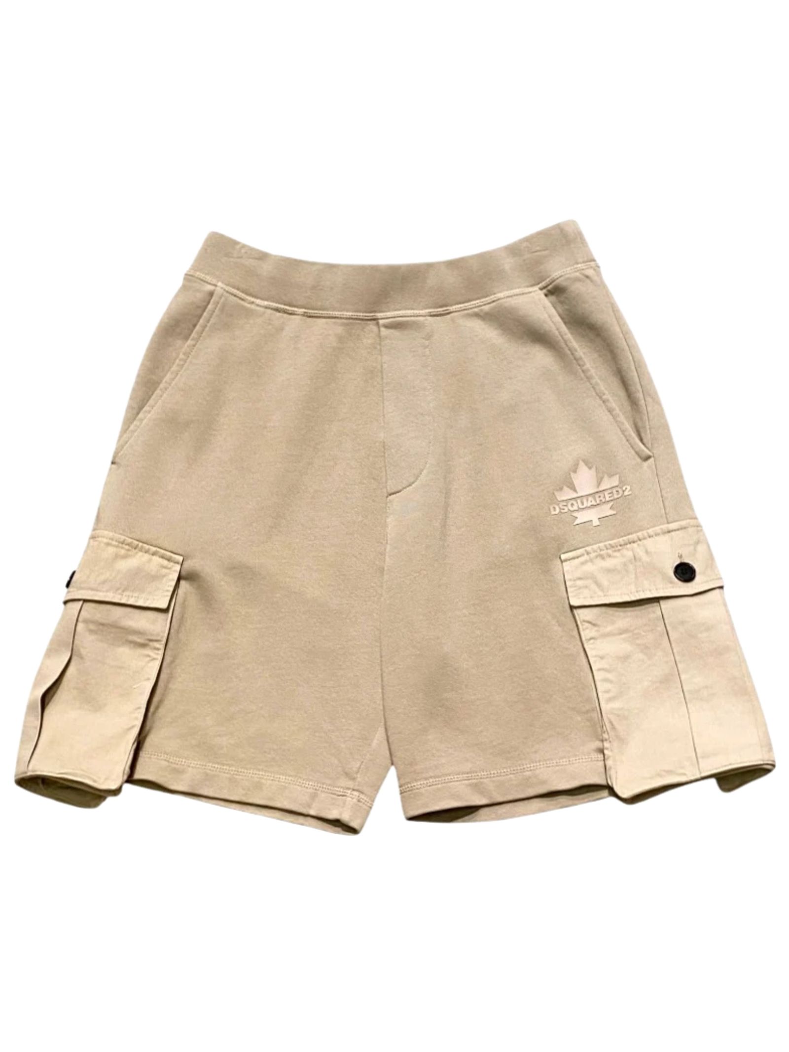 Dsquared2 Kids sand-colored Bermuda shorts, made of lightweight cotton, two side welt pockets, large pockets with side cotton canvas buttons, elastic waistband with internal drawstring, matching rubber logo, regular fit. Composition: 100% cotton