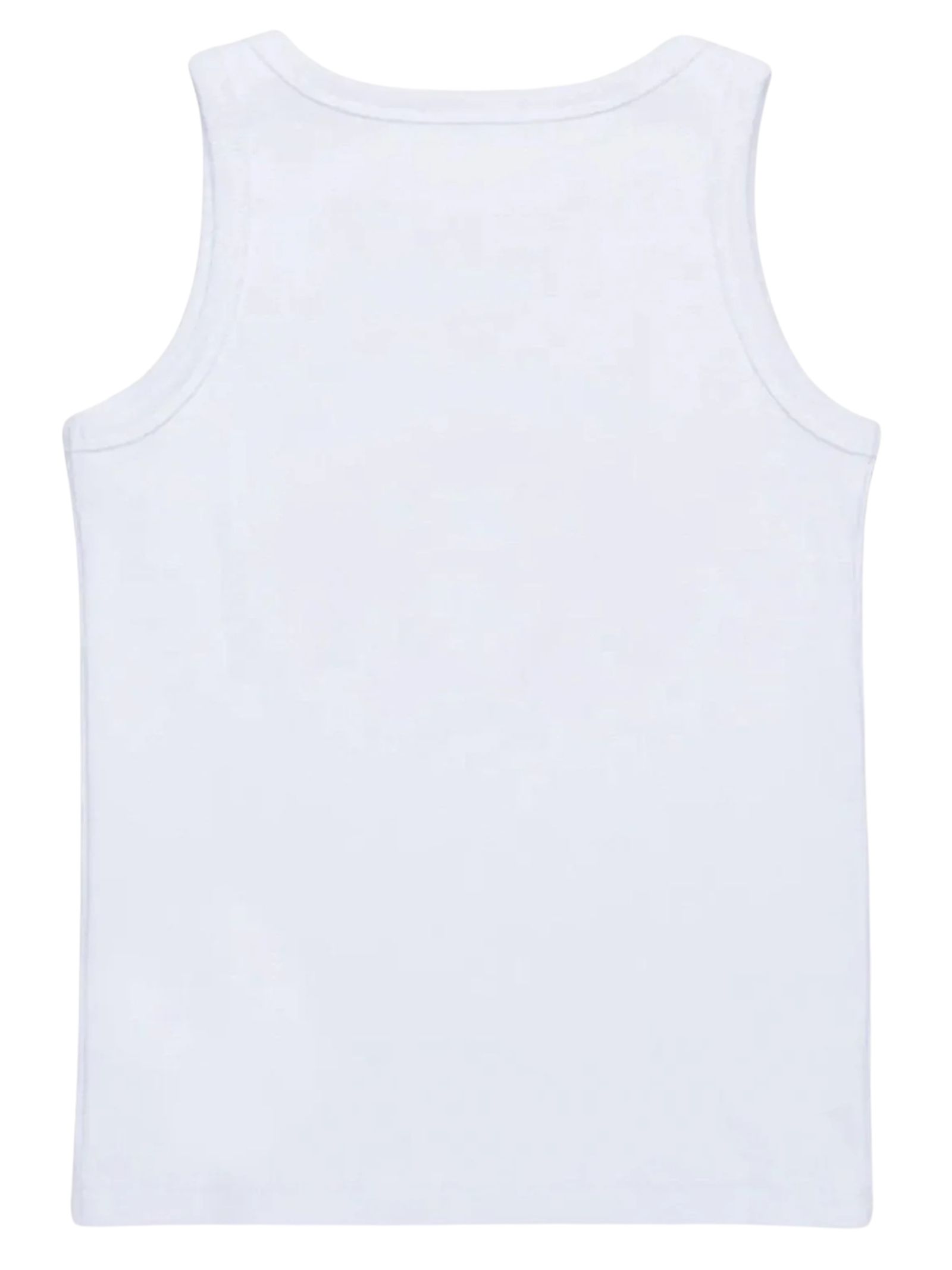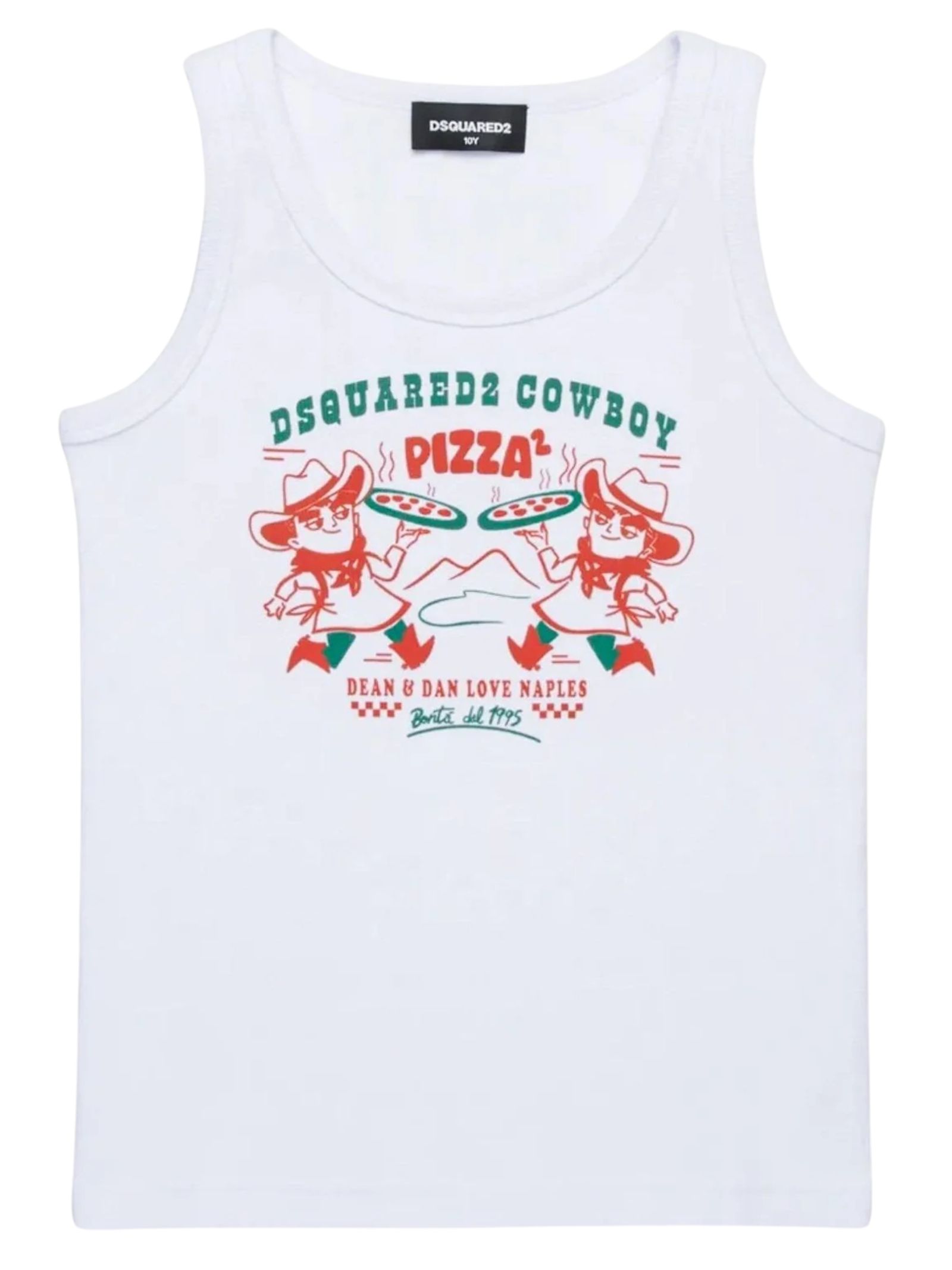Dsquared2 Kids white tank top in ribbed stretch cotton jersey, with a comfortable, fitted design, decorated with the original "Cowboy Pizza" graphic on the front, inspired by an exclusive Dsquared2 event at a historic pizzeria in Naples, a versatile garment that fits perfectly on children, teenagers, and women. Composition: 100% cotton