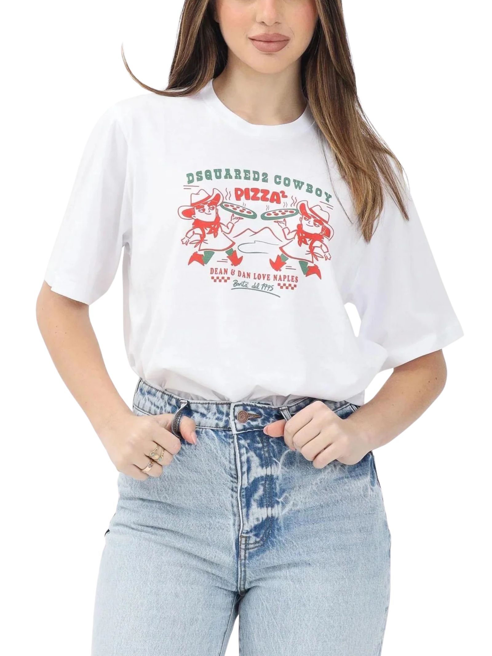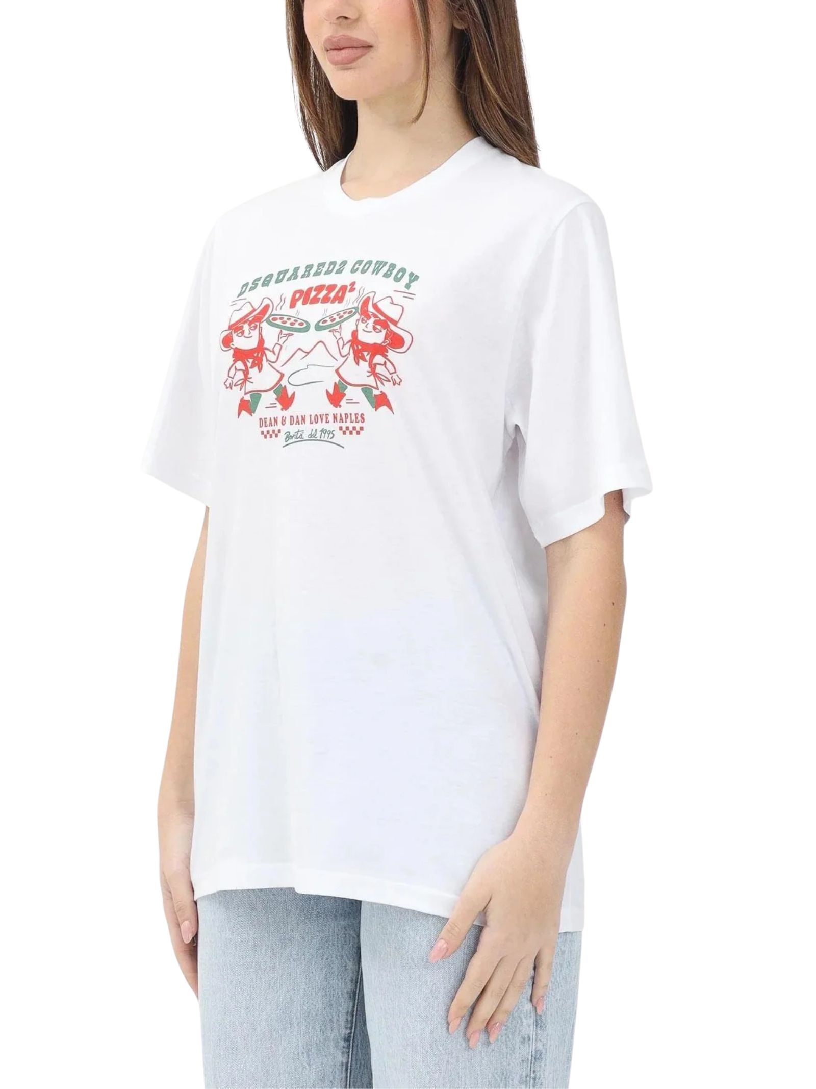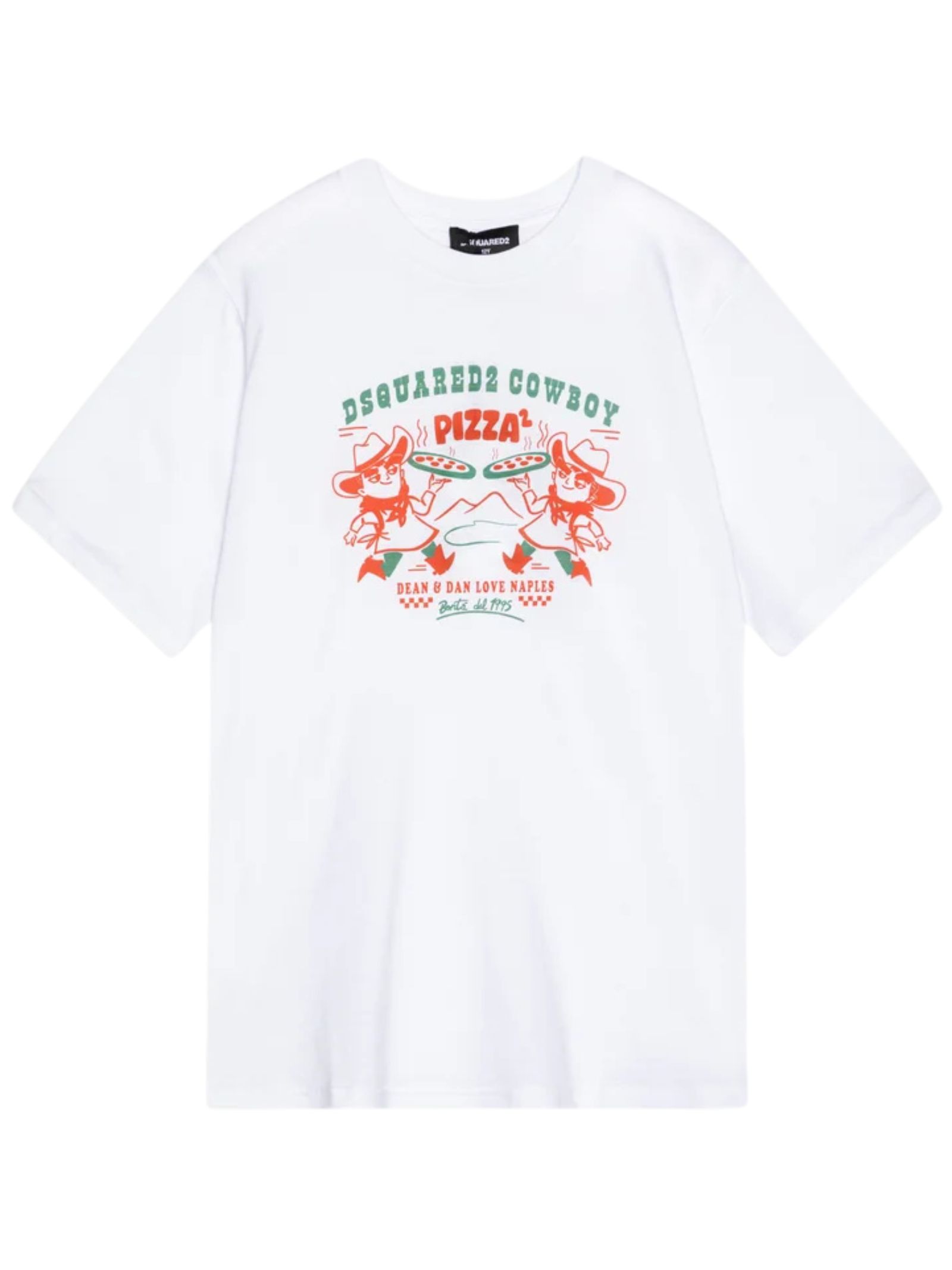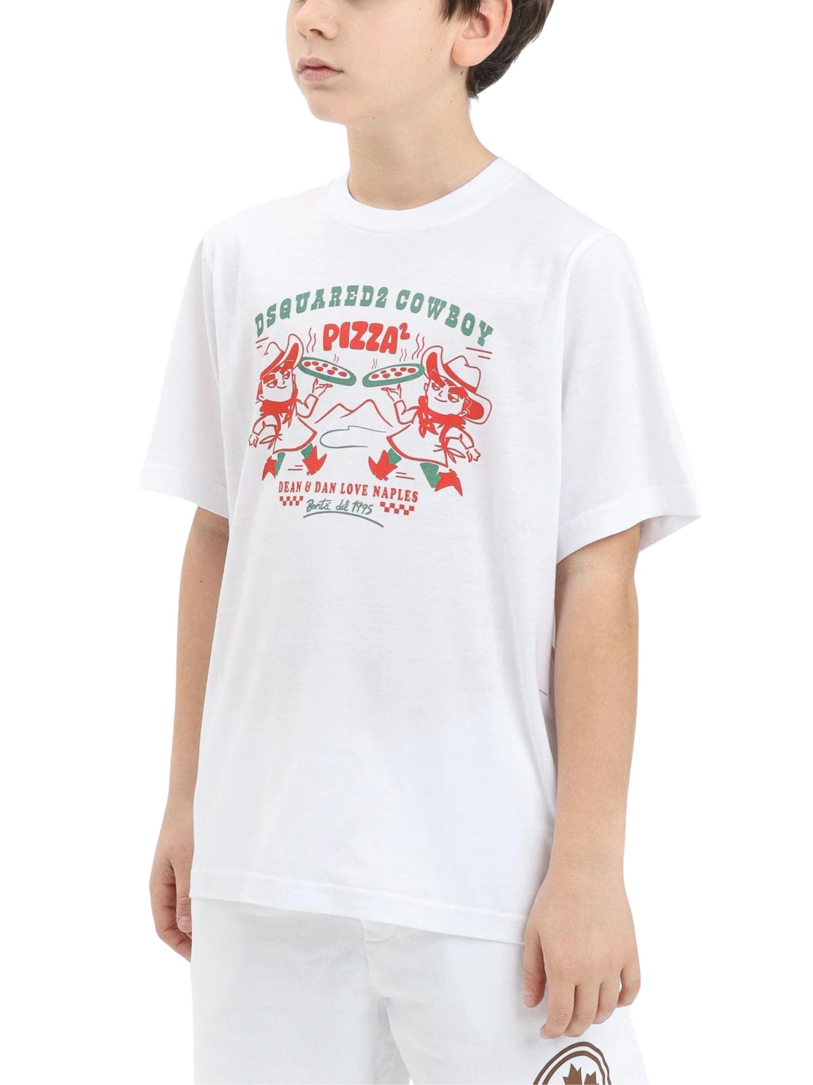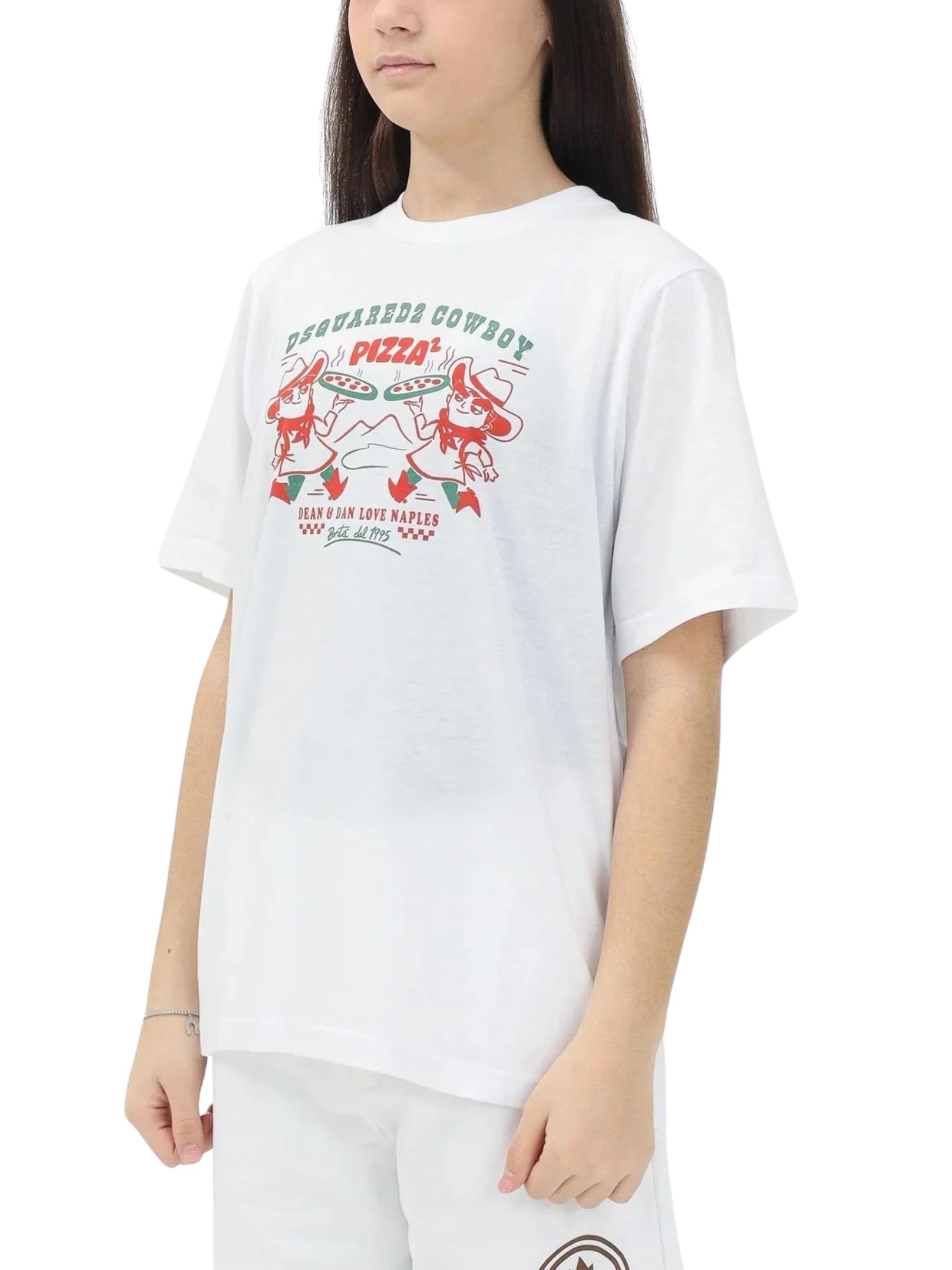 Dsquared2 Kids white T-shirt, crew neck, short sleeves, decorated with the original "Cowboy Pizza" graphic on the front, inspired by an exclusive Dsquared2 event at a historic pizzeria in Naples, a versatile garment that fits perfectly on children, teenagers and women, regular fit. Composition: 100% cotton