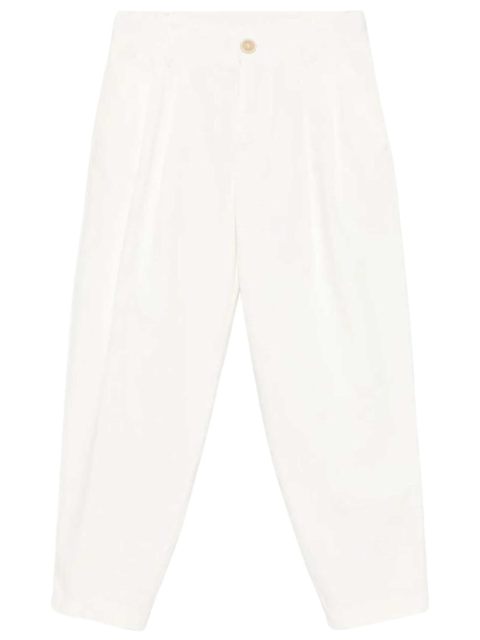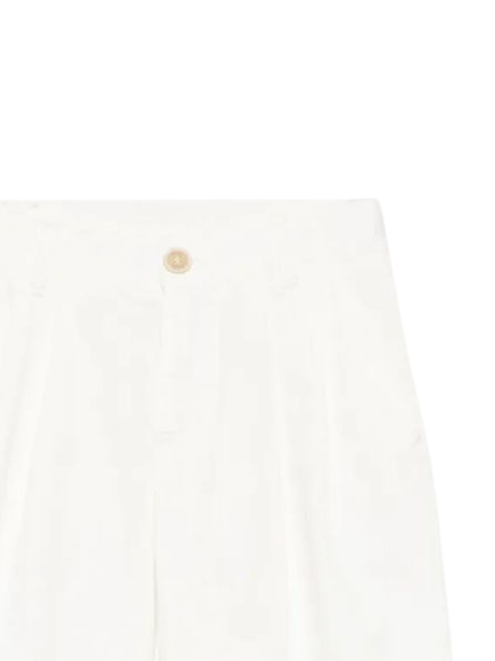 Eleventy Milano Kids white trousers made of linen and cotton, featuring a regular waist, belt loops, two side pockets, two back pockets with flaps and buttons, a logo patch on the back, and a regular fit. Composition: 75% cotton, 23% linen, 2% elastane.