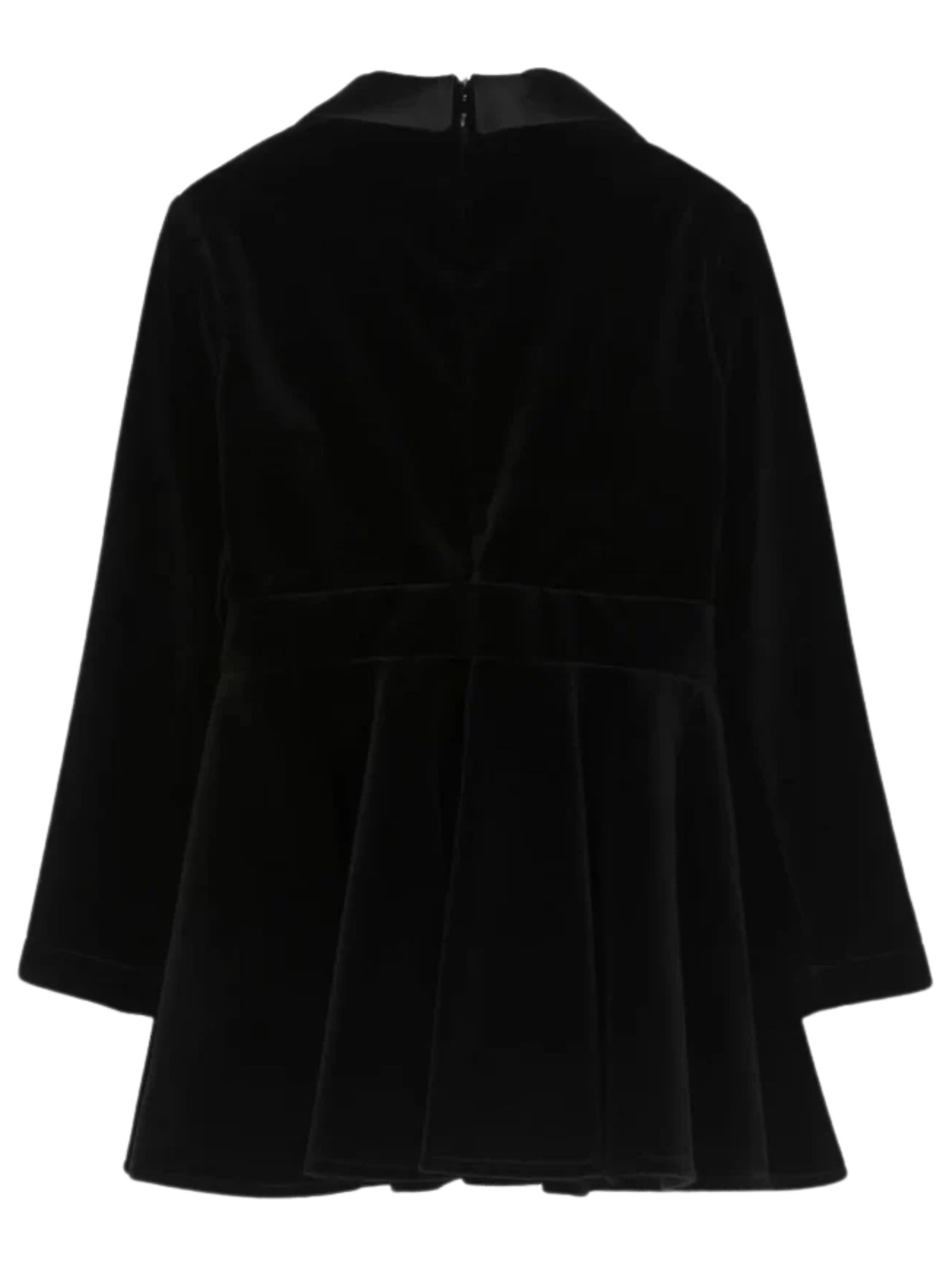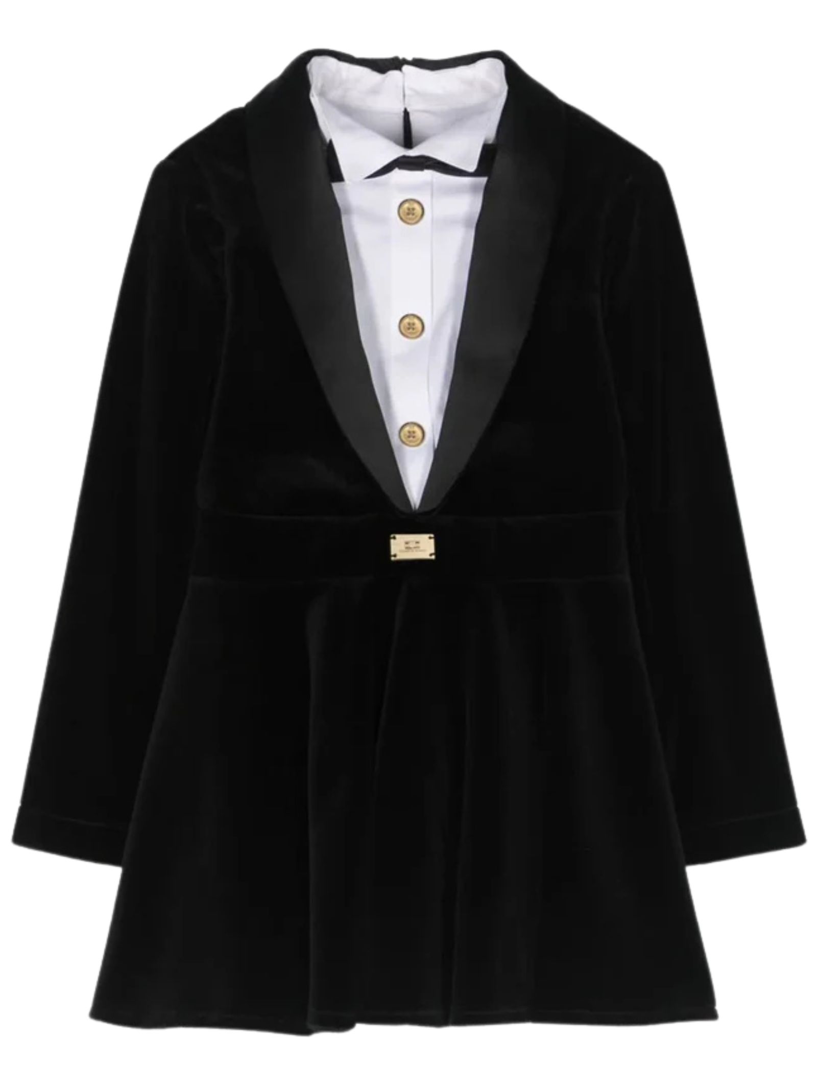 Elisabetta Franchi Kids black/white dress, made of soft velvet-effect cotton, blazer style, classic collar, shawl lapel, bow tie detail, long sleeves, gold-colored buttons, logo plaque on the waist, pleated skirt, flared hem, above-the-knee length. Composition: 99% cotton 1% elastane. Made in Italy