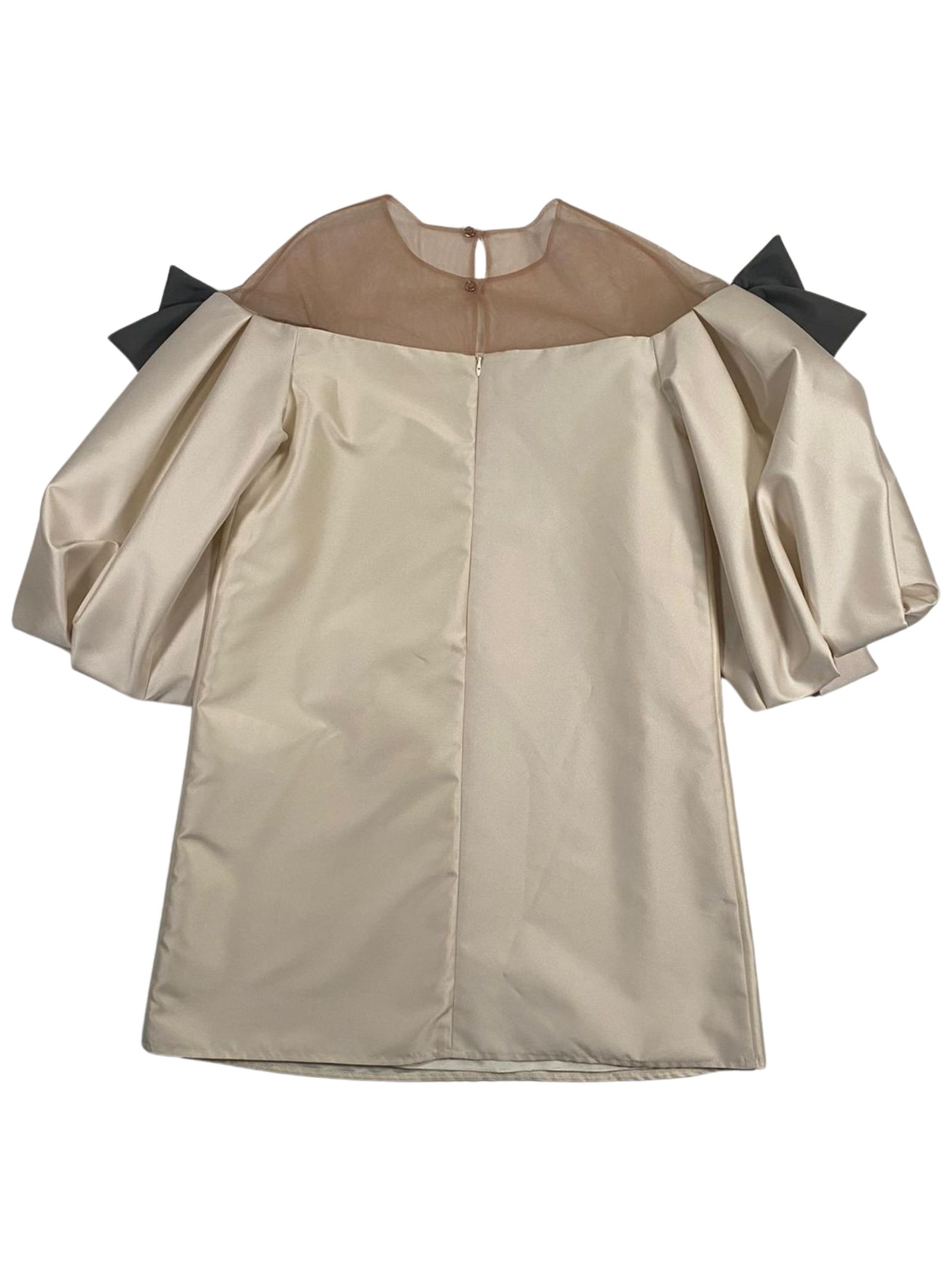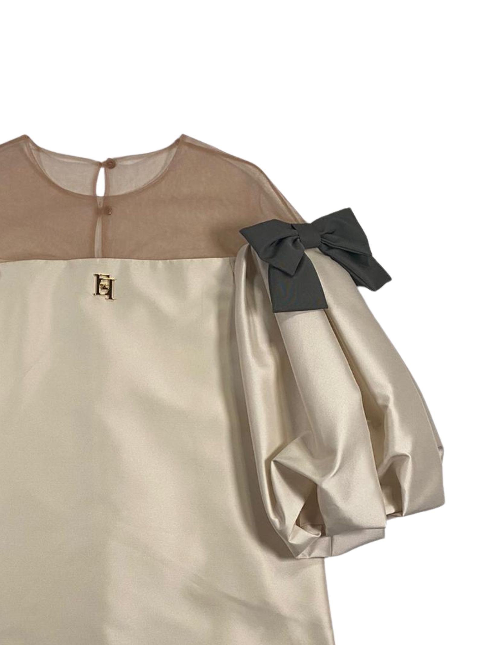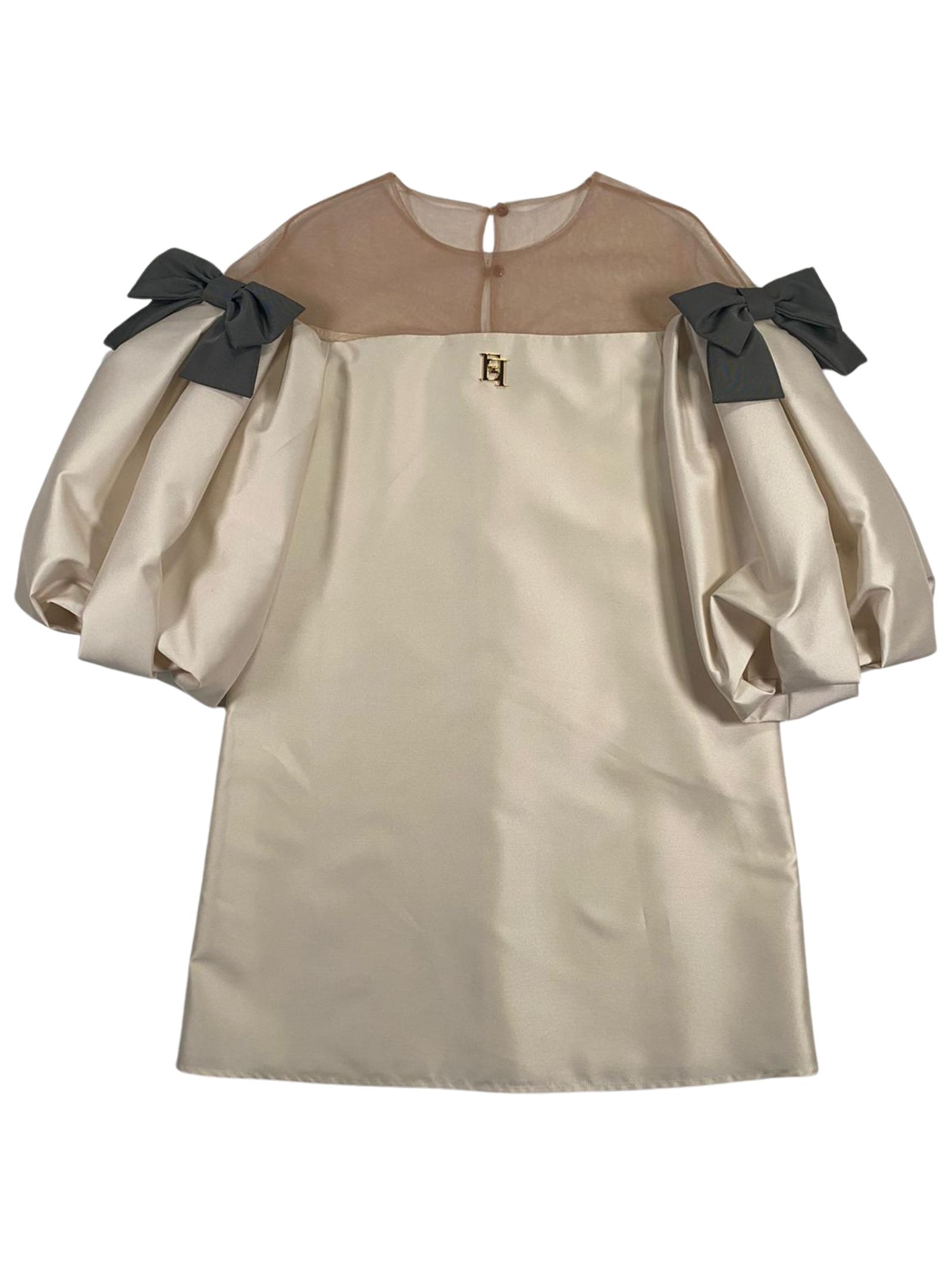 Elisabetta Franchi Kids butter-colored dress with contrasting voile insert, puff sleeves, side bow appliqués, central logo appliqué, and back opening. Composition: 100% polyester. Lining: 67% viscose, 33% polyester. Made in Italy.