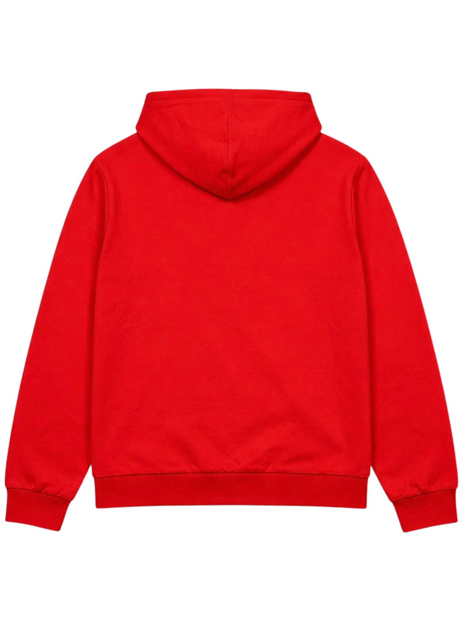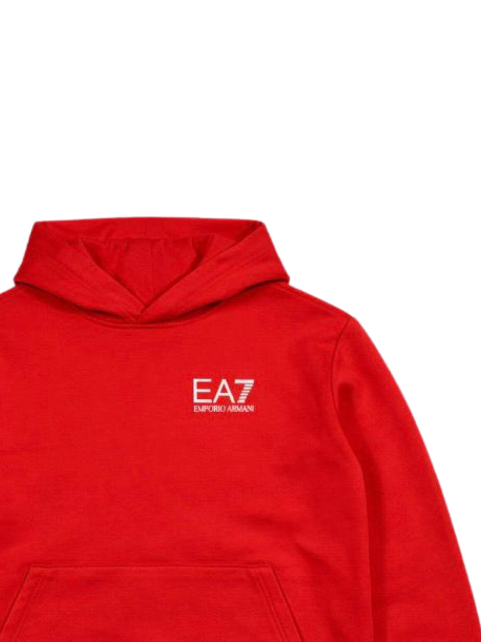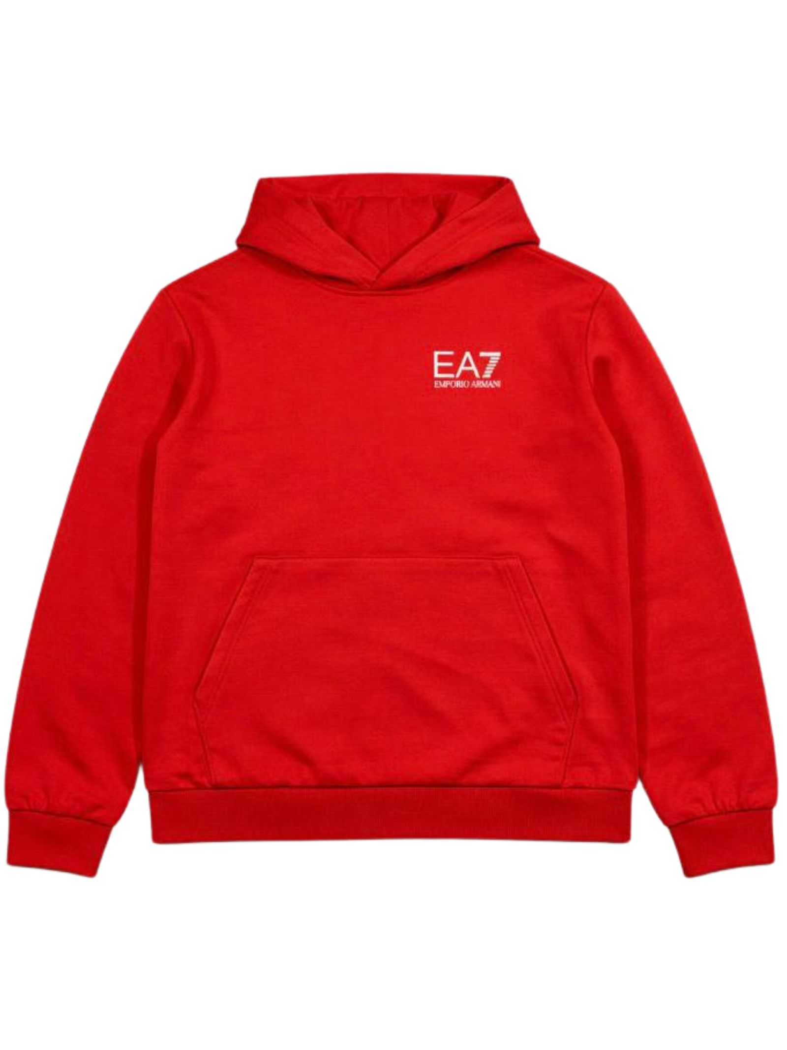 Emporio Armani Junior red hooded sweatshirt with long sleeves, two kangaroo pockets, contrasting logo, regular fit. Composition: 100% cotton.