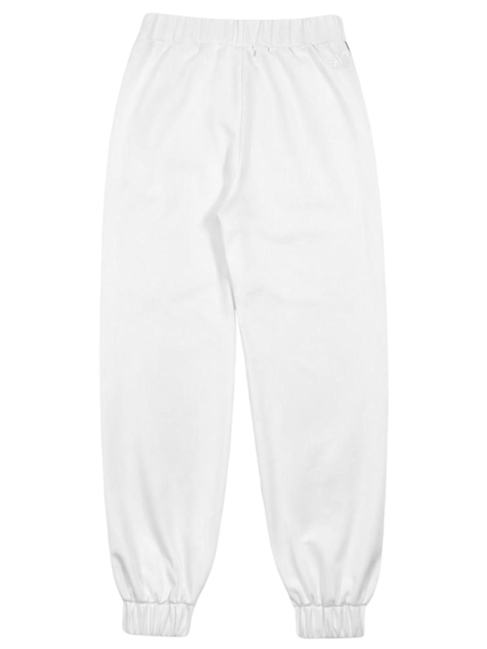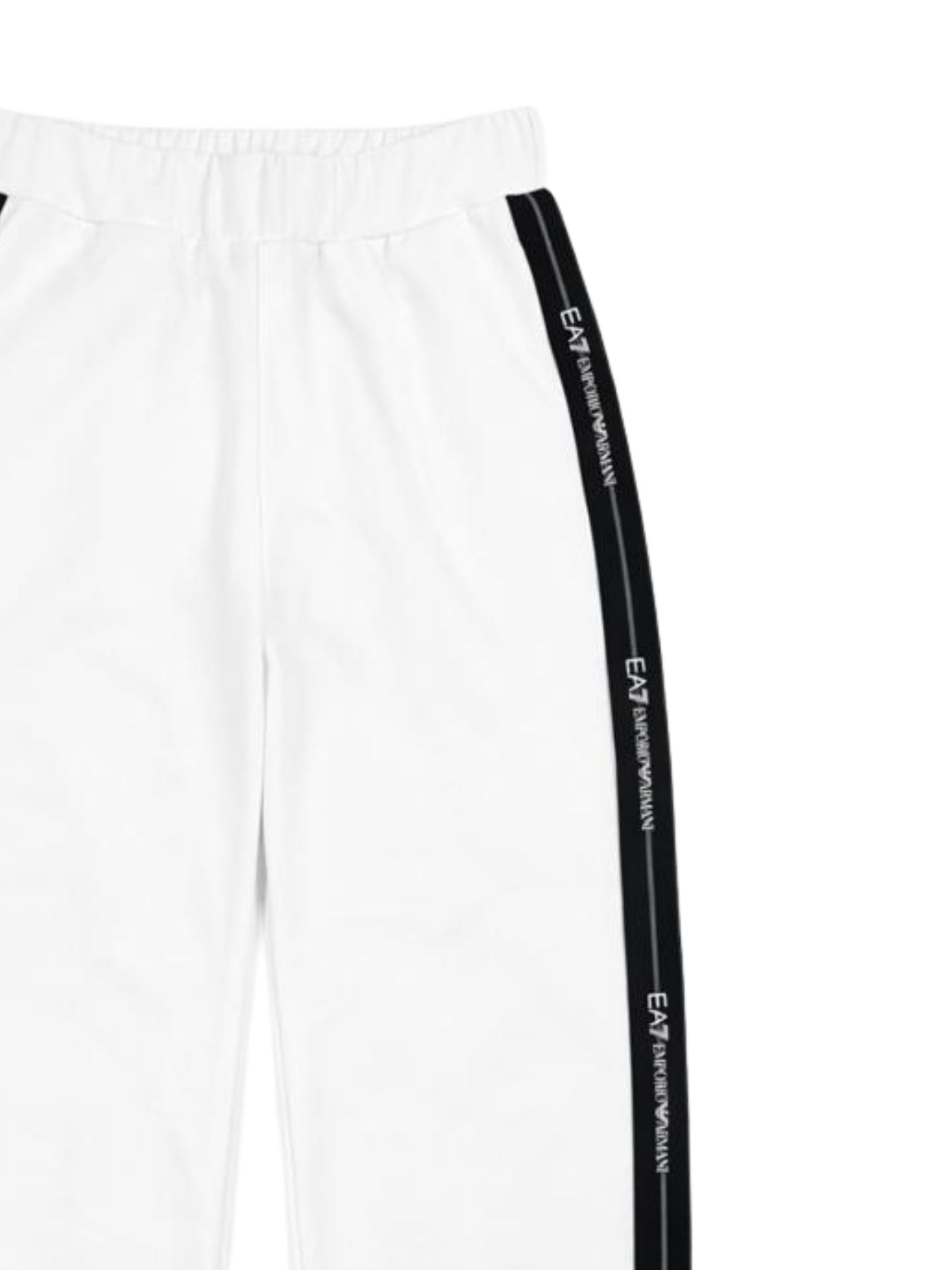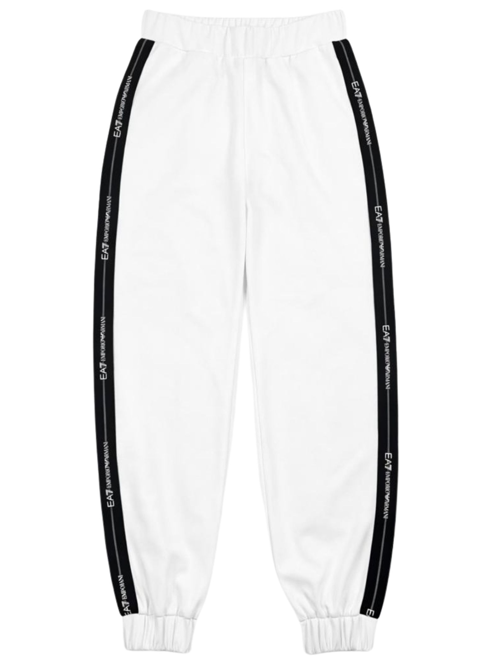 Emporio Armani Junior white trousers with contrasting black side stripes and logo, elastic waist and ankles, logo print, two side pockets, loose fit. Composition: 50% polyester, 24% cotton, 23% modal, 3% elastane.