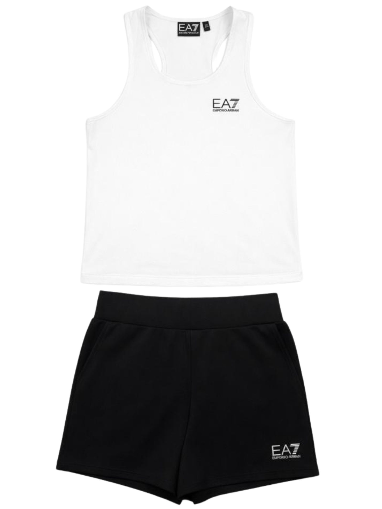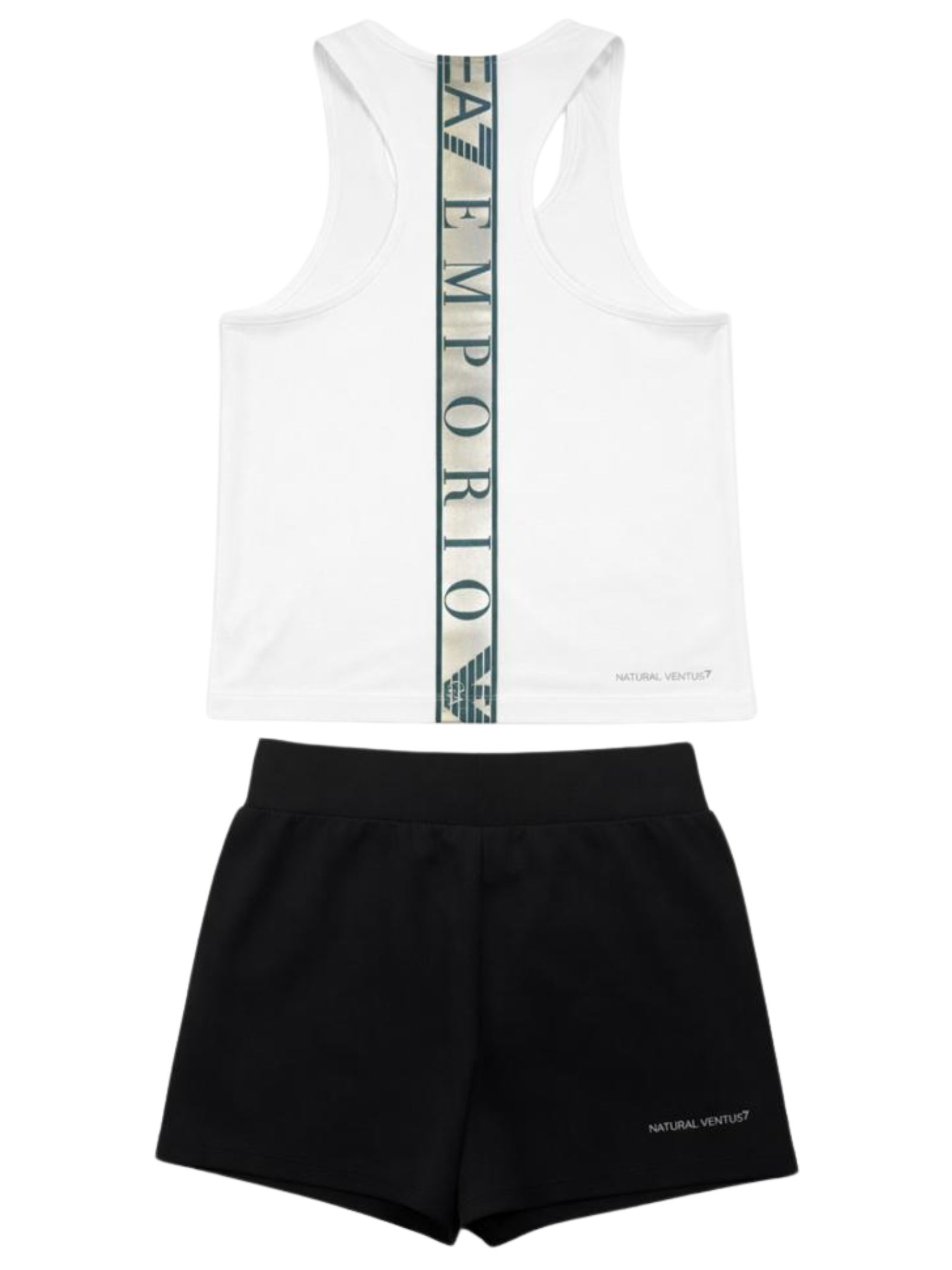 Emporio Armani Junior black and white outfit, consisting of a tank top with a logo band on the back; matching shorts with an elastic waist and two side pockets, regular fit. Composition: 62% polyester, 33% viscose, 5% elastane.