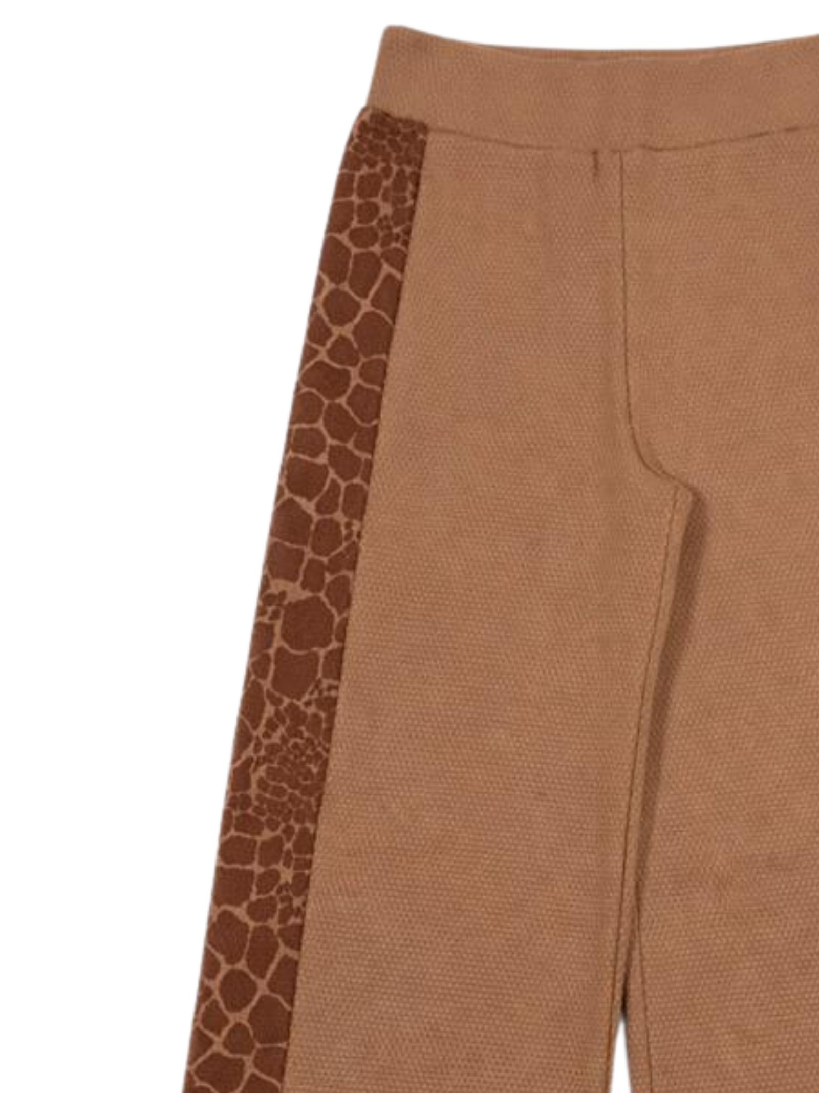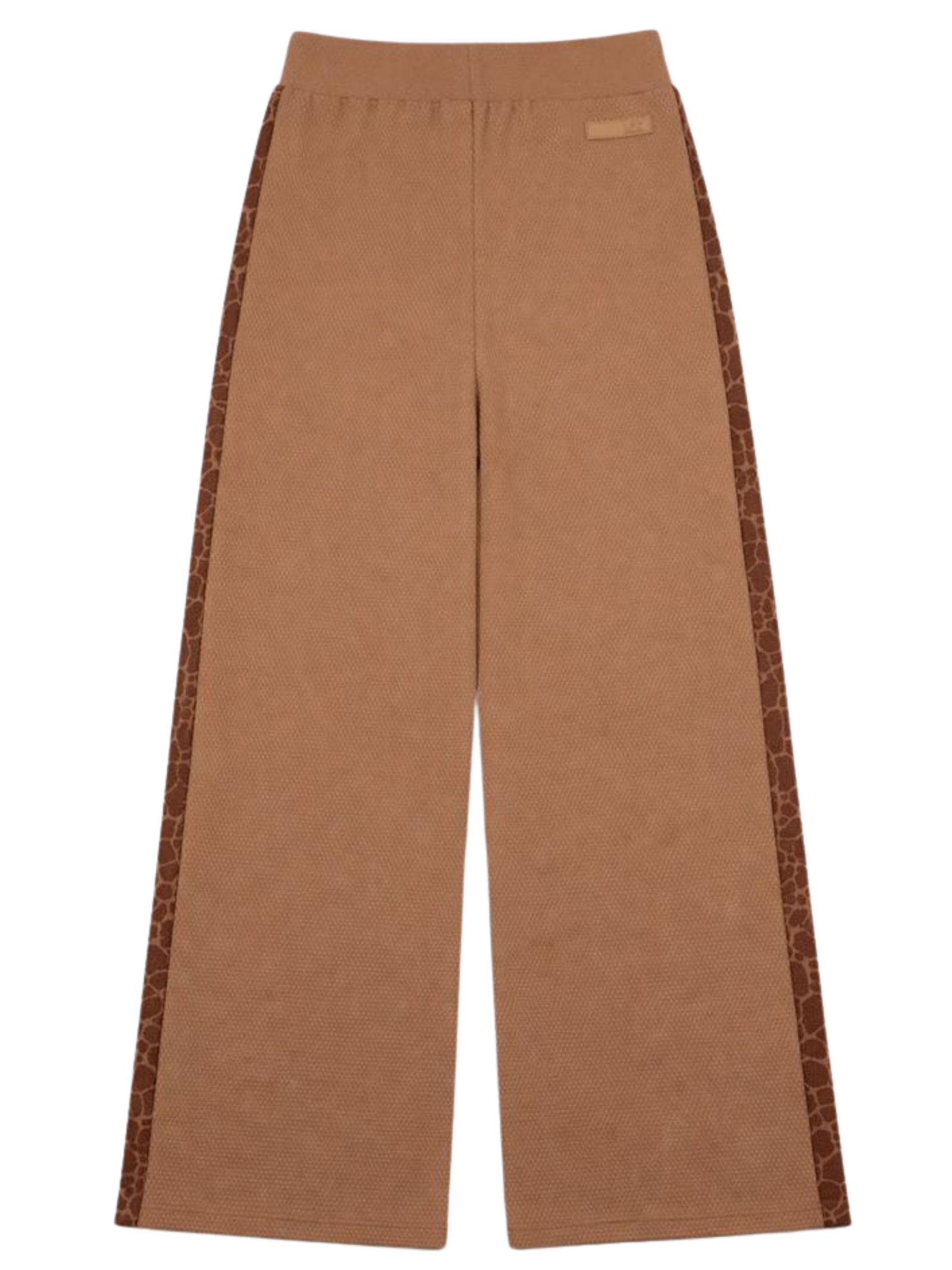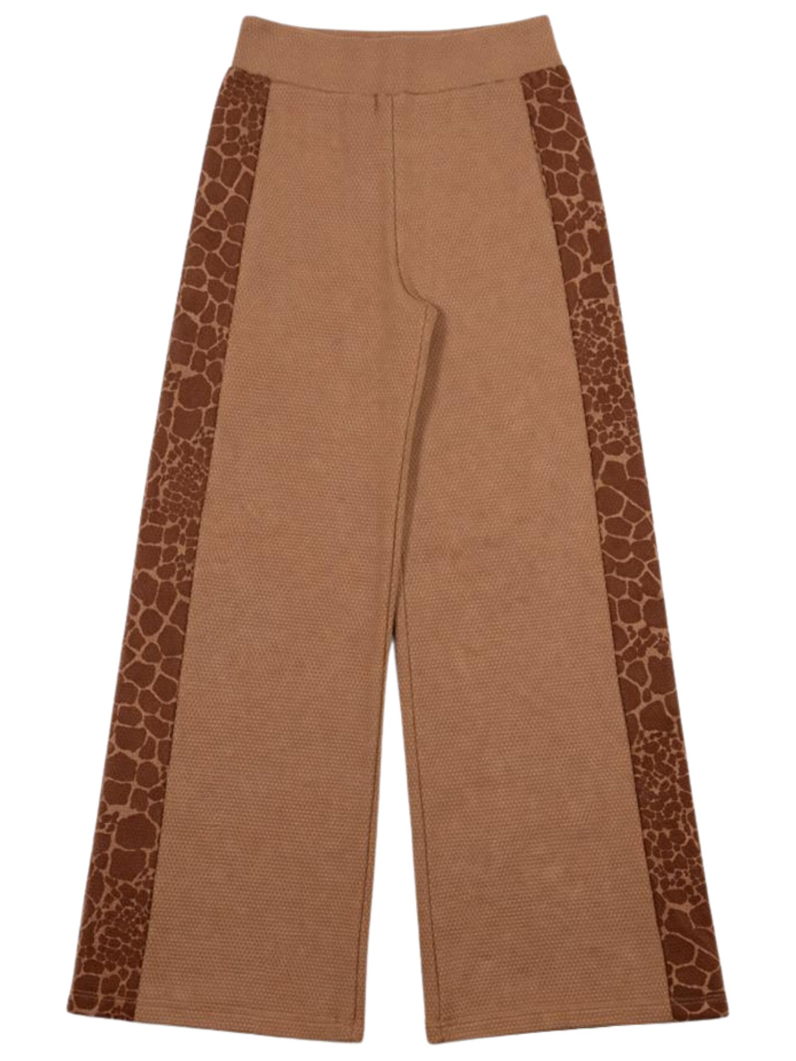 Emporio Armani Junior beige trousers, made of honeycomb-effect cotton, featuring an elastic waistband, contrasting printed side bands, and a wide leg. Composition: 100% cotton.