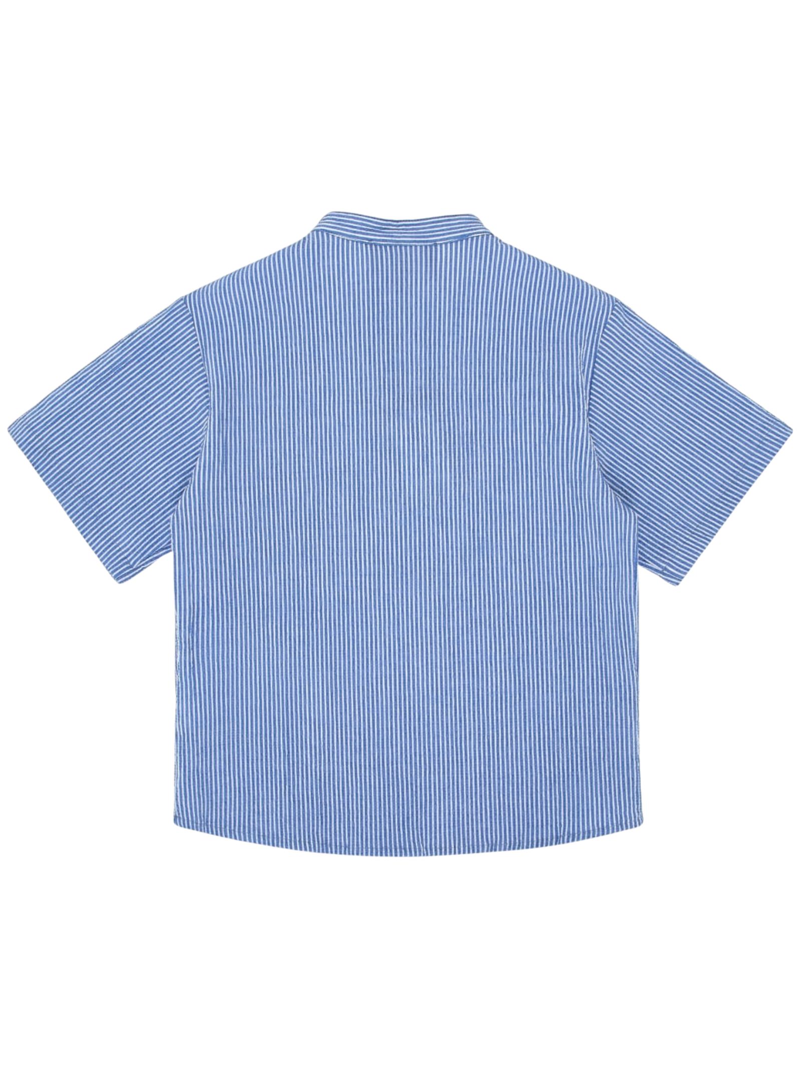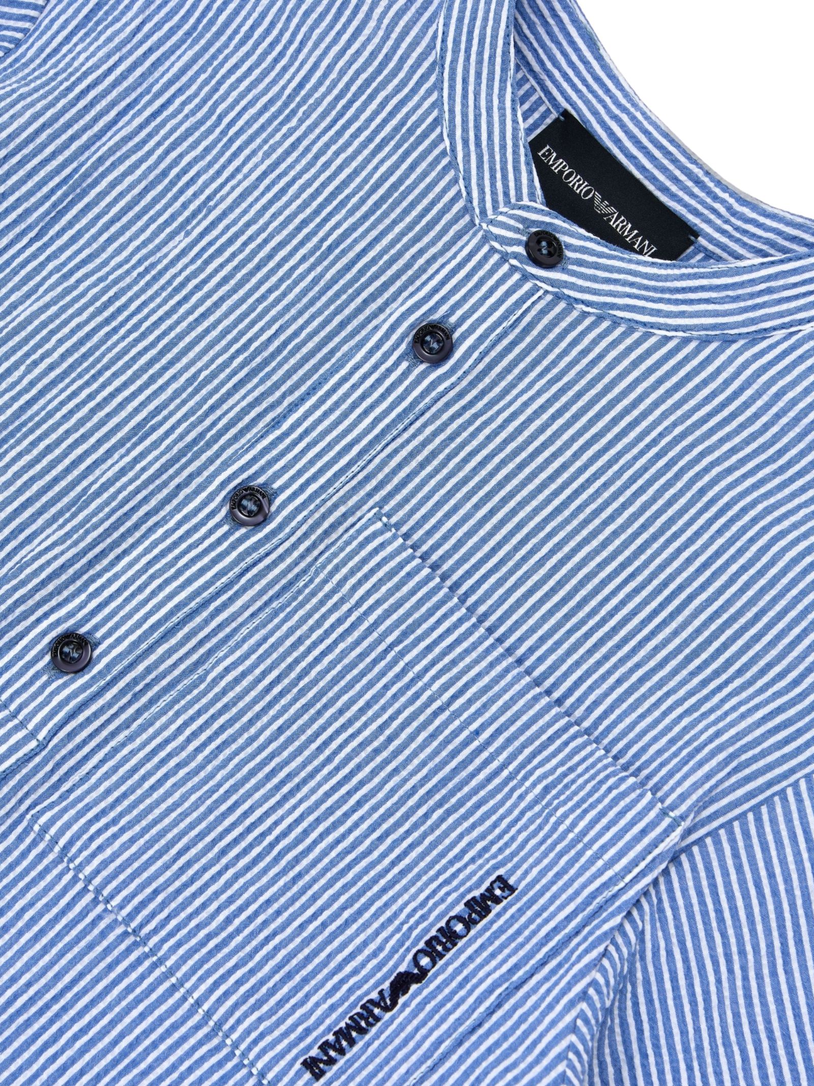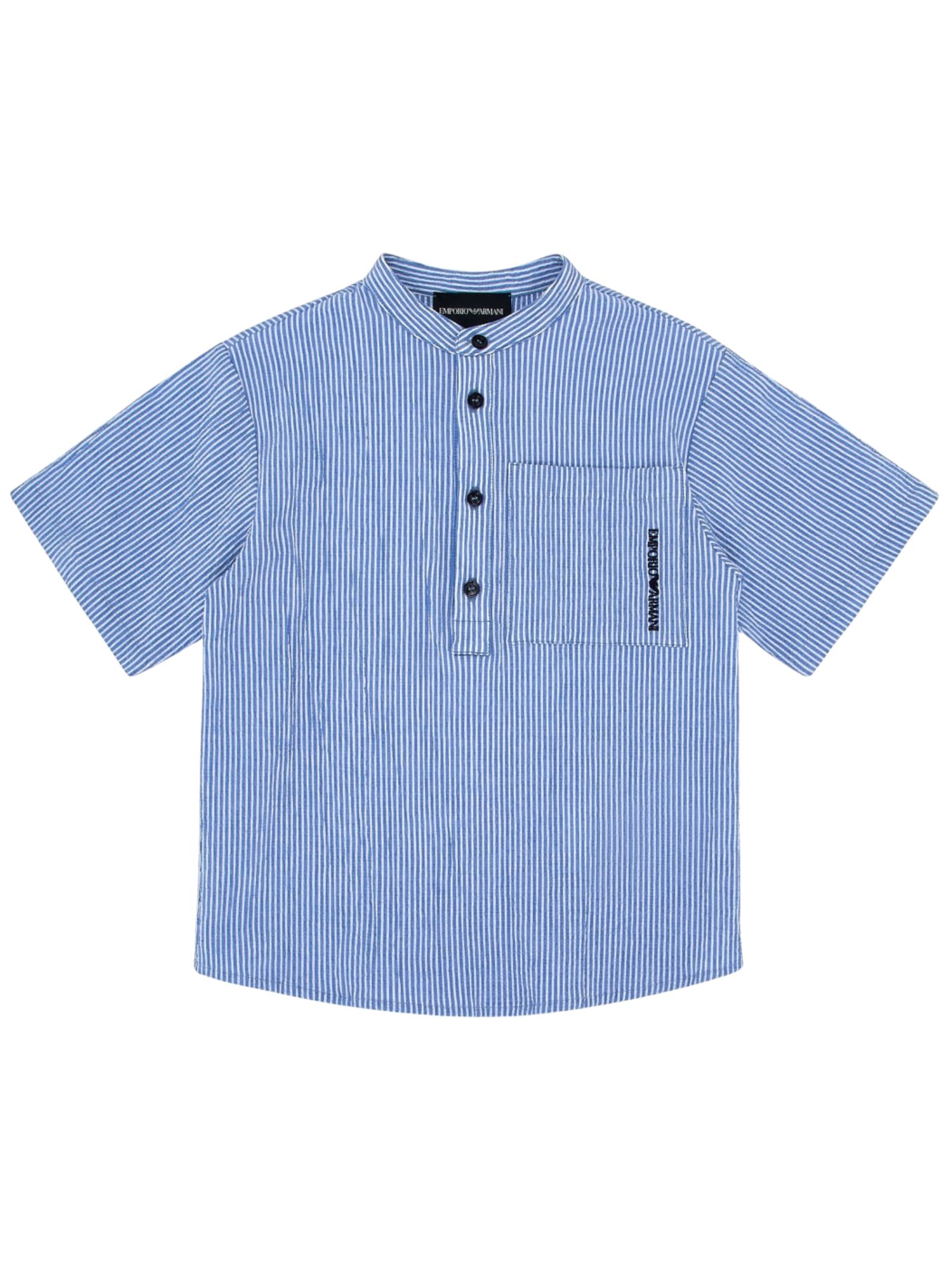 Emporio Armani Junior light blue shirt with a contrasting white striped pattern, short sleeves, mandarin collar, half-button closure, chest pocket with contrasting logo embroidery, curved hem. Composition: 97% cotton, 3% elastane.