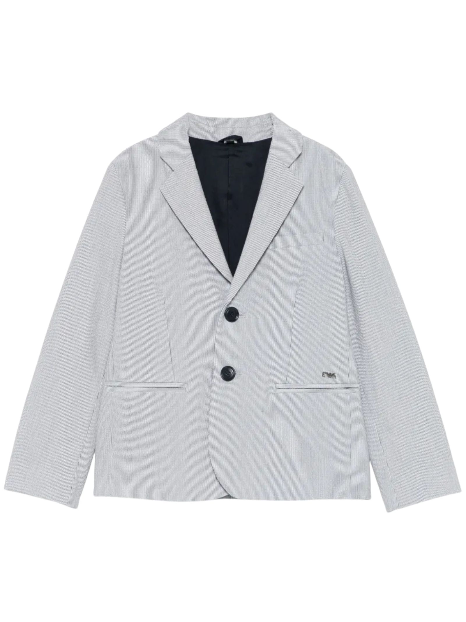 Emporio Armani Junior white/blue striped jacket, two-button front closure, two front slit pockets, long sleeves, metal logo applique, regular fit. Composition: 63% polyester, 34% viscose, 3% elastane. Lining: 57% viscose, 43% polyester.