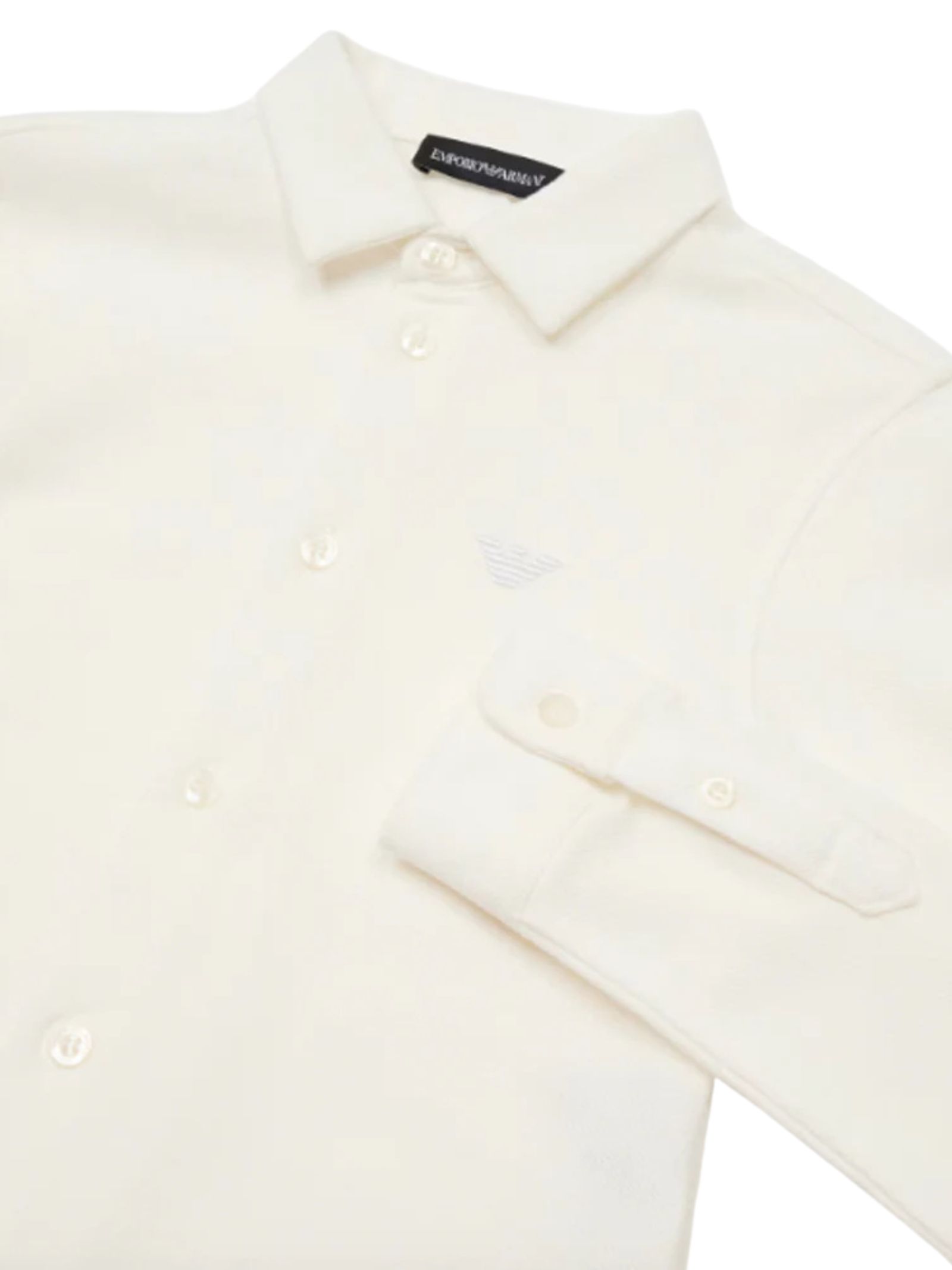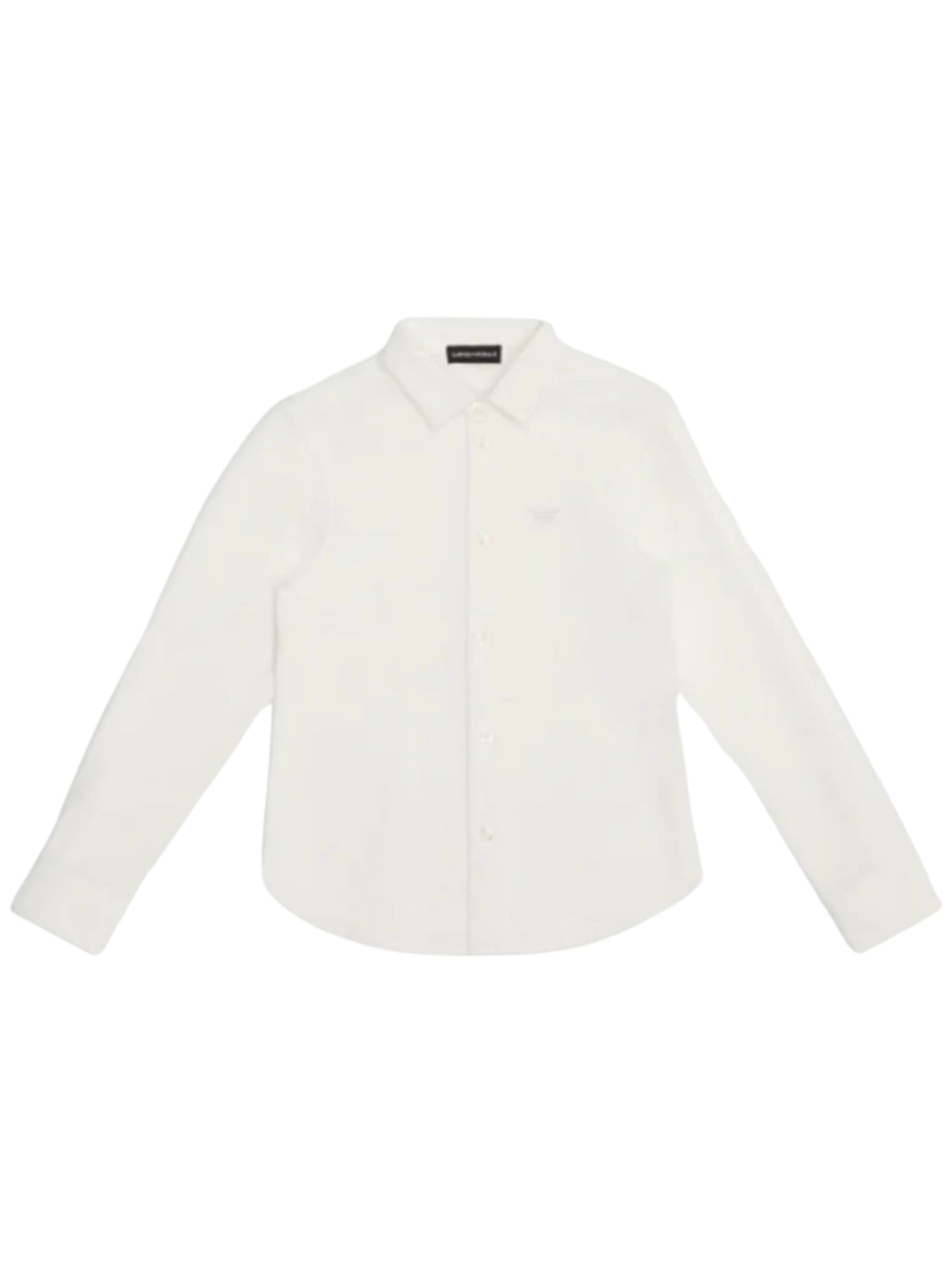 Emporio Armani Junior white pique cotton shirt with a central button fastening, logo embroidery on the chest, long sleeves with buttoned cuffs, and a curved hem. Composition: 100% cotton.