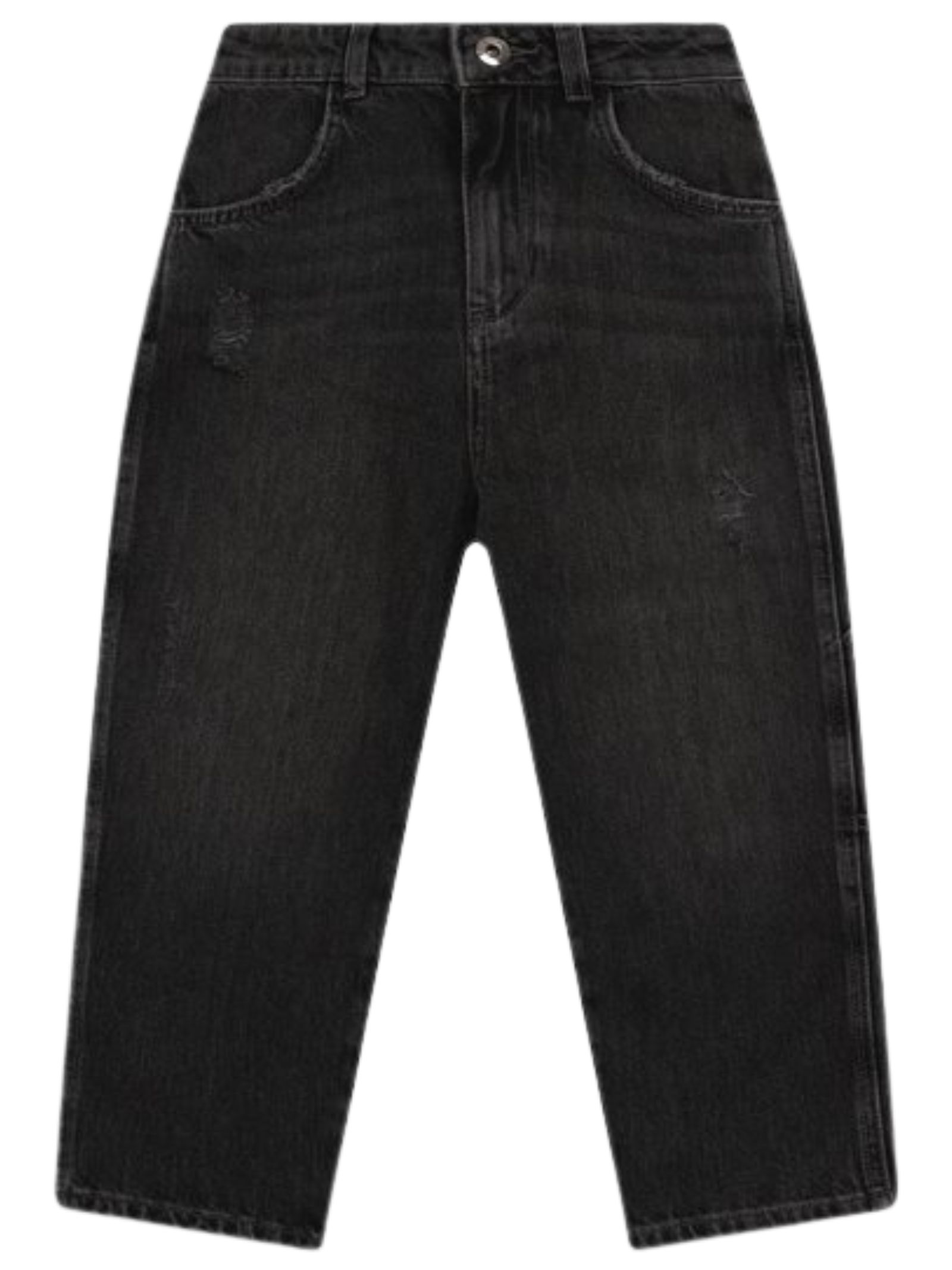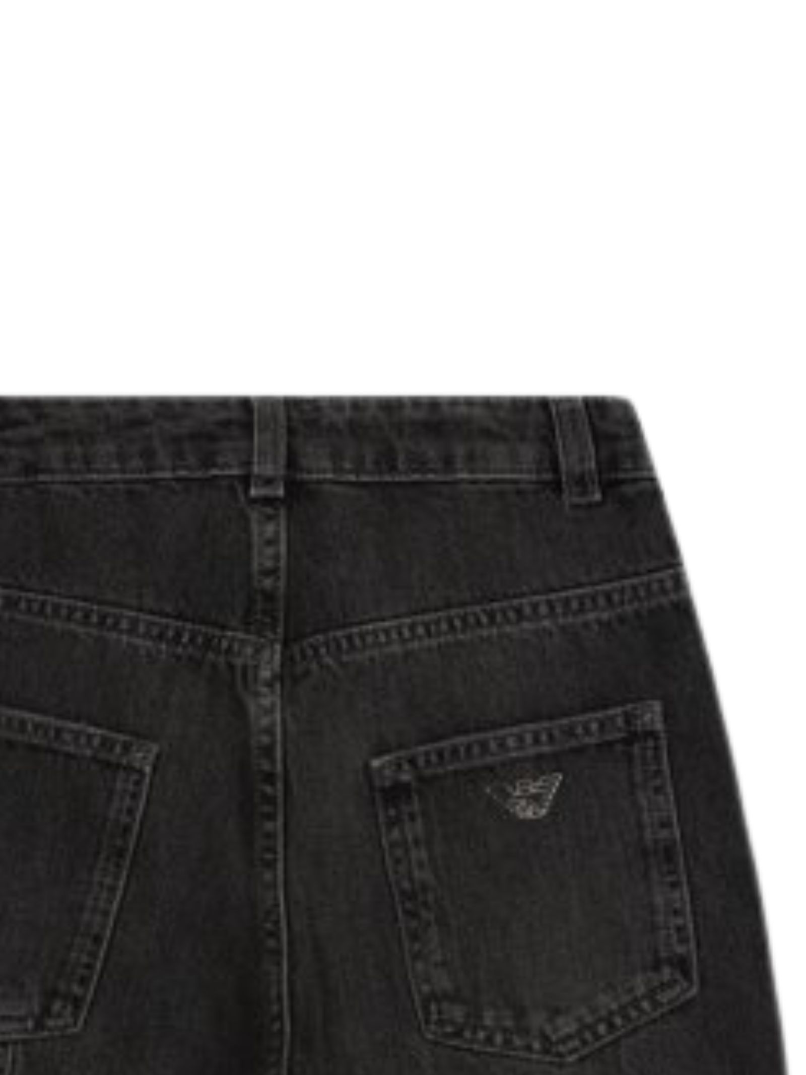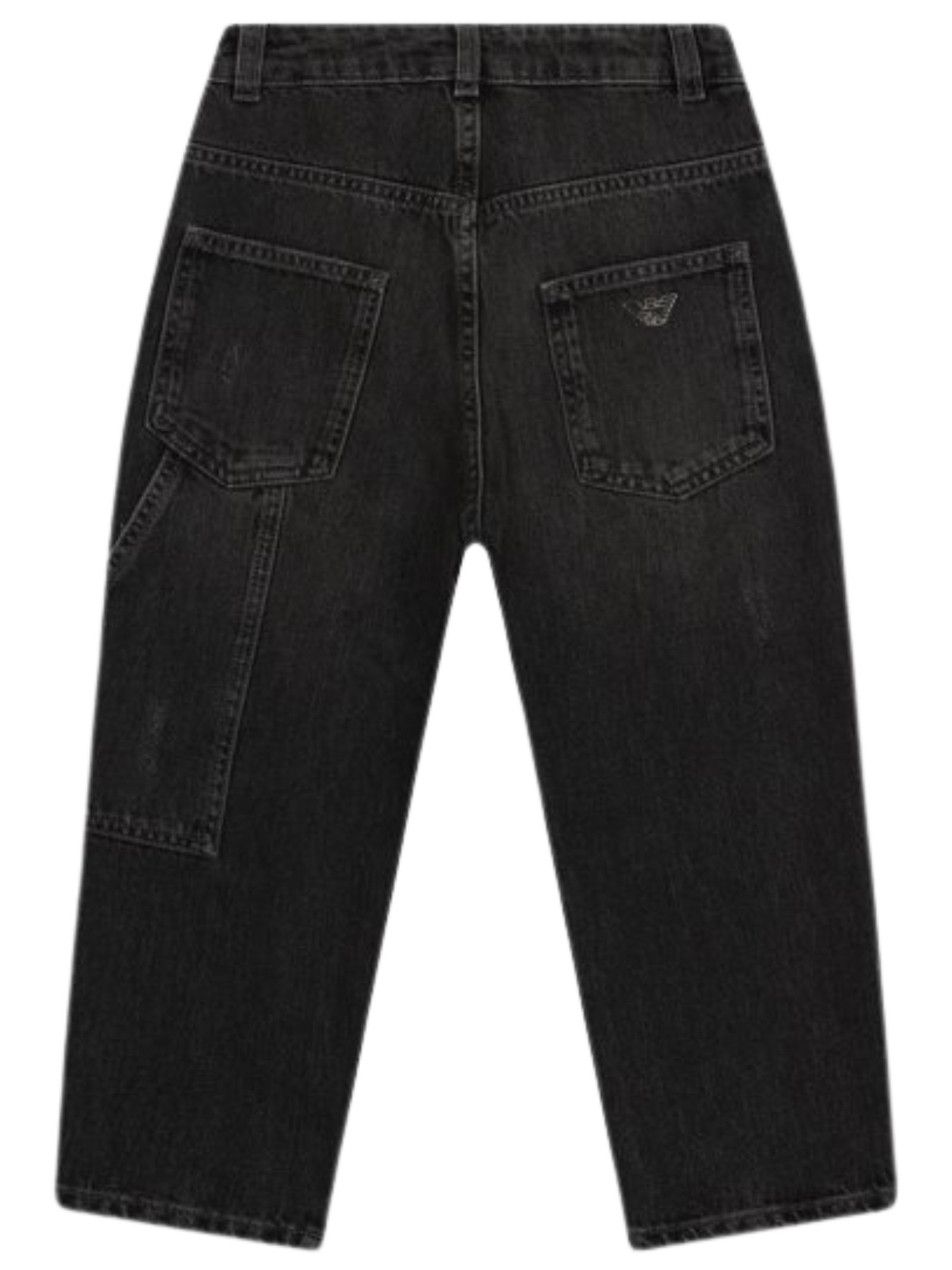Emporio Armani Junior black jeans with abrasion detail, five-pocket styling, metal logo on the back, wide leg fit. Composition: 100% cotton.