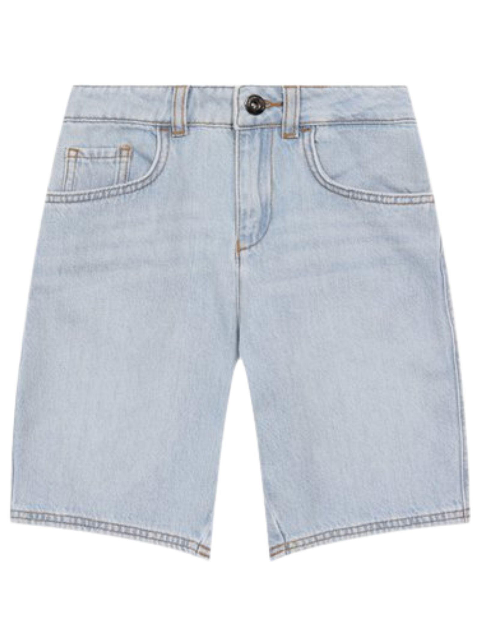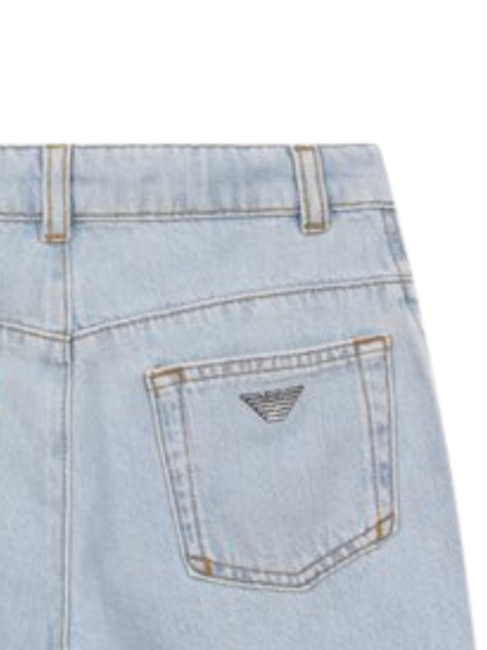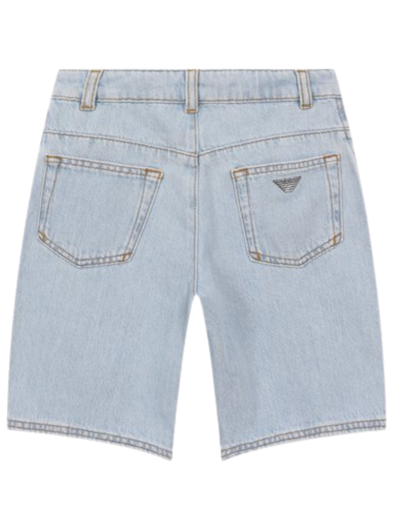 Emporio Armani Junior light-wash denim Bermuda shorts, five-pocket design, metal logo on the back, regular fit. Composition: 100% cotton.