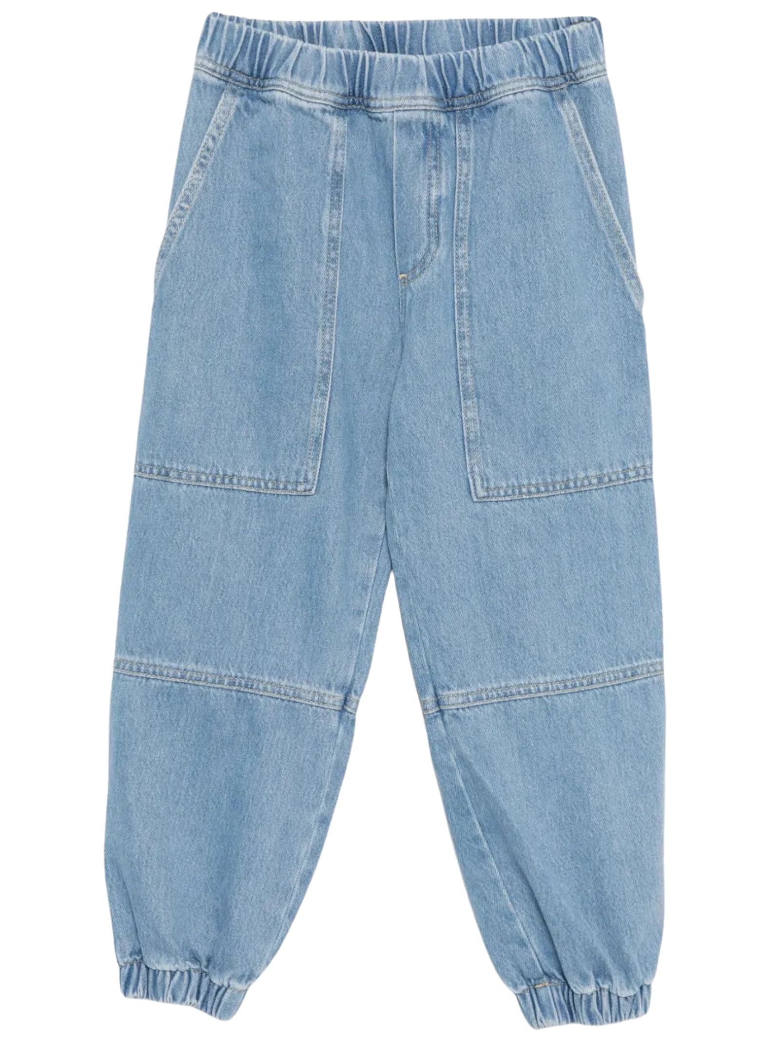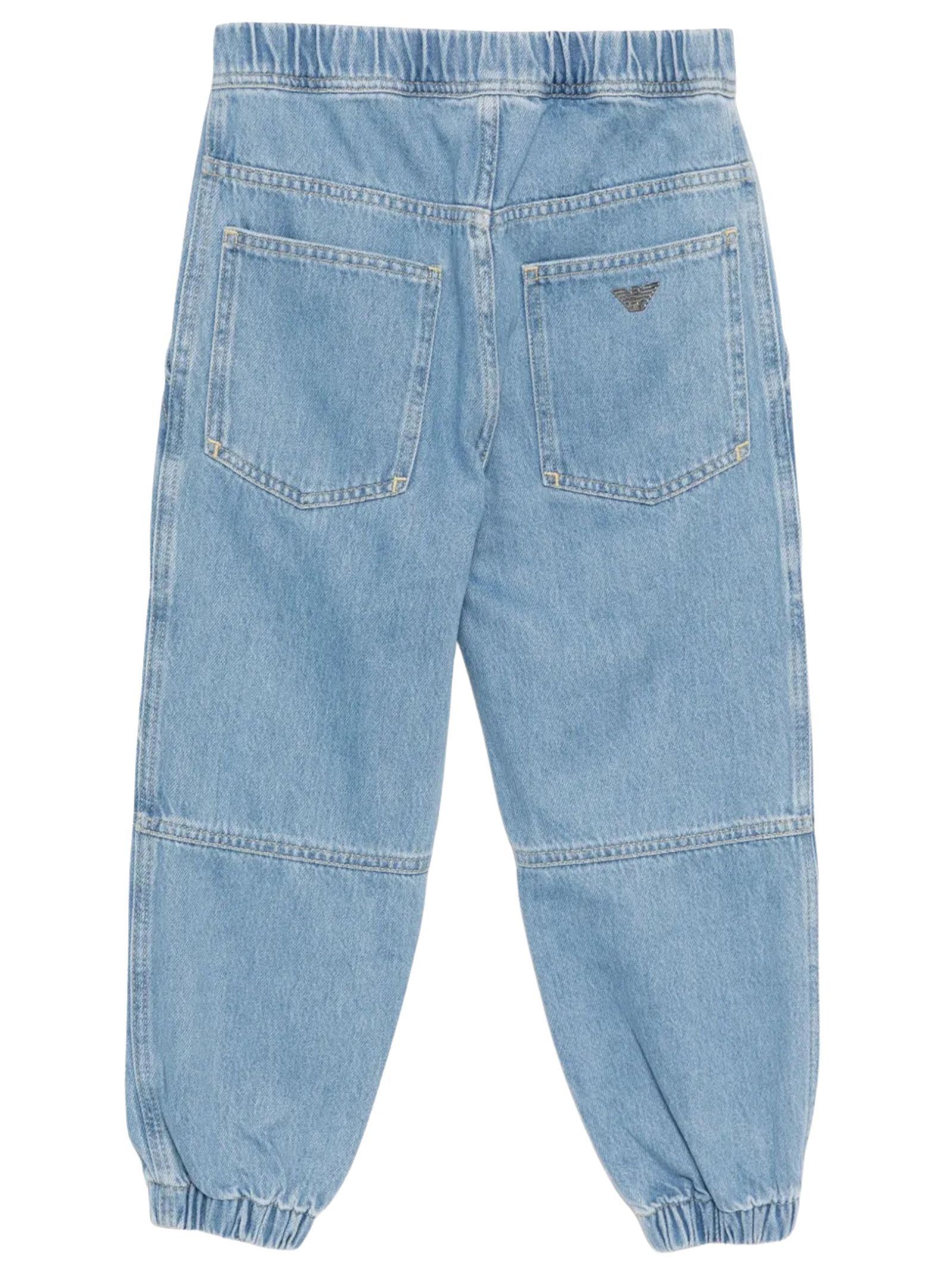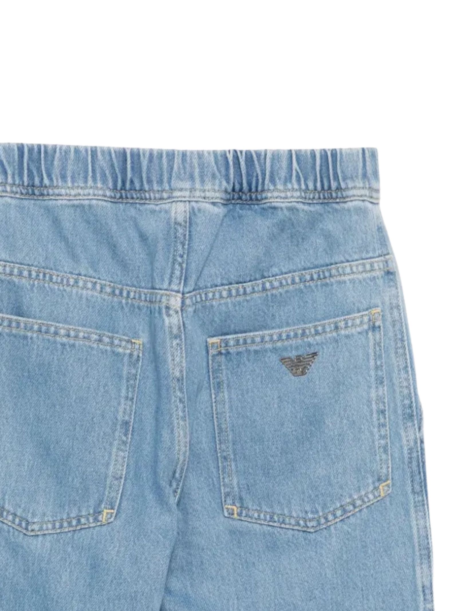 Emporio Armani Junior light blue jeans with a light wash, an elastic waistband, four pockets, a metal logo on the back, elastic cuffs, and a regular fit. Composition: 100% cotton.