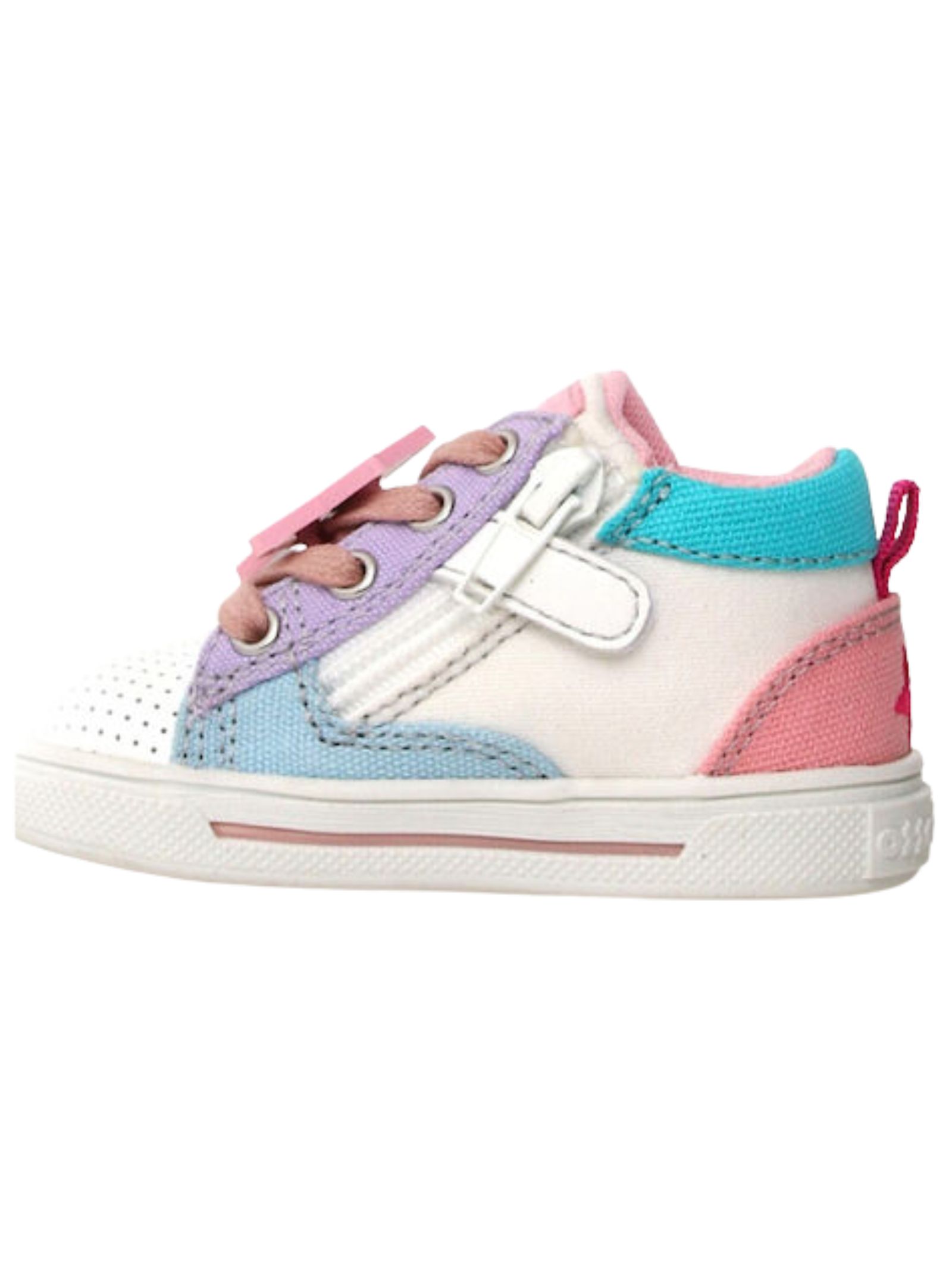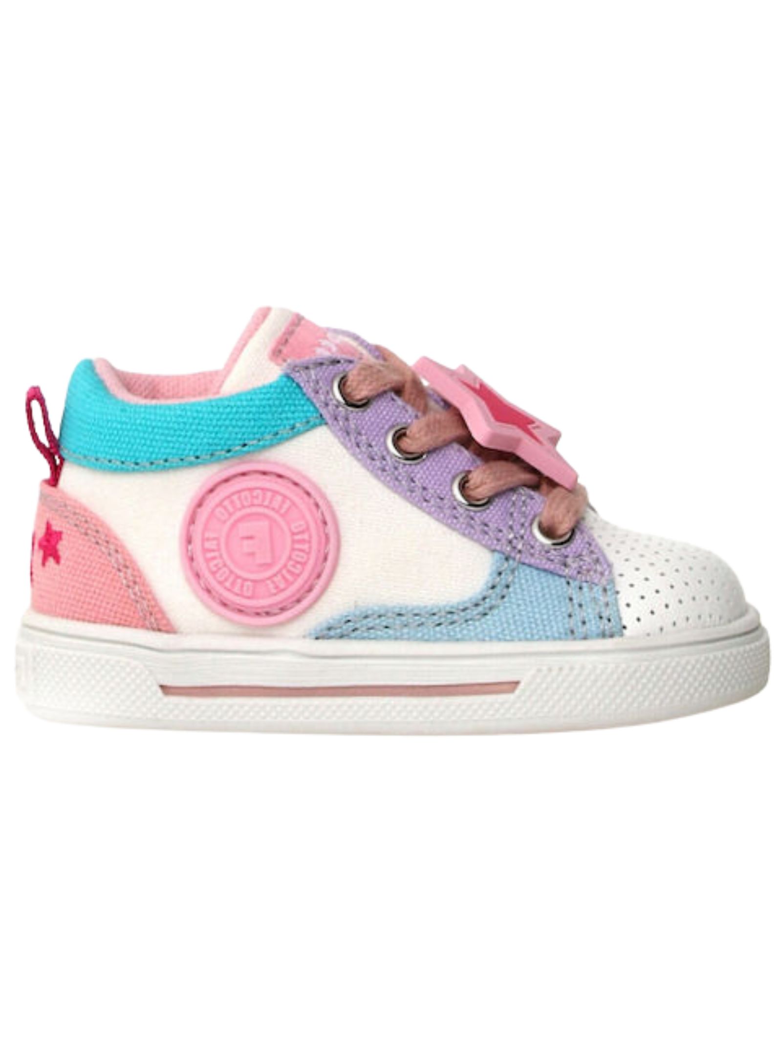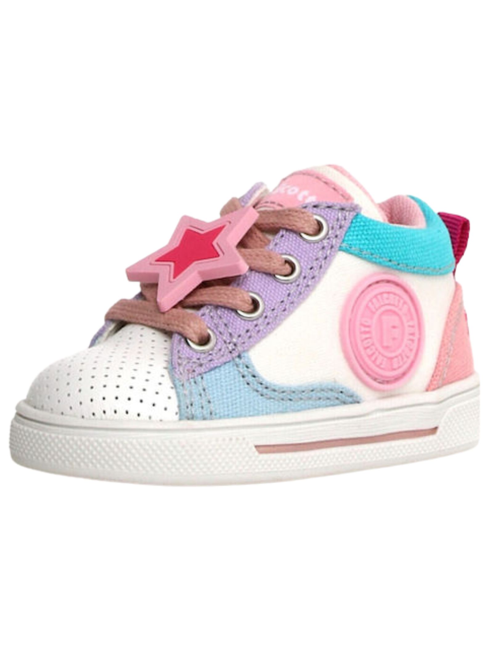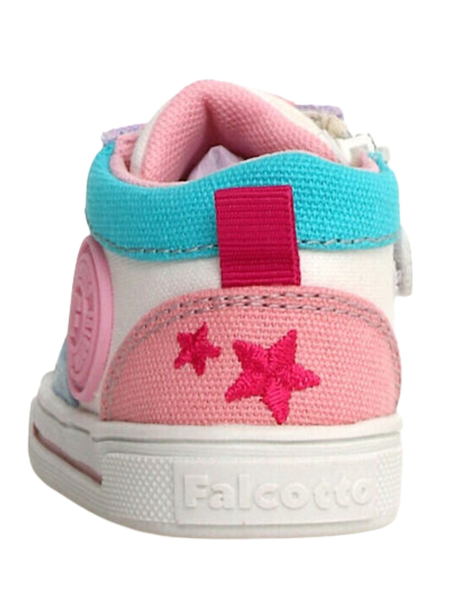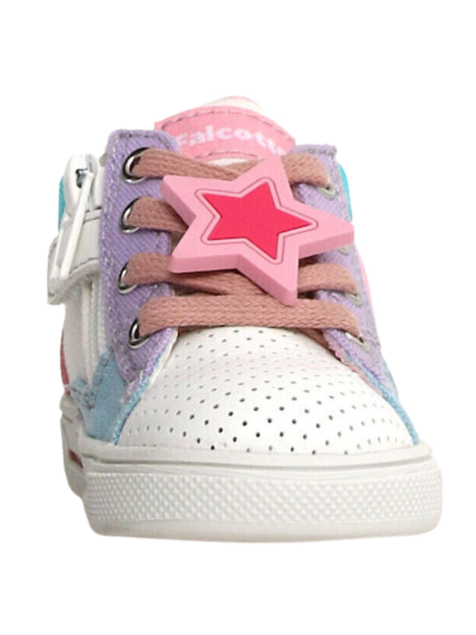 FALCOTTO Kids White sneakers with multicolor inserts, made of soft leather with a playful and refined taste, front lace-up fastening, side zip, round toe, removable rubber star application, rubber sole.