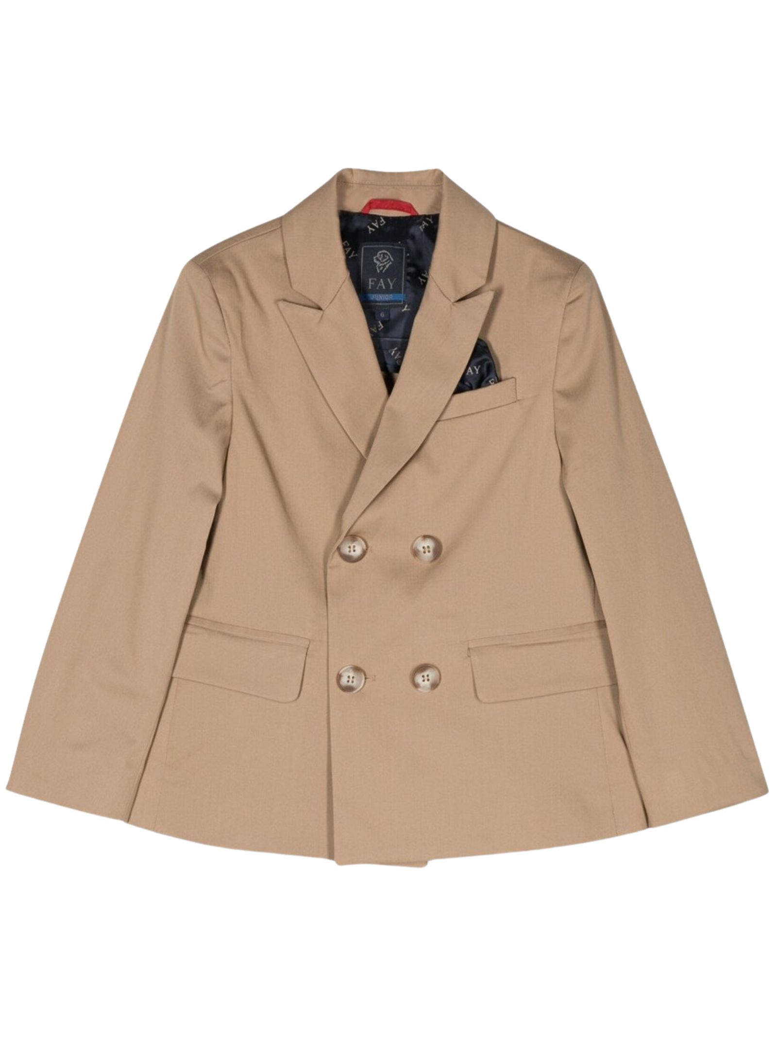 Fay Kids beige jacket with contrasting blue lining and logo, lapel collar, two front patch pockets, one chest pocket, double-breasted style, made of stretch cotton, two back vents. Composition: 97% cotton, 3% elastane. Lining: 100% viscose.