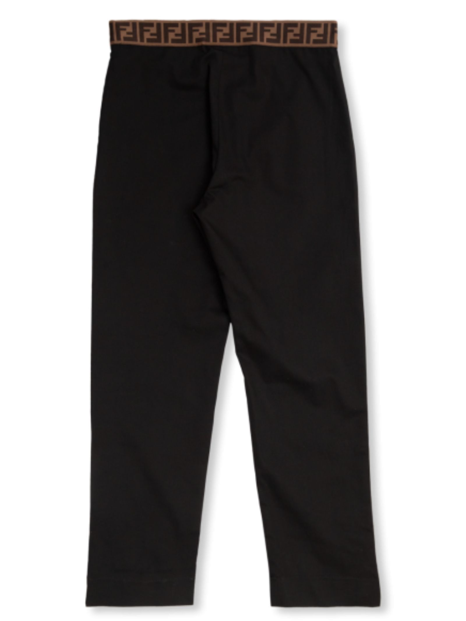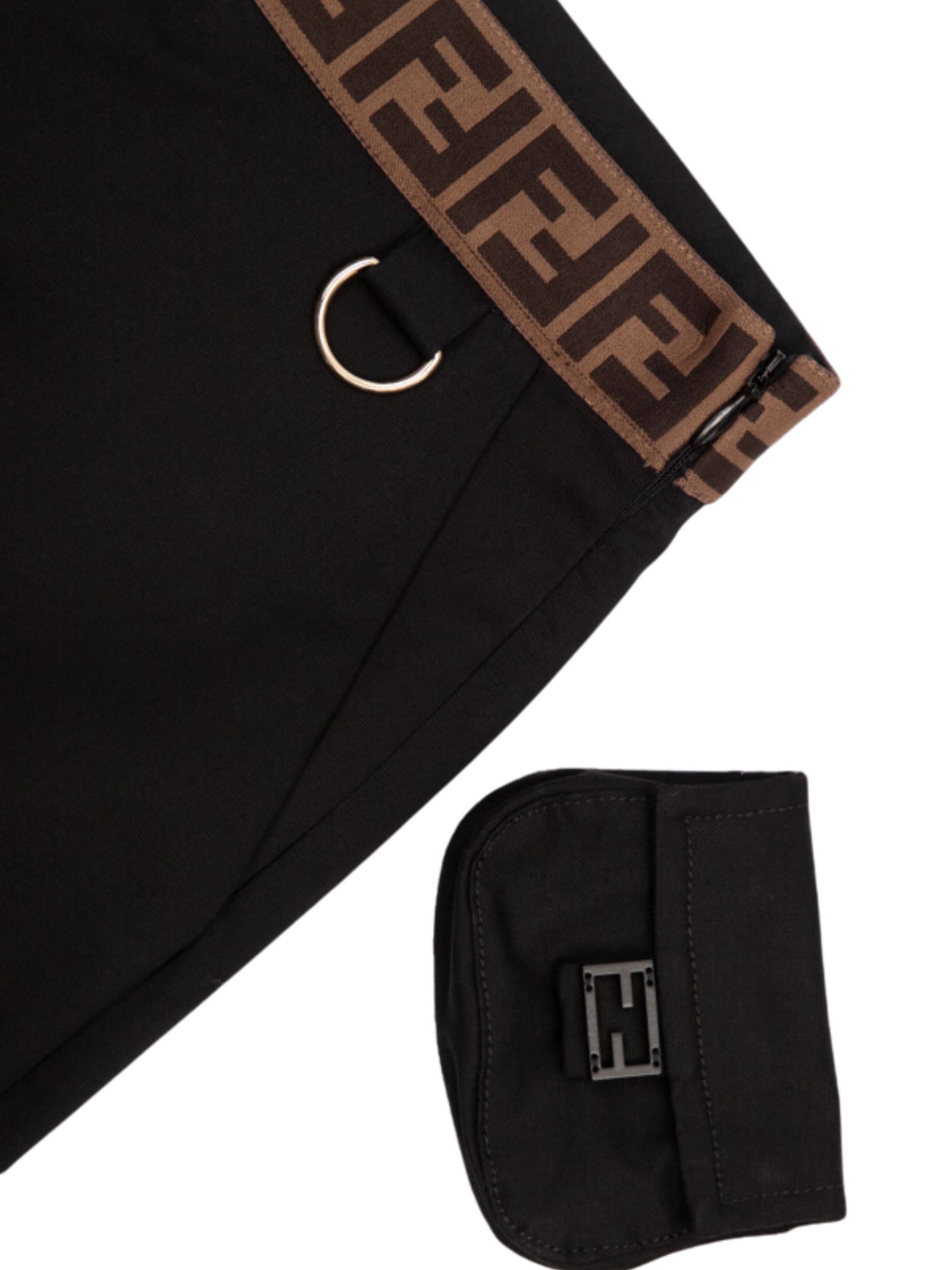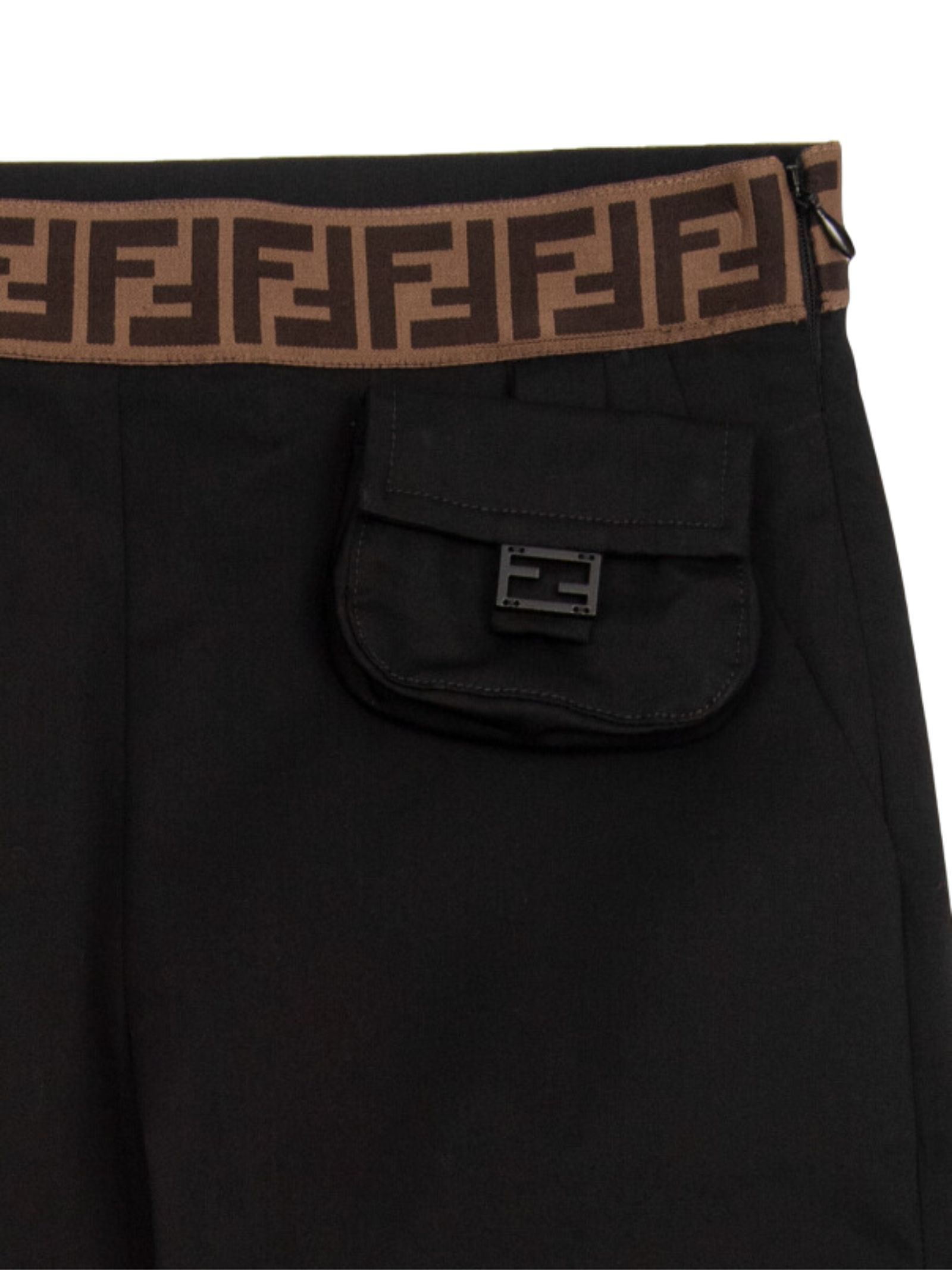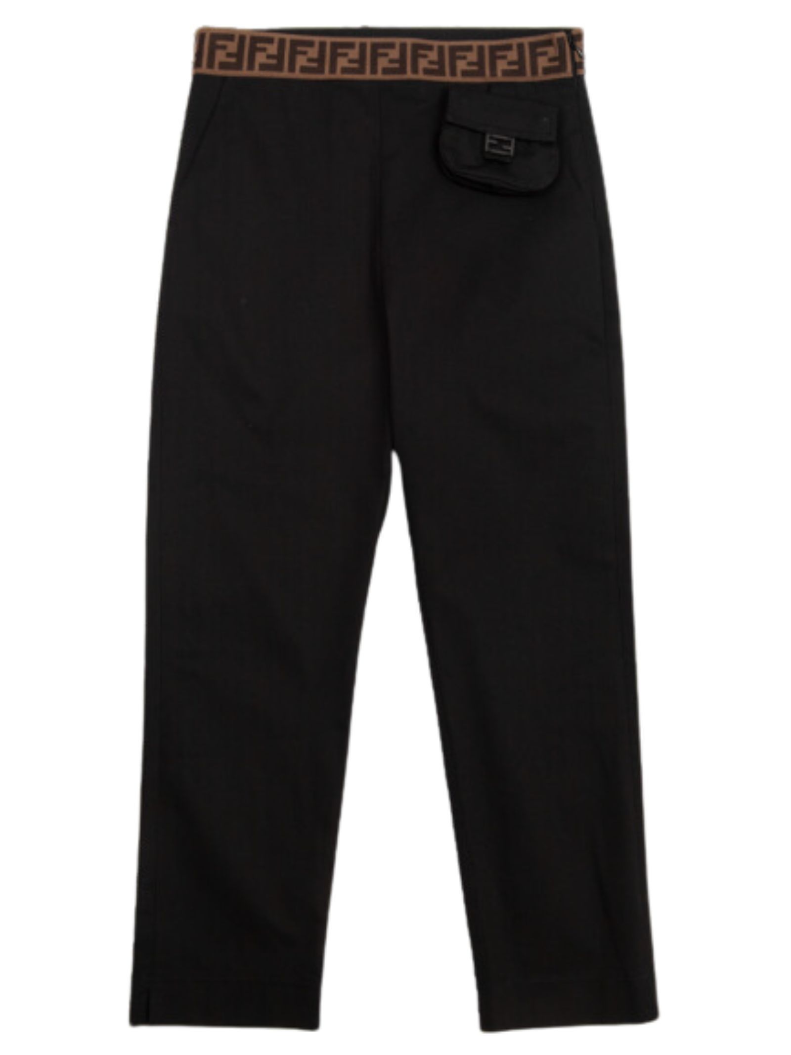 Fendi Kids black trousers, mini Baguette appliqué at the waist, decorated with iconic FF in contrasting brown at the waist, side zip fastening, side welt pockets. Composition: 97% cotton, 3% elastane. Made in Italy.