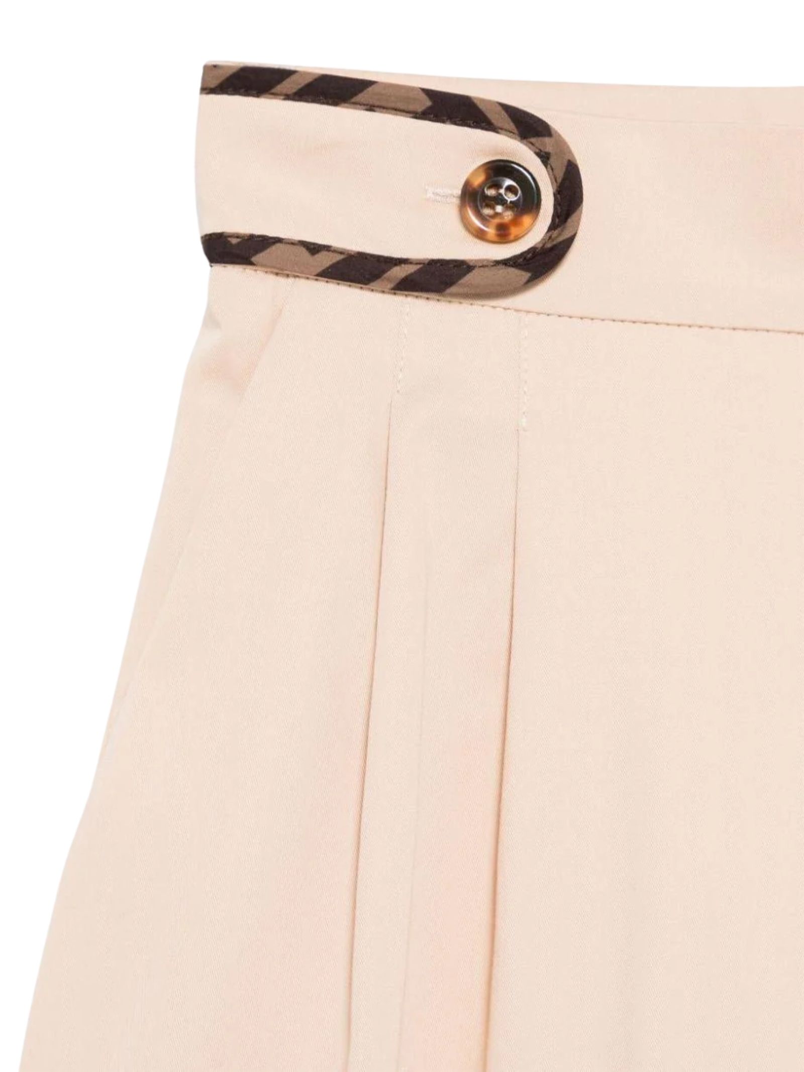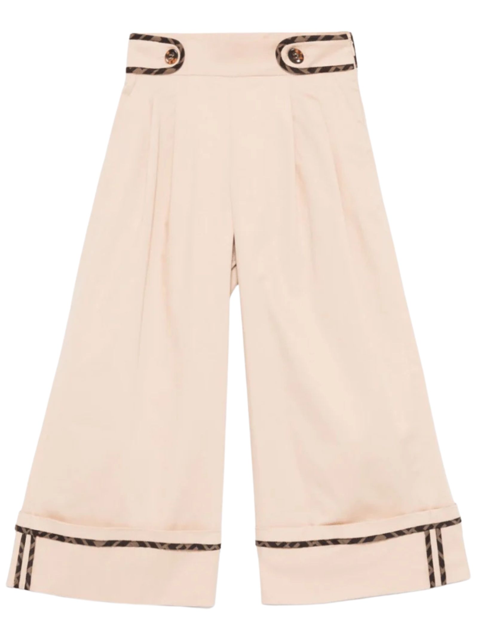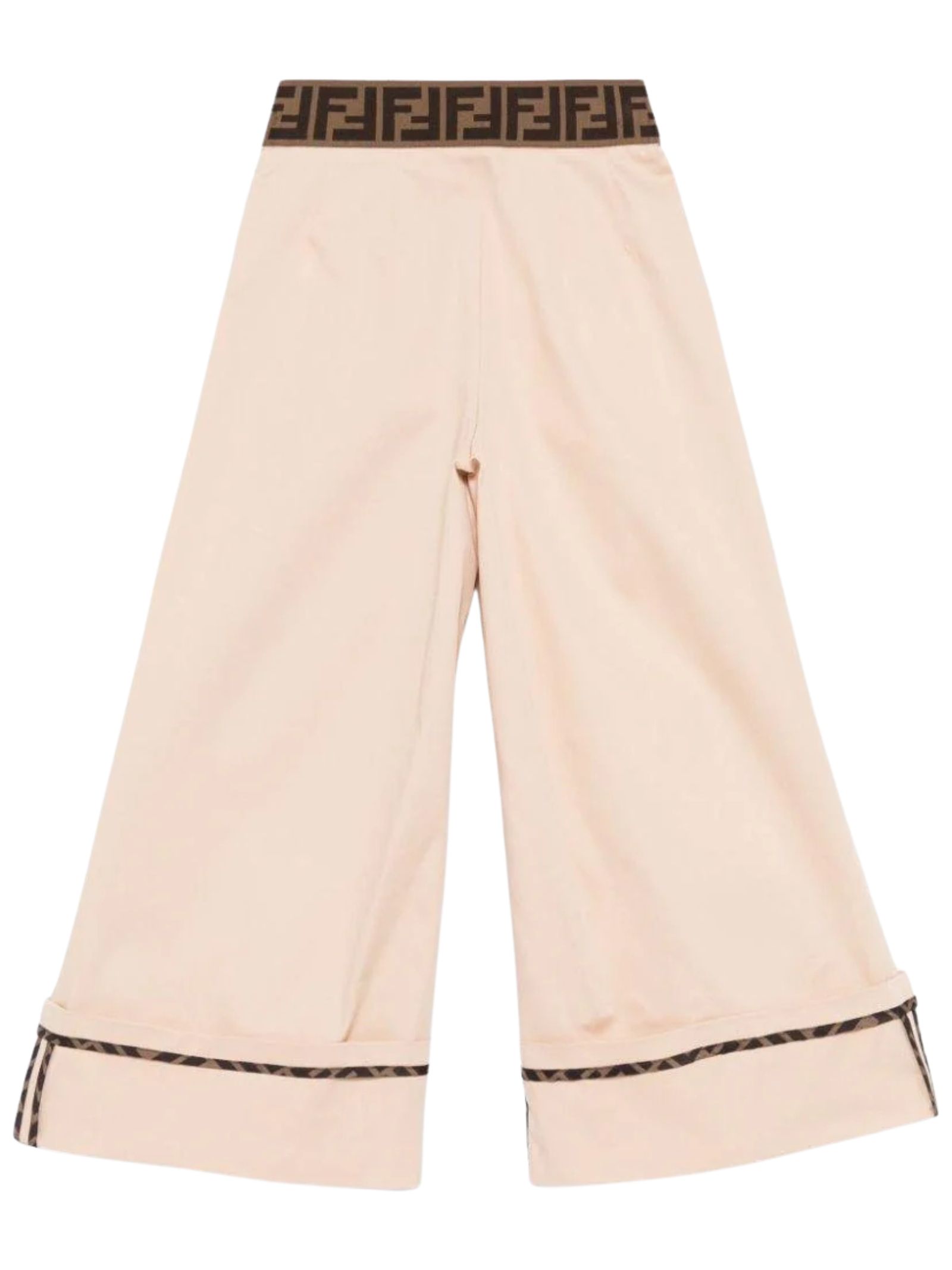 Fendi Kids beige trousers, waistband with contrasting brown elastic band on the back with logo, front buttons, two side pockets, flared design, and cuffed hems. Composition: 97% cotton, 3% elastane. Made in Italy
