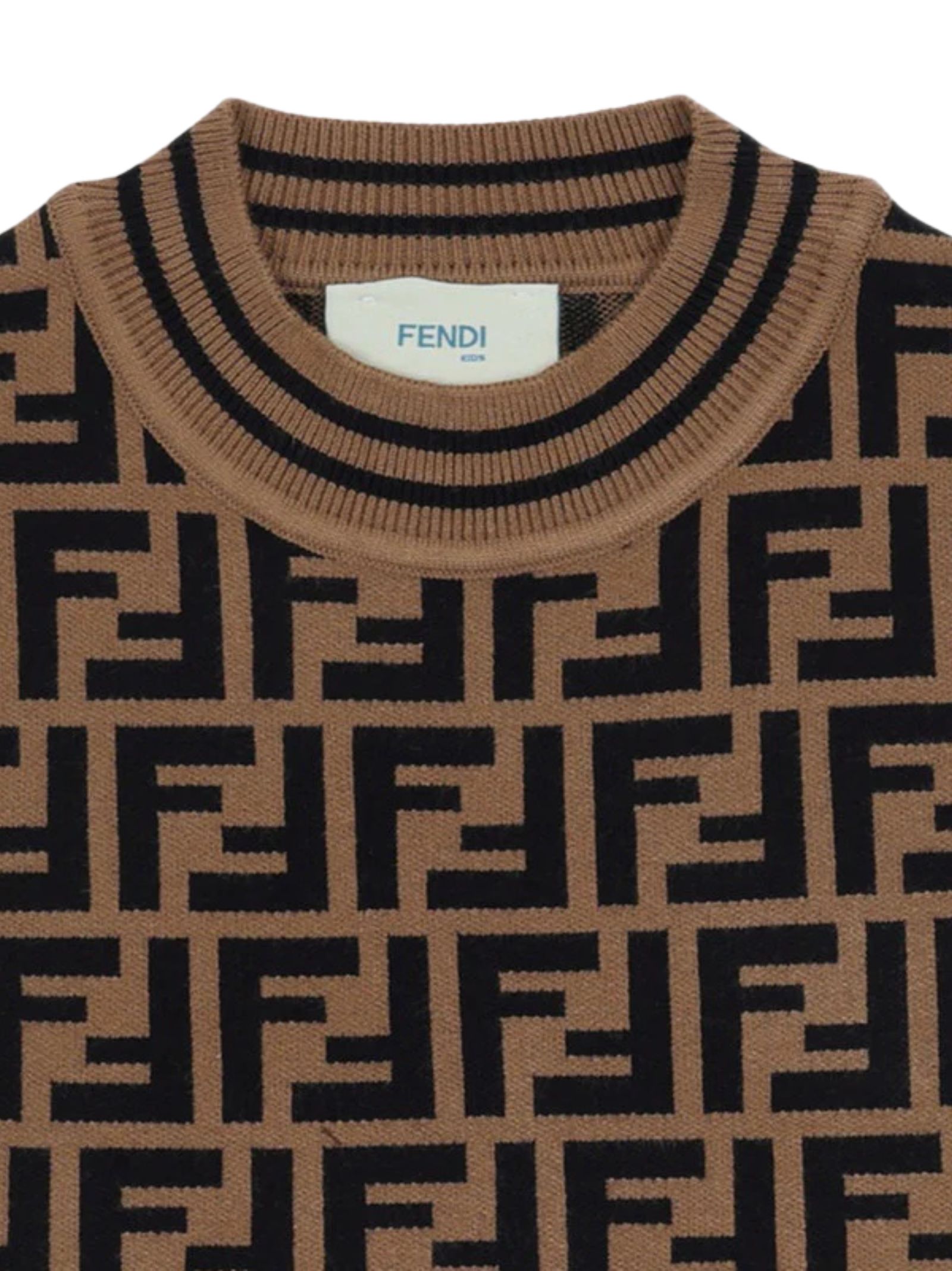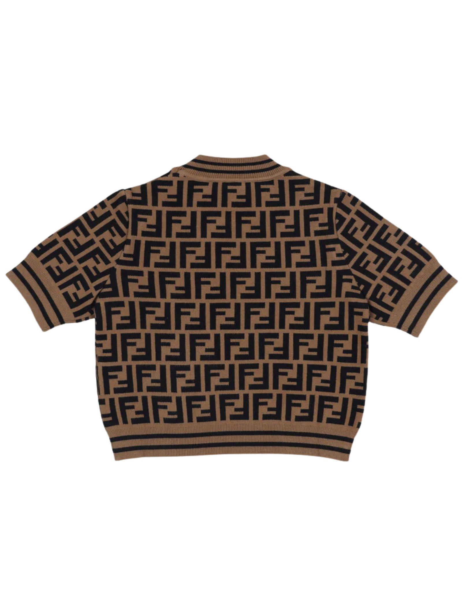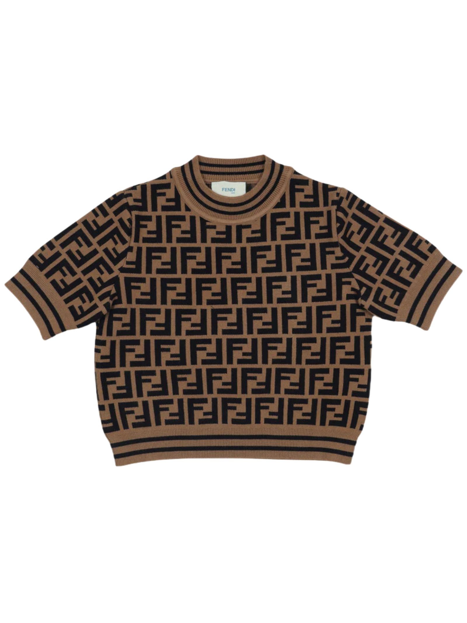 Fendi Junior brown sweater featuring an all-over FF motif, crew neck, short sleeves, and elasticated ribbed cuffs. Composition: 67% viscose, 33% nylon. Made in Italy.