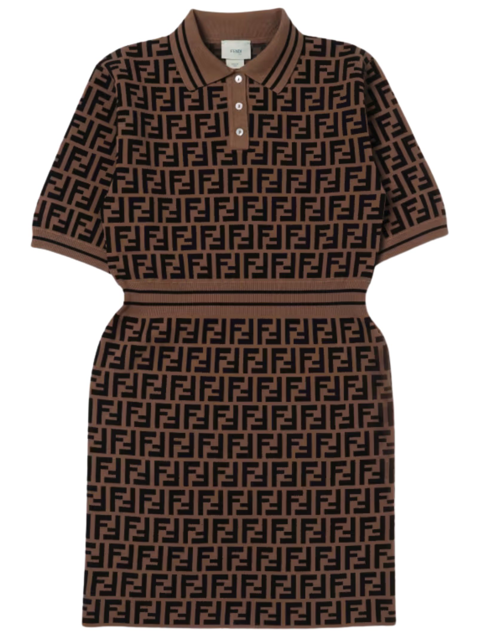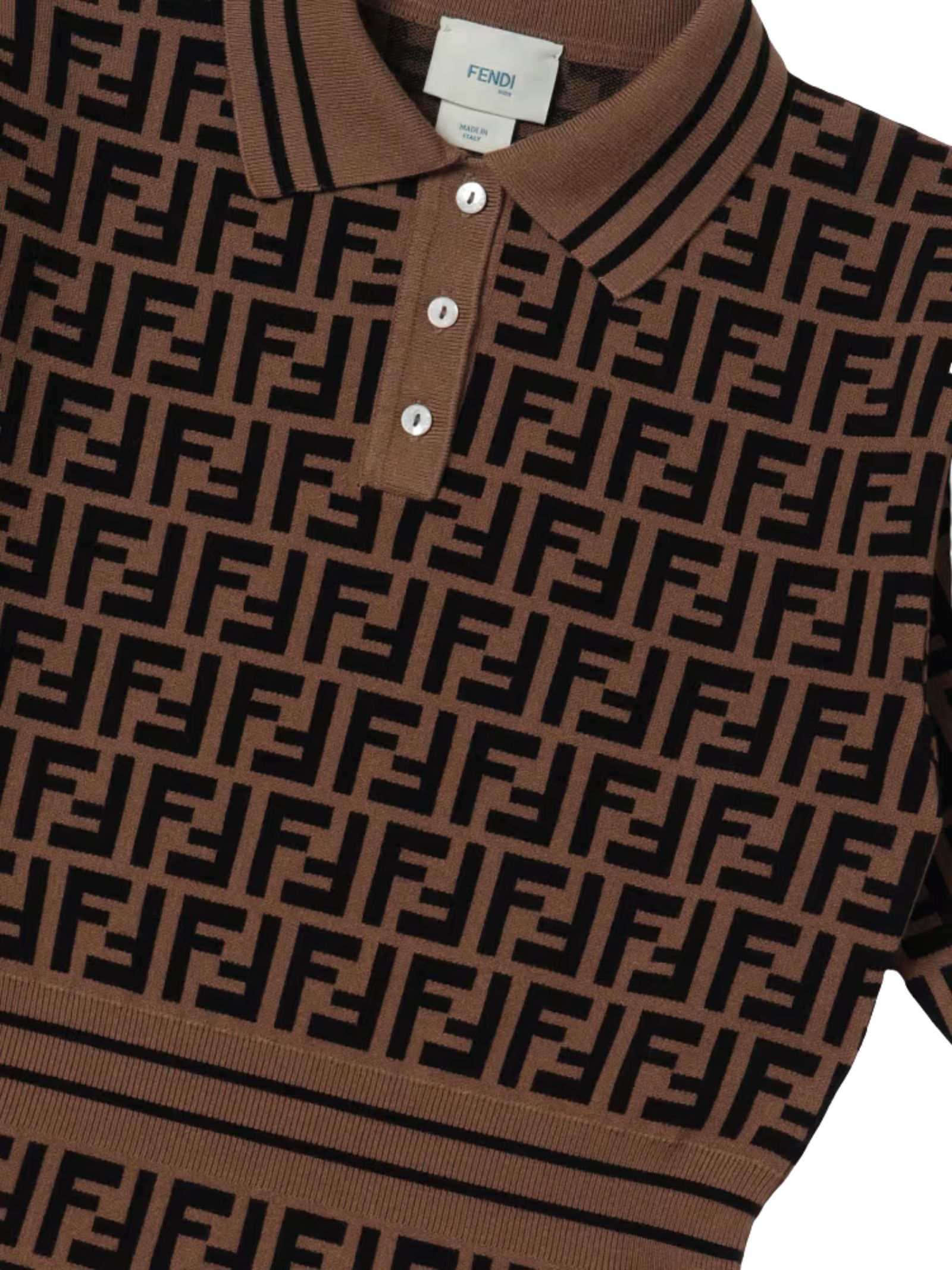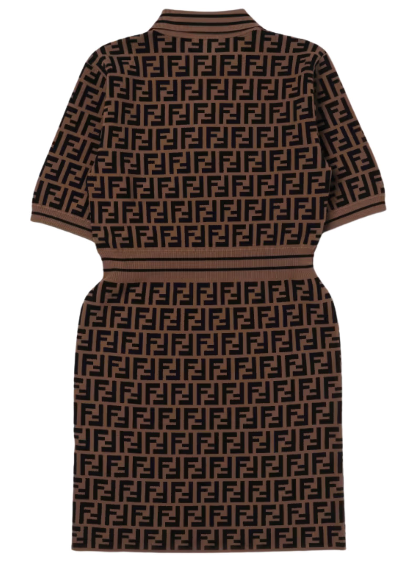 Fendi Junior brown dress featuring an all-over FF motif, buttoned collar, short sleeves, an elastic waistband, and elasticated ribbed hems. Composition: 67% viscose, 33% nylon. Made in Italy.