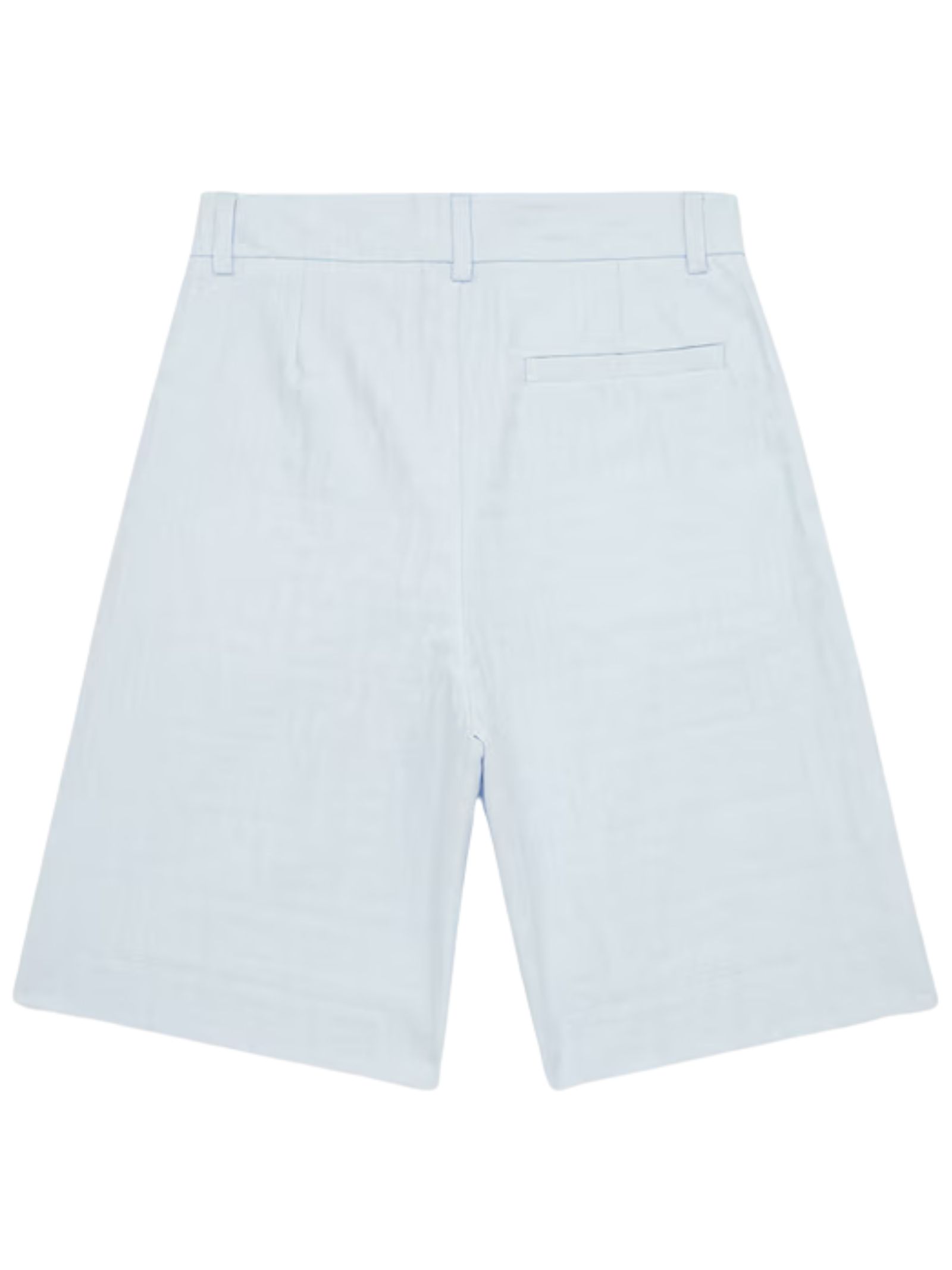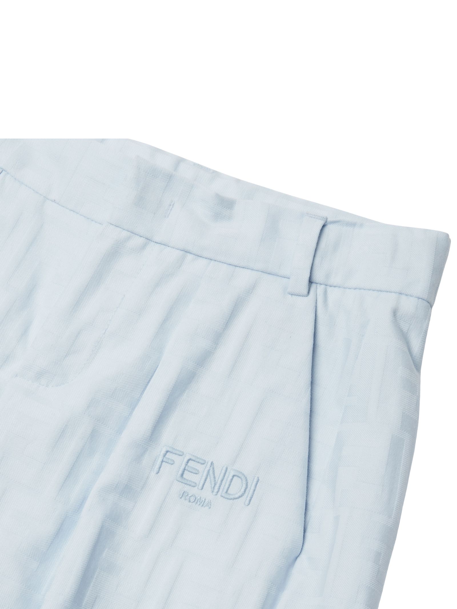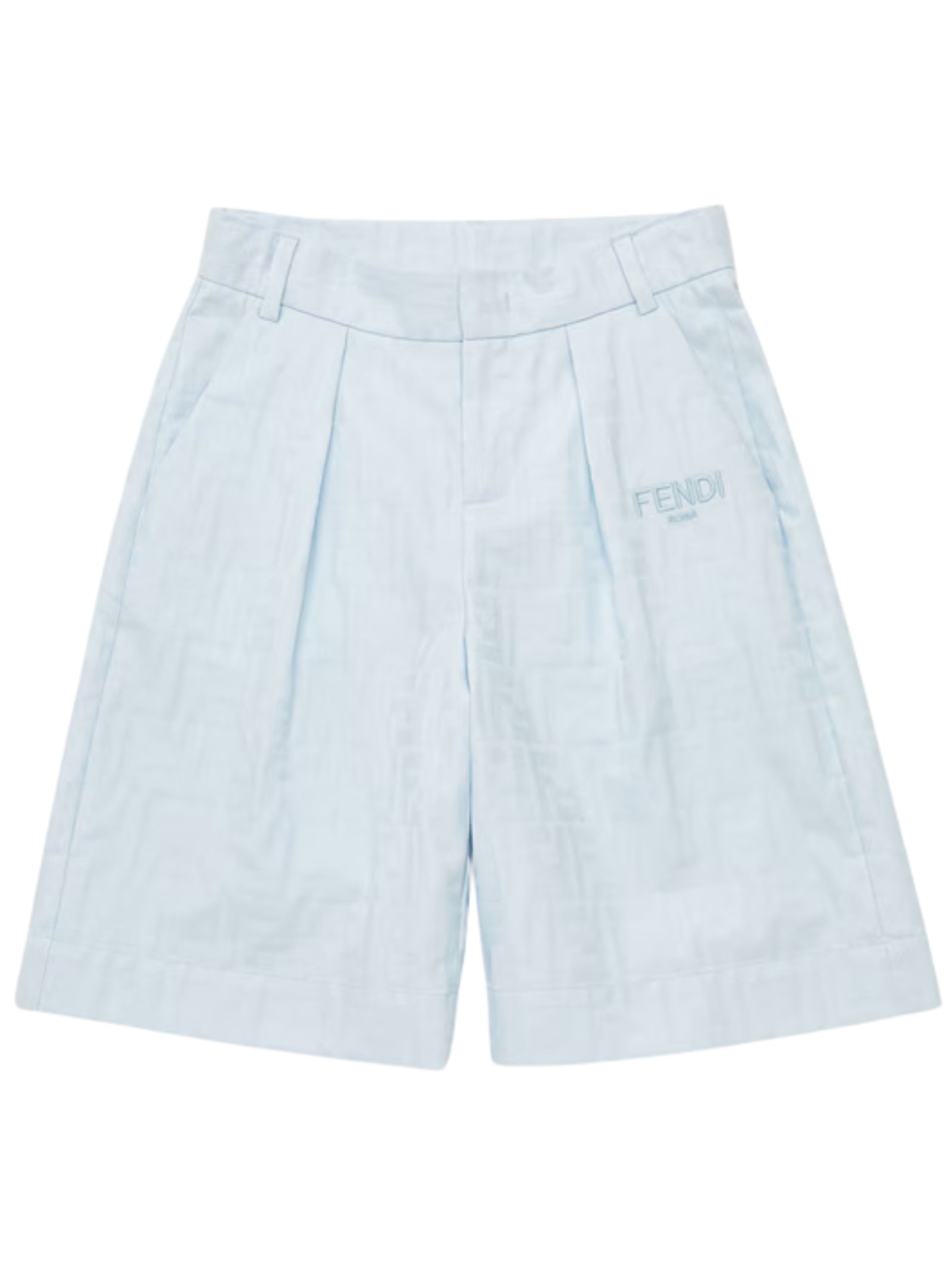 Fendi Kids light blue Bermuda shorts with all-over FF logo, belt loops, front zip and button closure, two side welt pockets, one back pocket, and embroidered logo. Composition: 100% cotton. Made in Italy.
