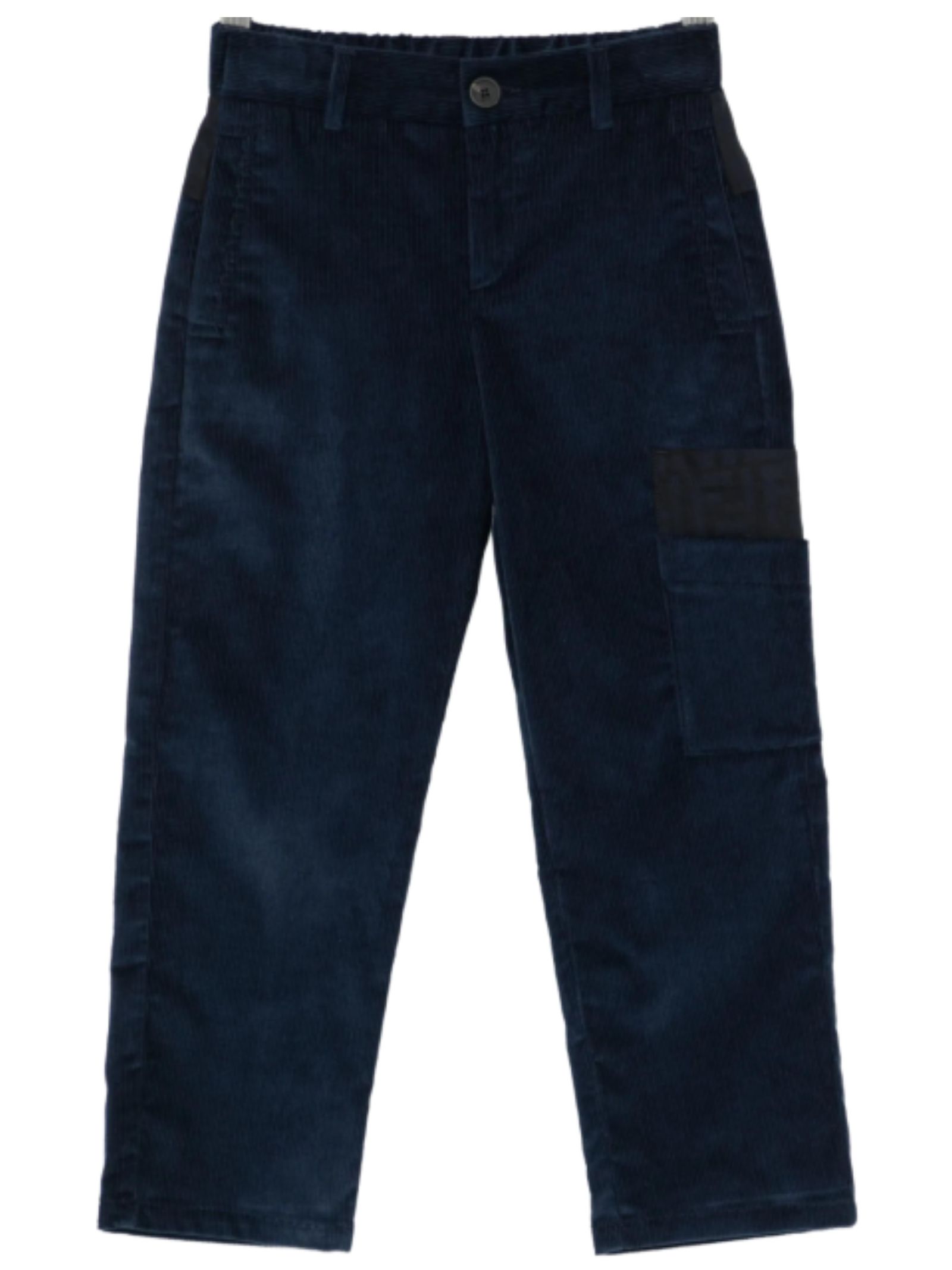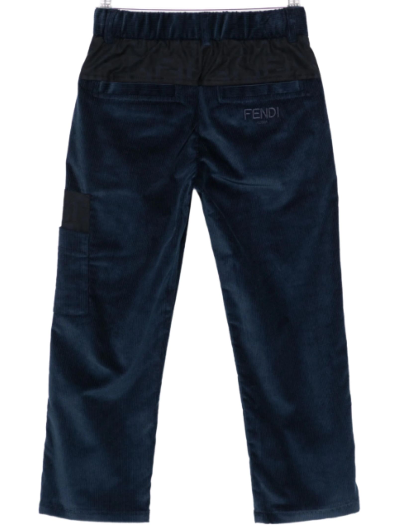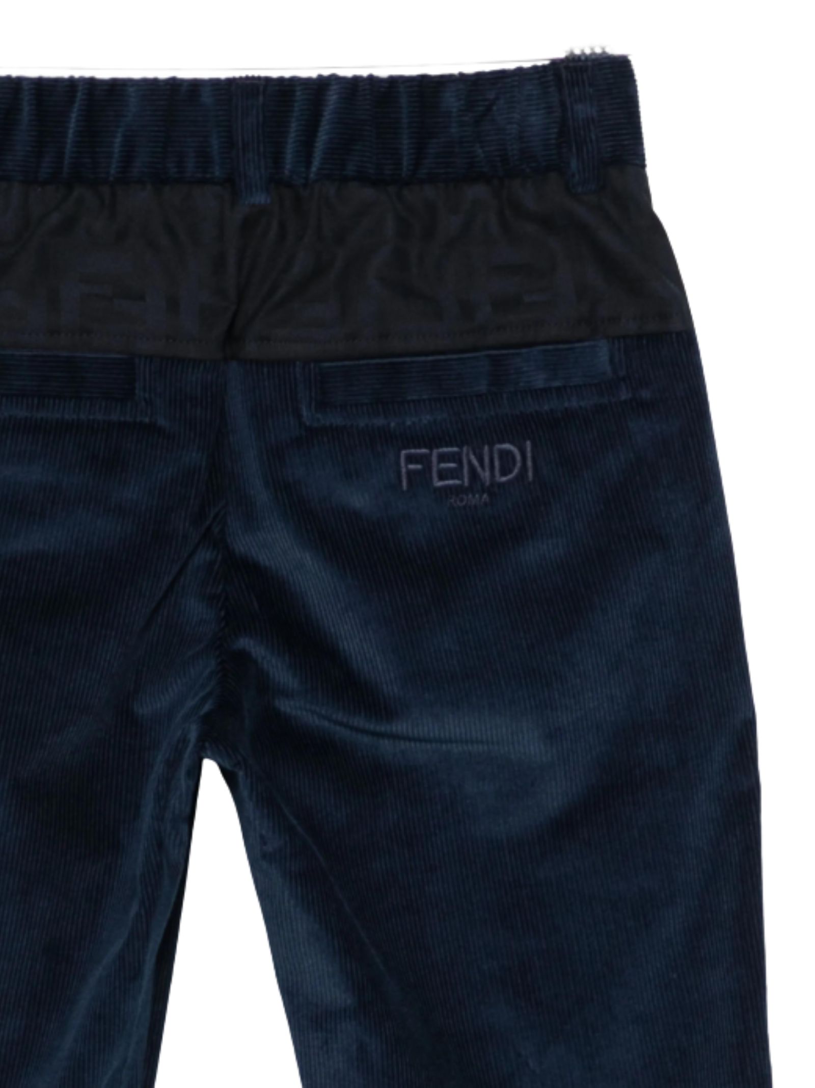 FENDI Kids blue trousers made of soft corduroy, regular waist, multi-pockets, contrasting FF logo, regular fit. Composition: 98% cotton, 2% elastane. Made in Italy.