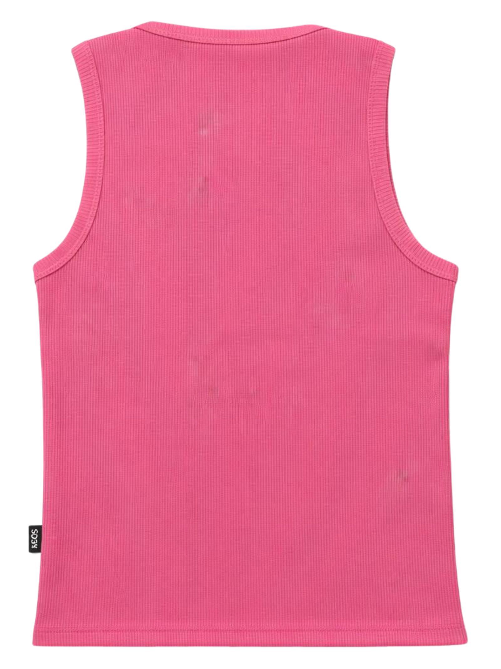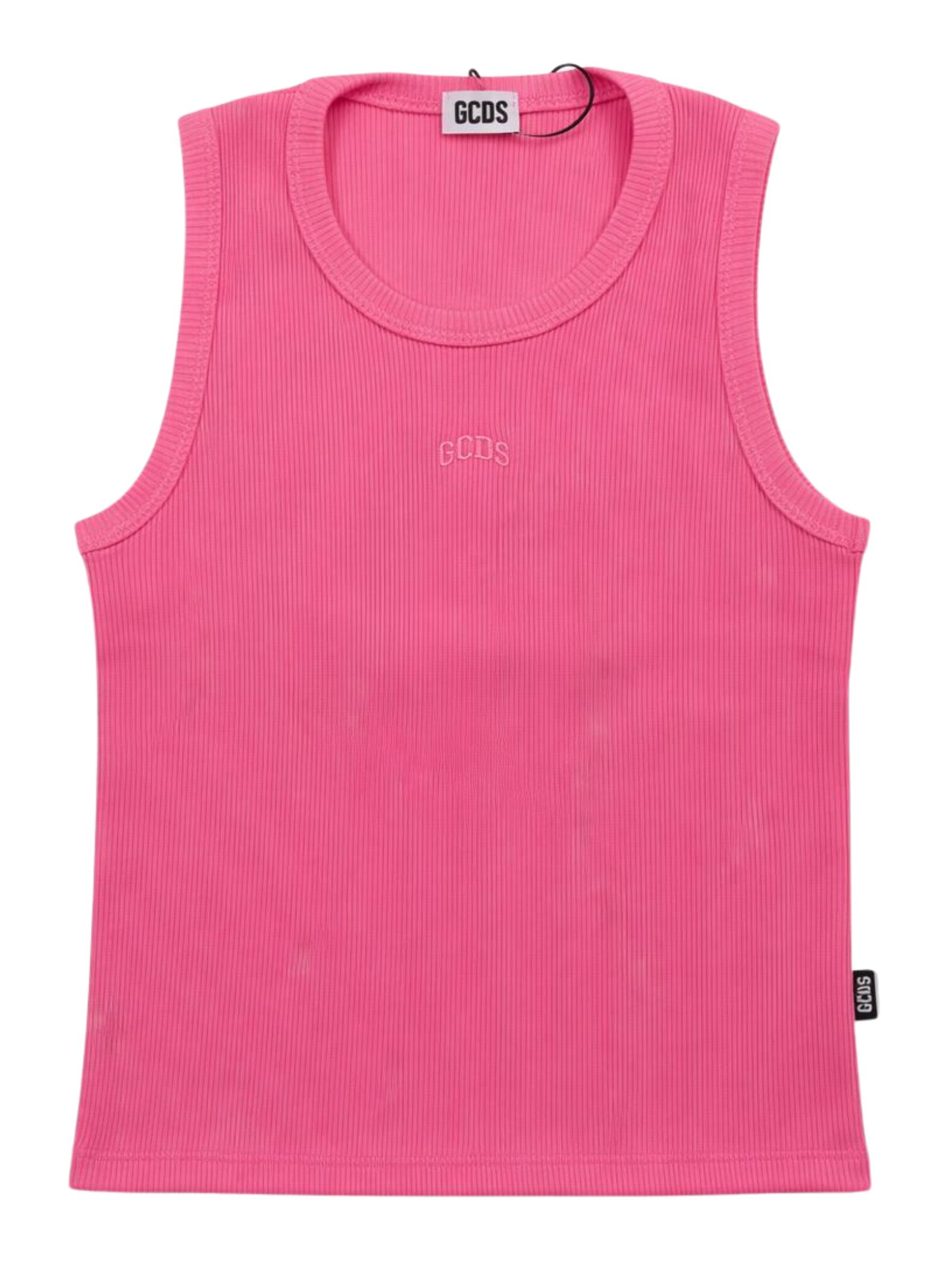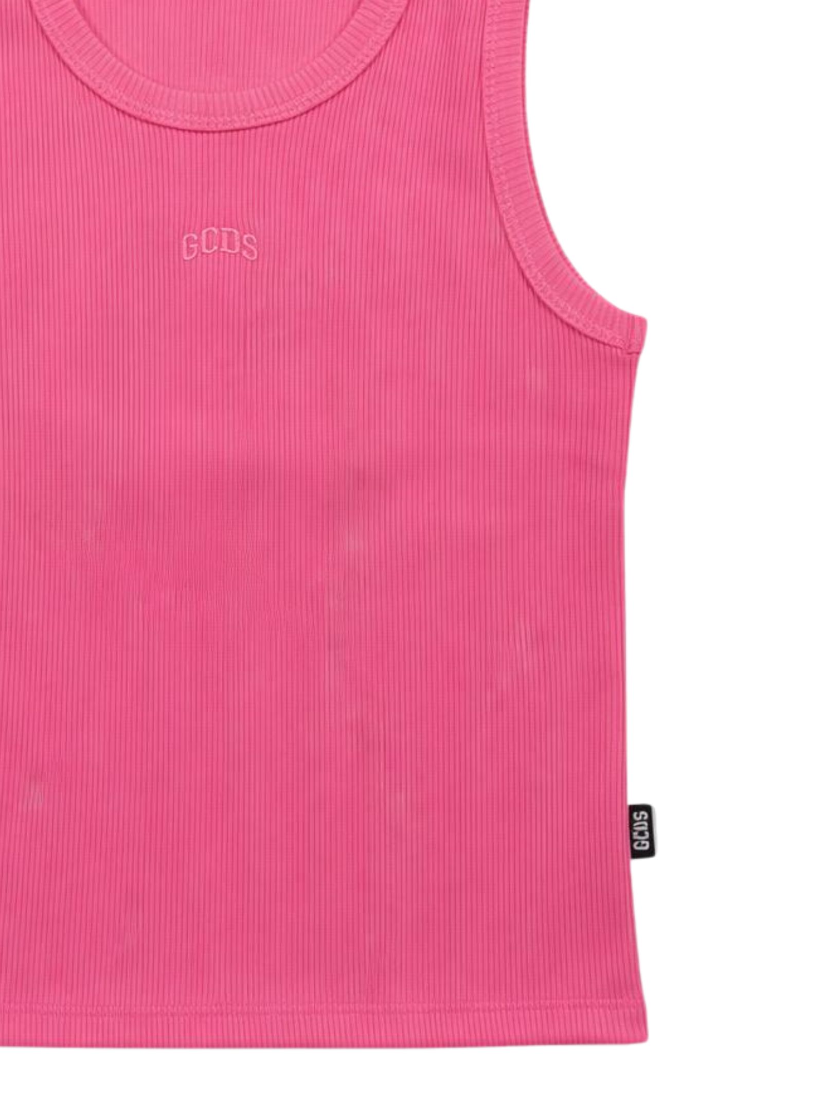 GCDS Kids pink ribbed tank top with crew neck, central logo embroidery, and a fitted design. Composition: 95% cotton, 5% elastane. Made in Italy.