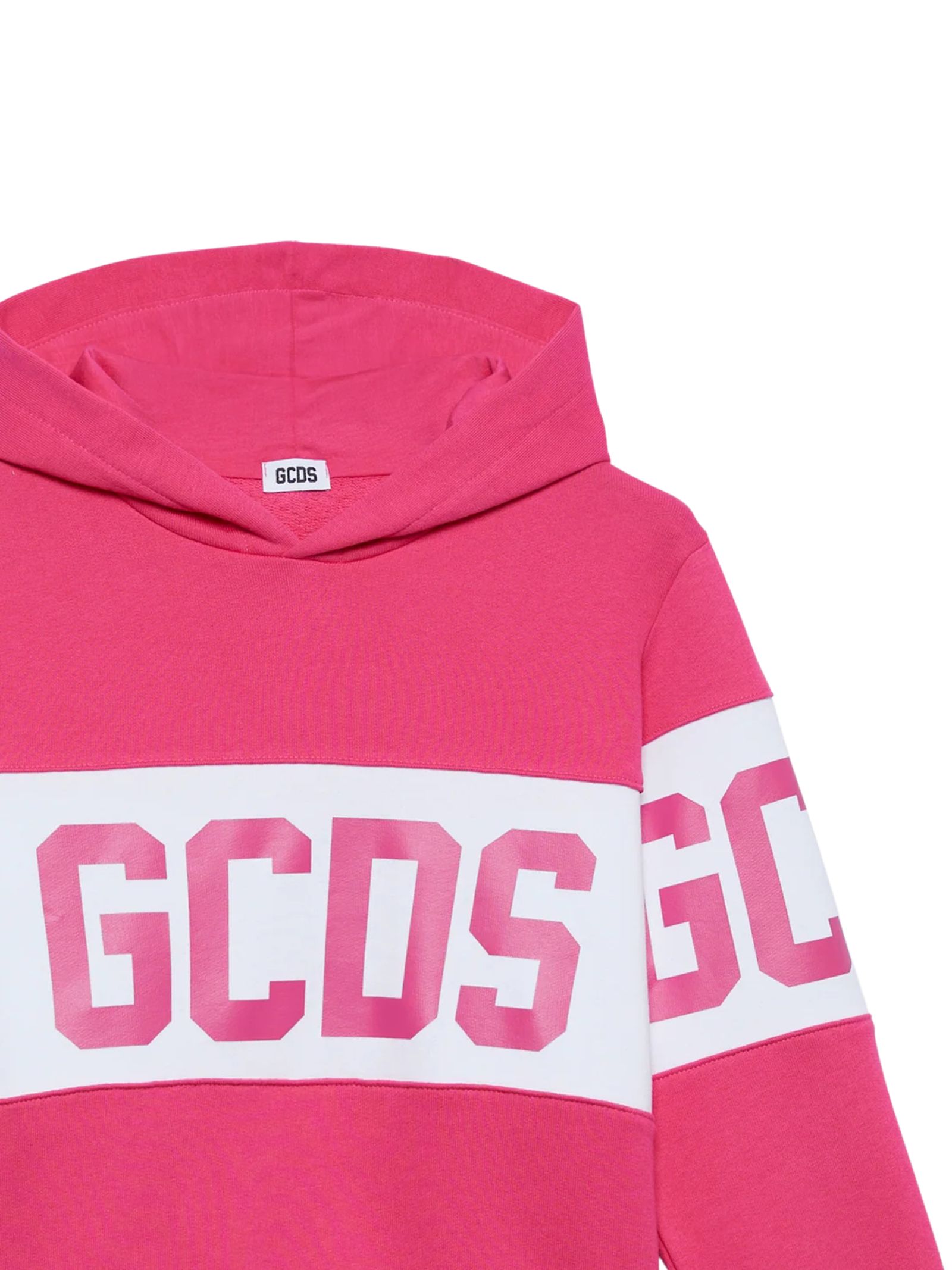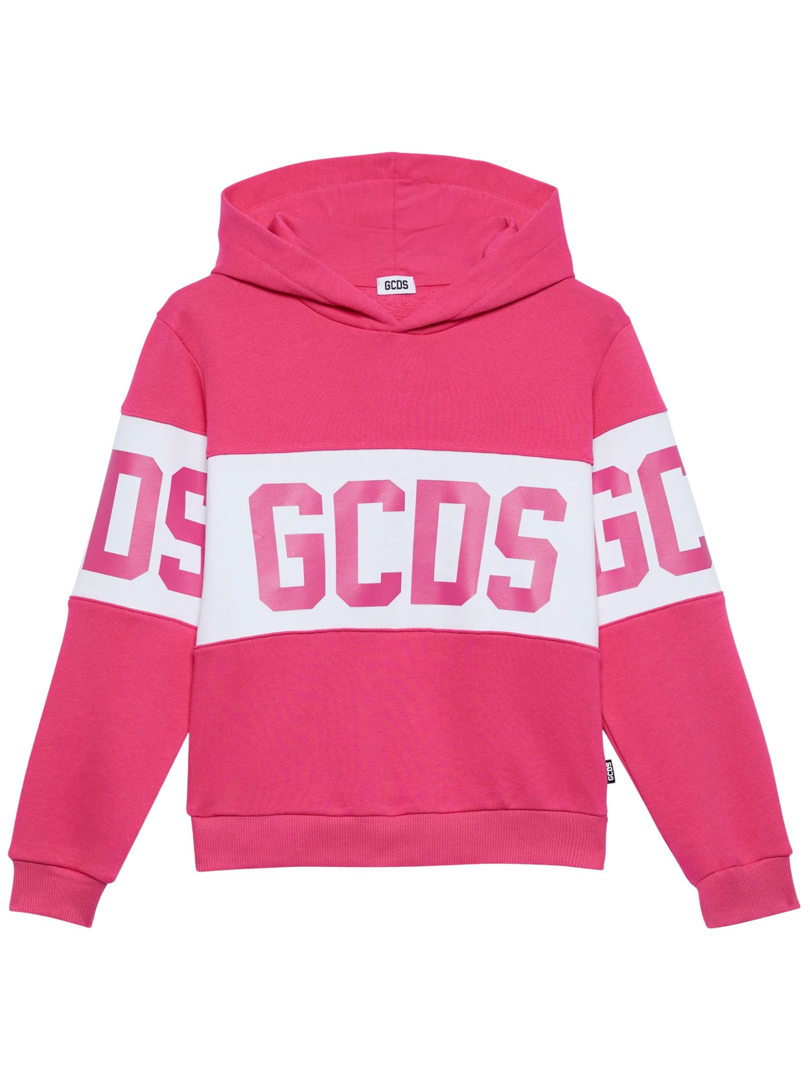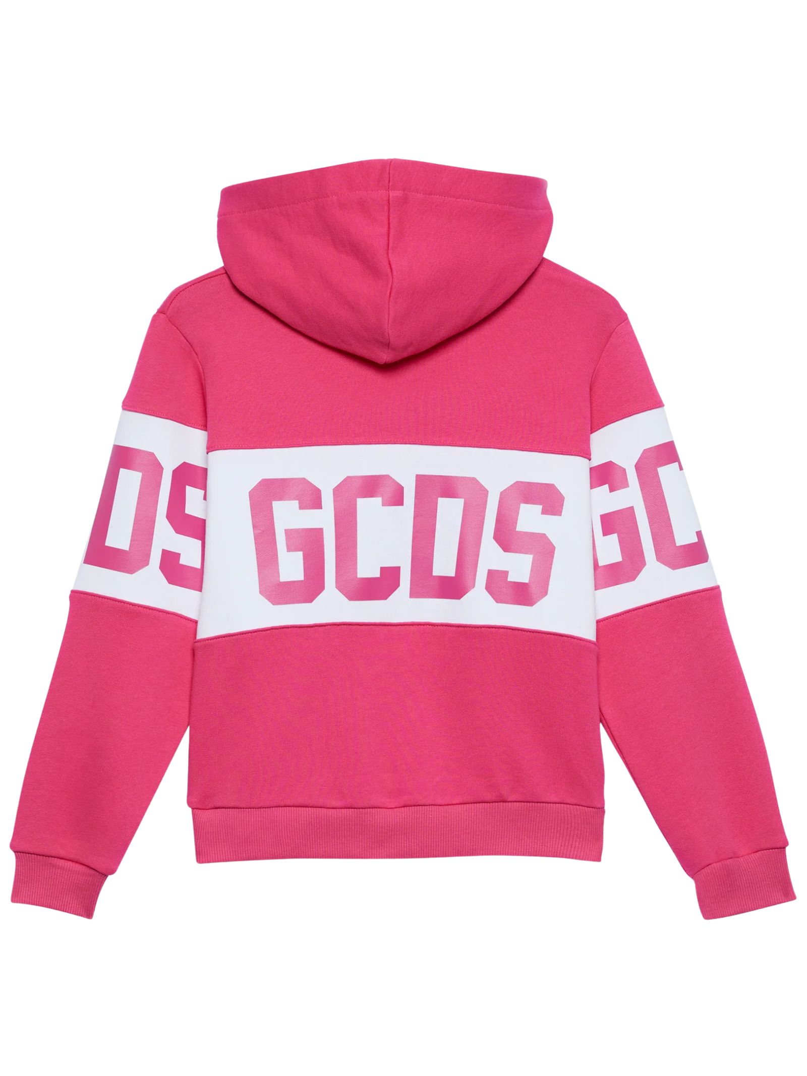 GCDS Kids fuchsia sweatshirt with contrasting white logo insert on both sides, hooded design, long sleeves, ribbed cuffs, regular fit. Composition: 100% cotton. Made in Italy.