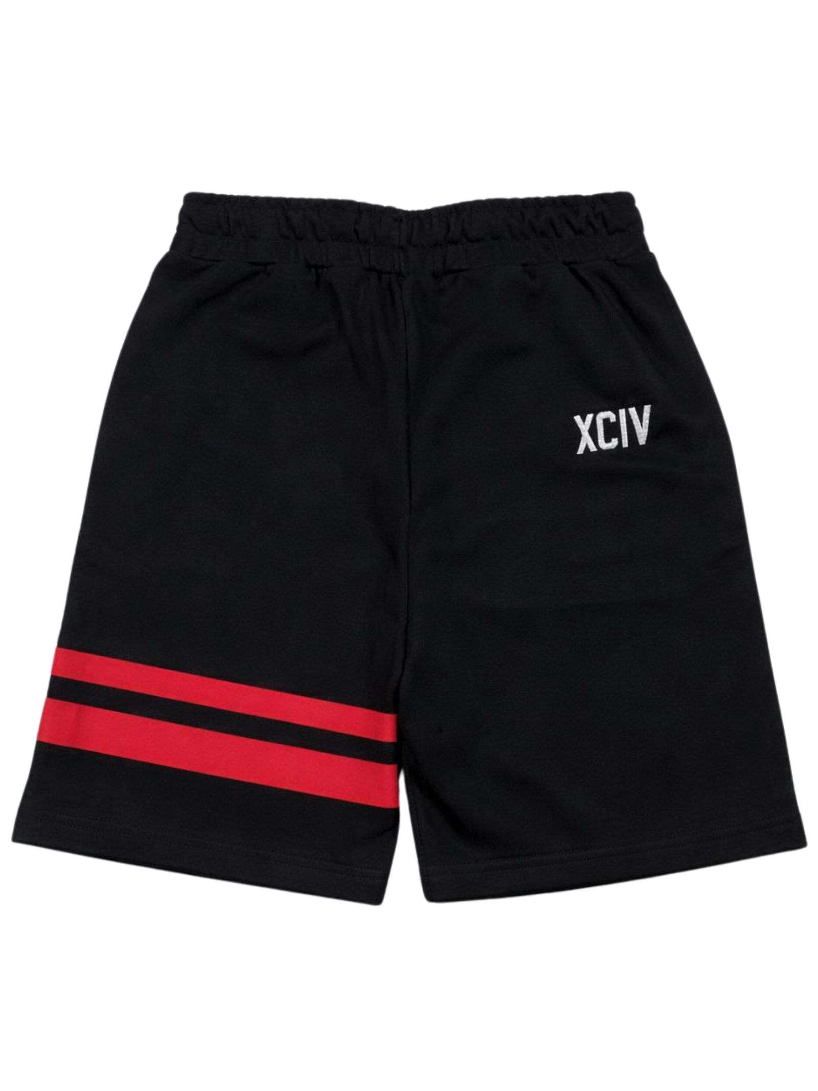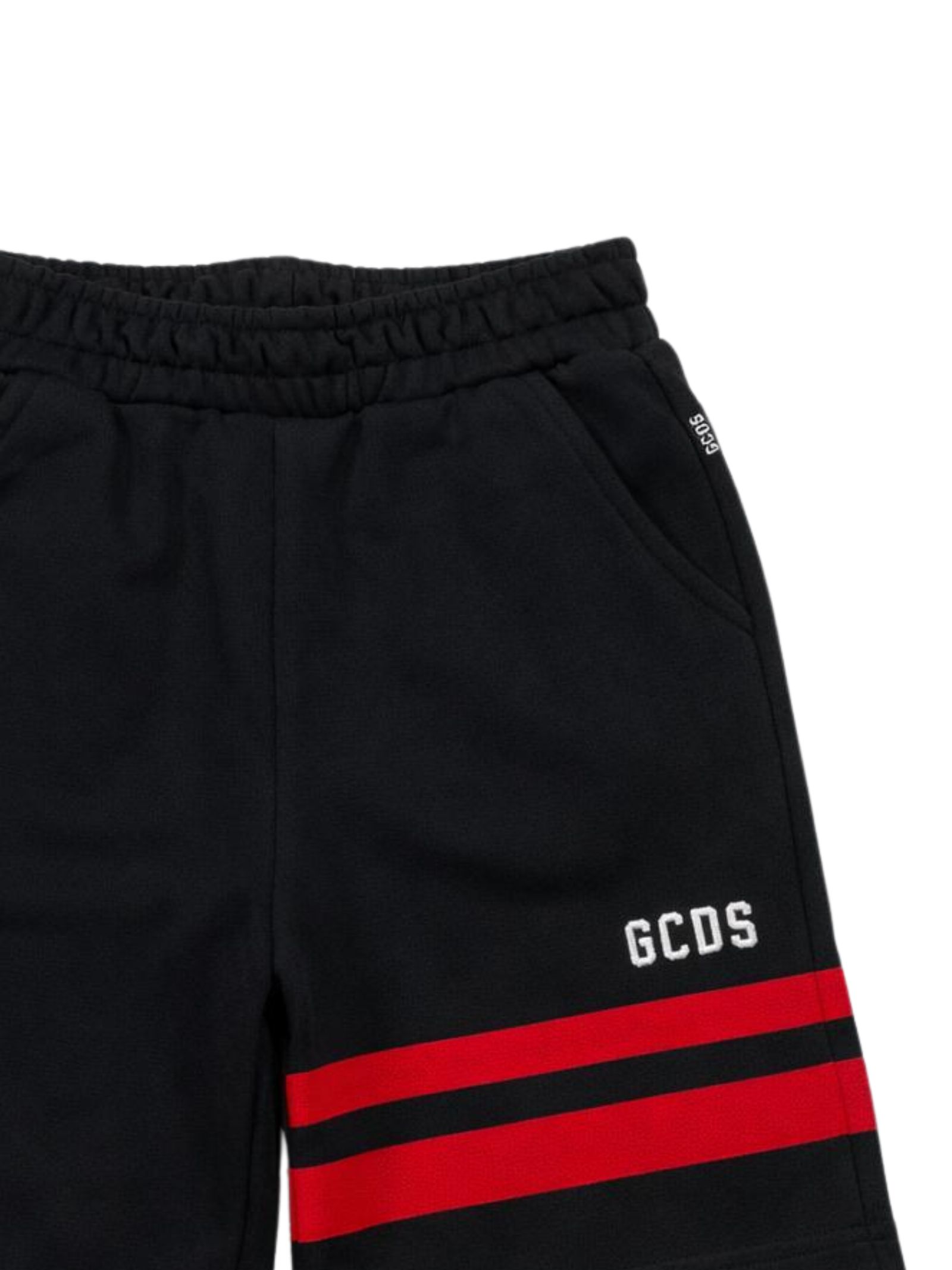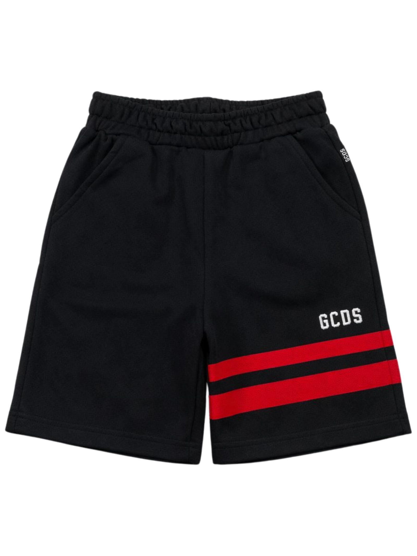 GCDS Kids black Bermuda shorts with an elastic waist, featuring the classic contrasting red inlay band on the front and back, two side pockets, and a regular fit. Composition: 87% cotton, 13% polyester. Made in Italy.