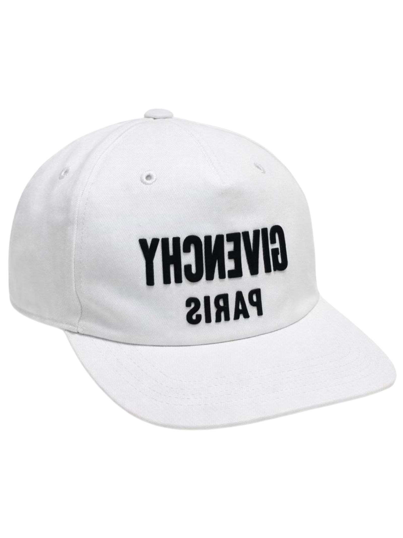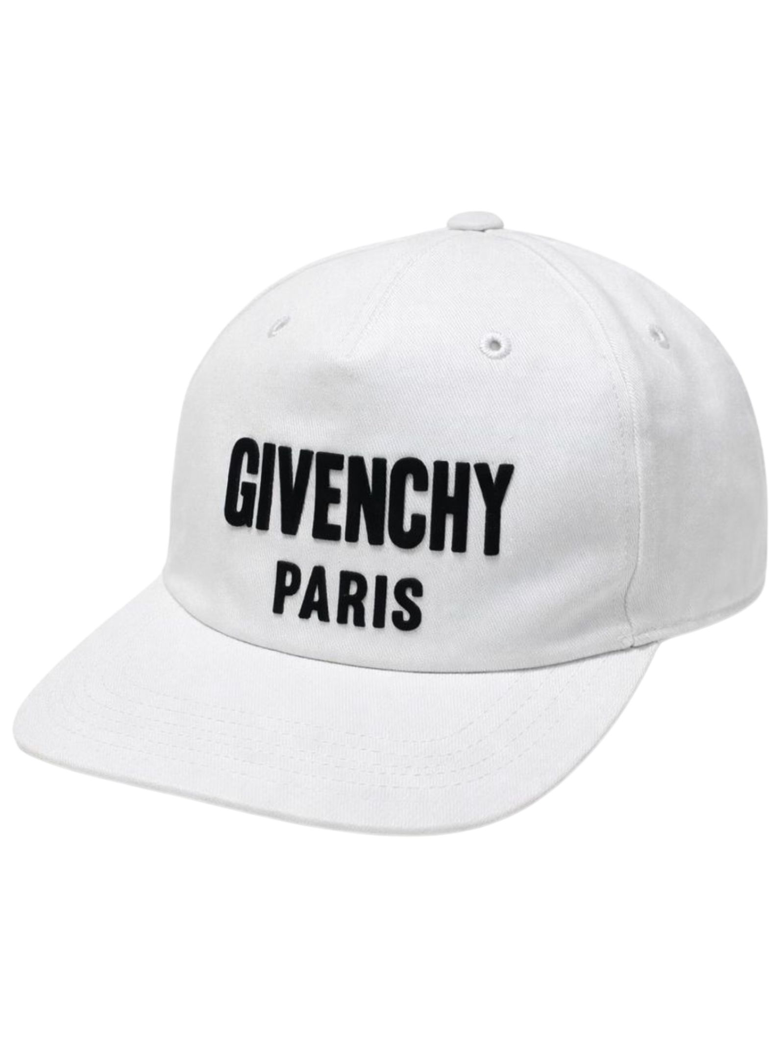 Givenchy Kids white peaked cap featuring a contrasting black logo on the front and an adjustable design. Composition: 100% cotton. Made in Italy.