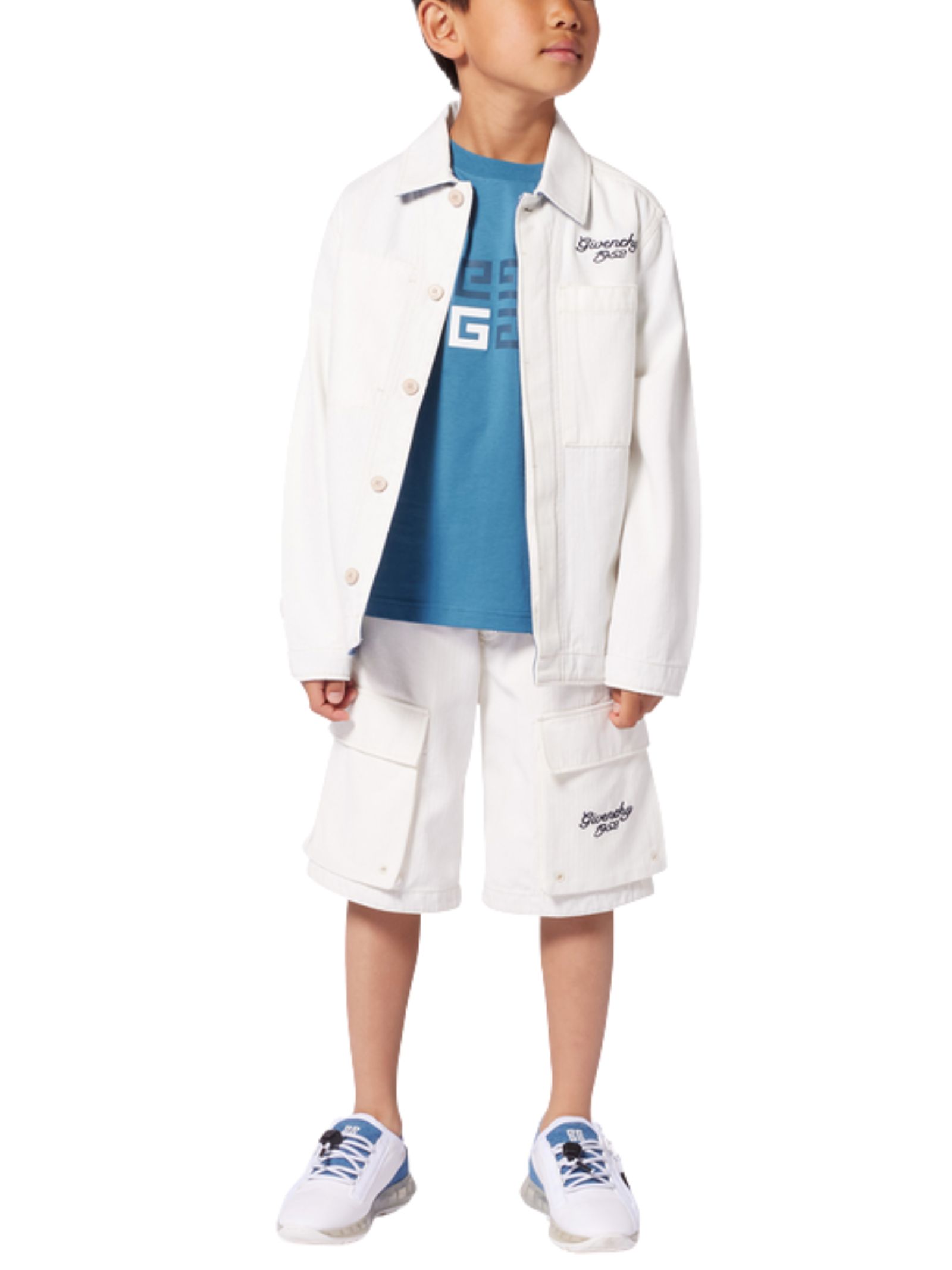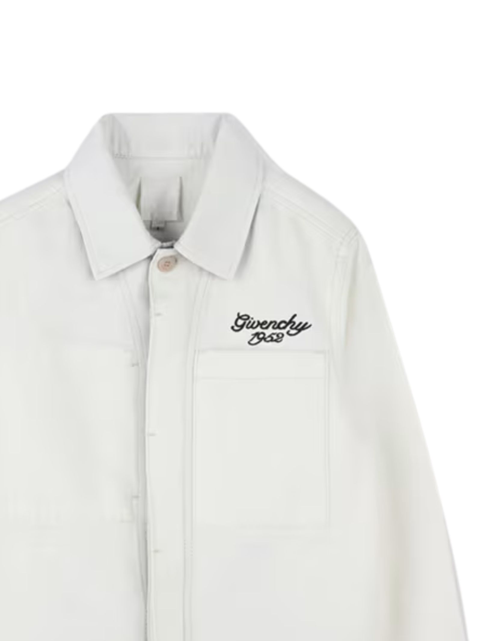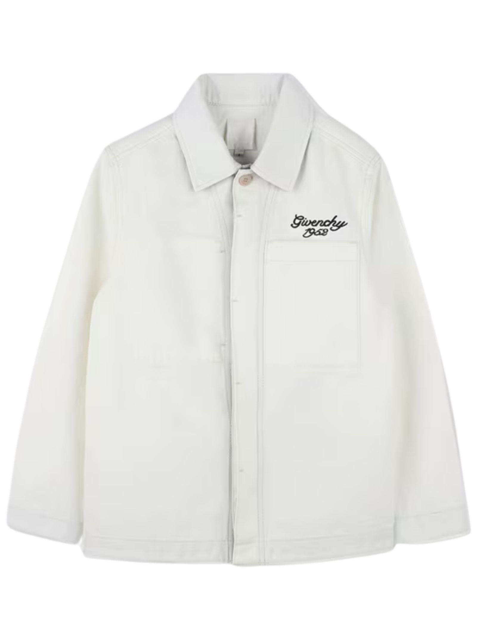 Givenchy Kids sand-colored denim cotton shirt, long sleeves, classic collar, front button closure, one chest pocket, embroidered logo on the chest, regular fit. Composition: 100% cotton.