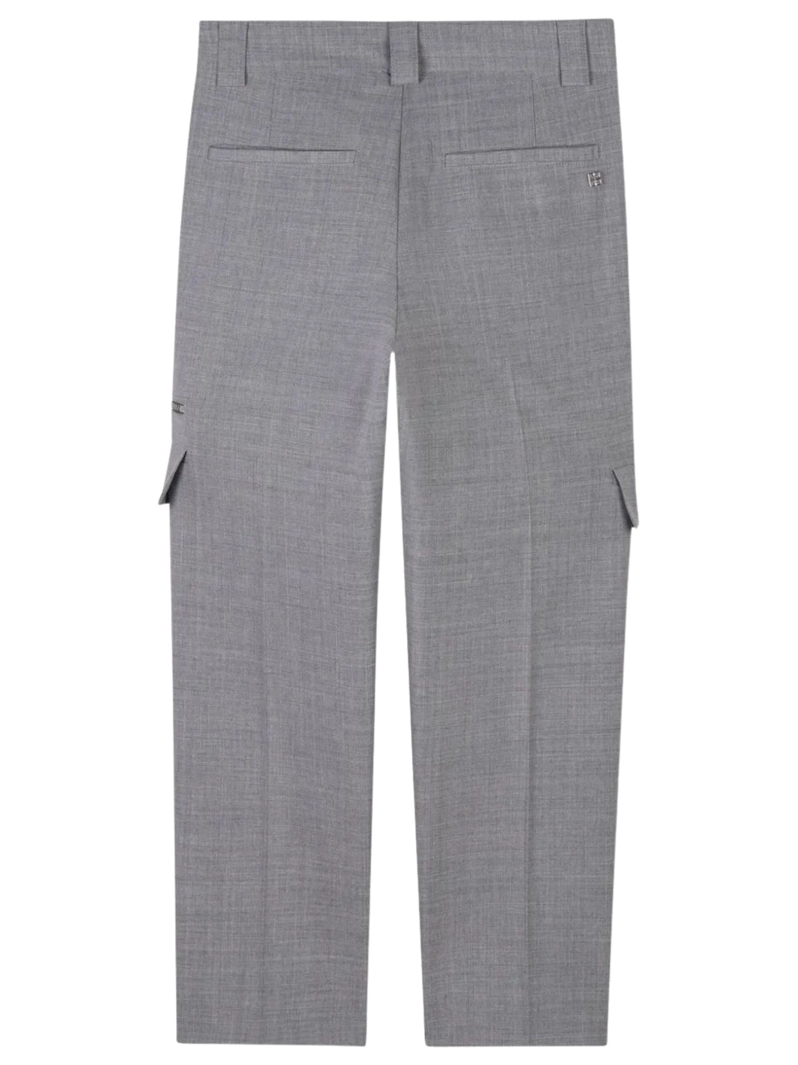 Givenchy Kids gray formal trousers made of cool stretch wool, featuring a regular waist, multiple pockets, a metal logo on the waist, and internal lining. Composition: 55% polyester, 43% wool, 2% elastane. Lining: 100% polyester.