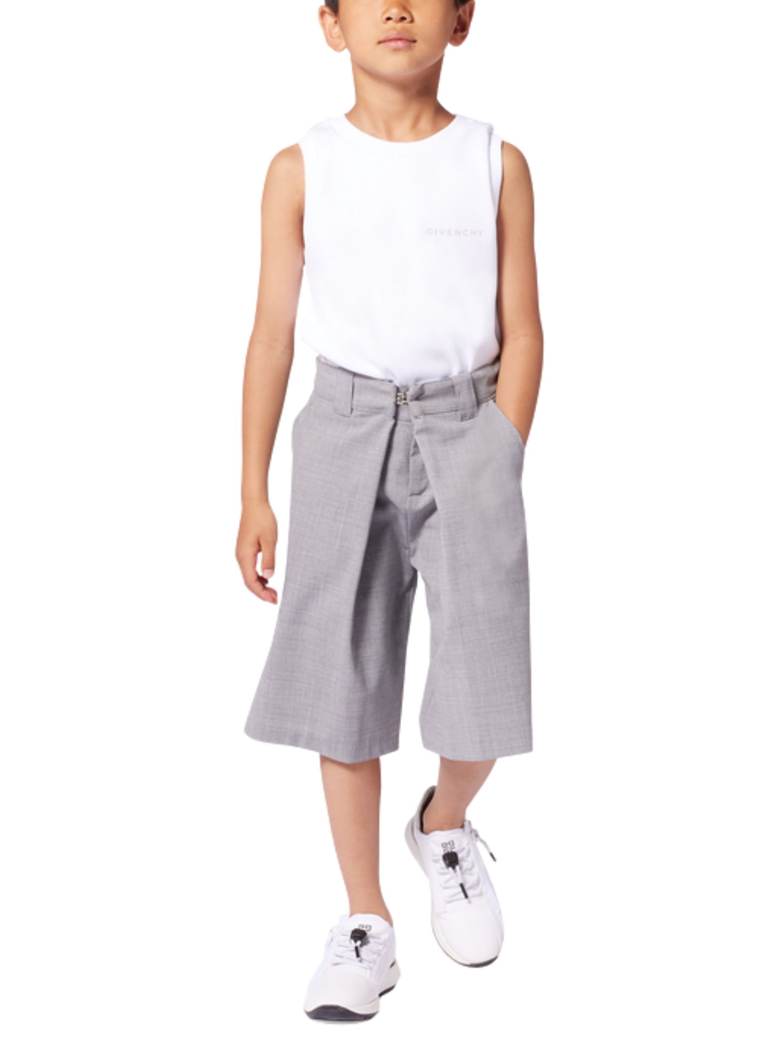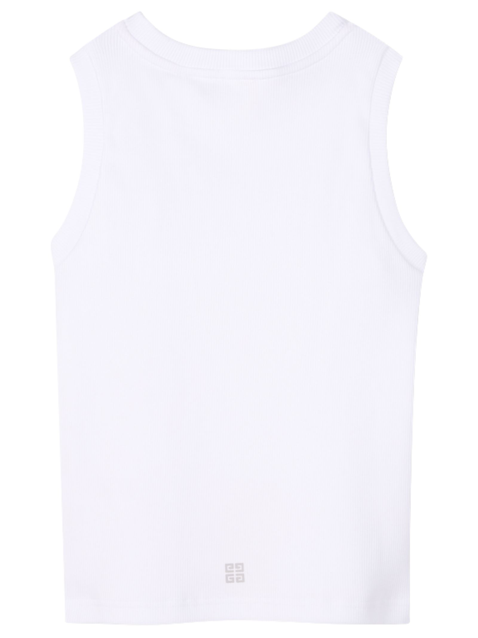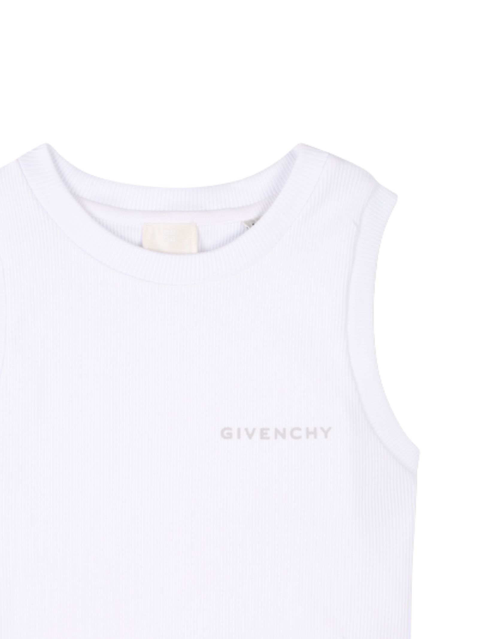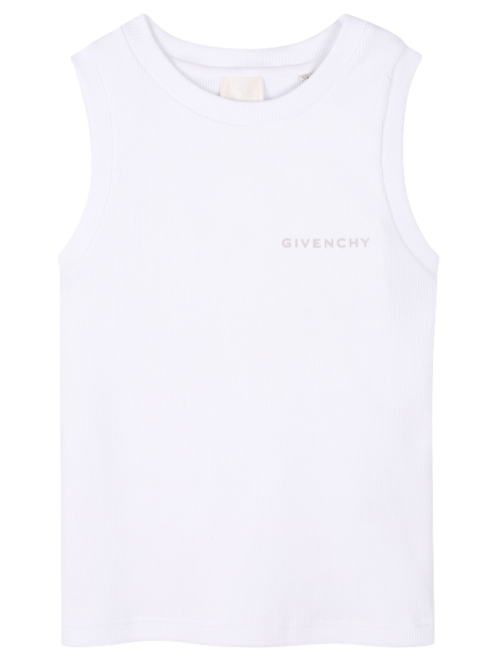 Givenchy Kids white ribbed cotton tank top with a crew neck, contrasting logo print on the chest, straight hem, and a fitted design. Composition: 99% cotton, 1% elastane.