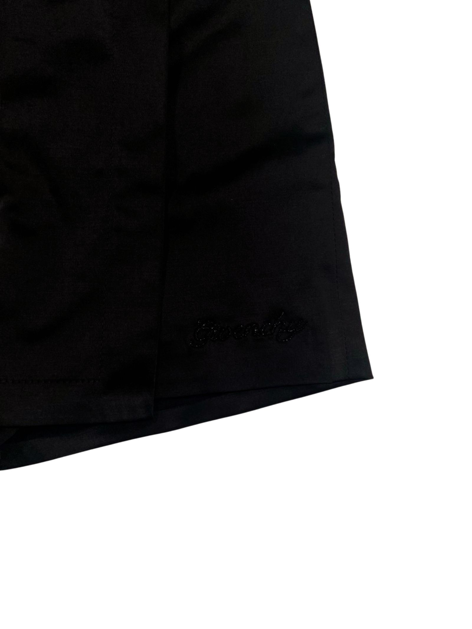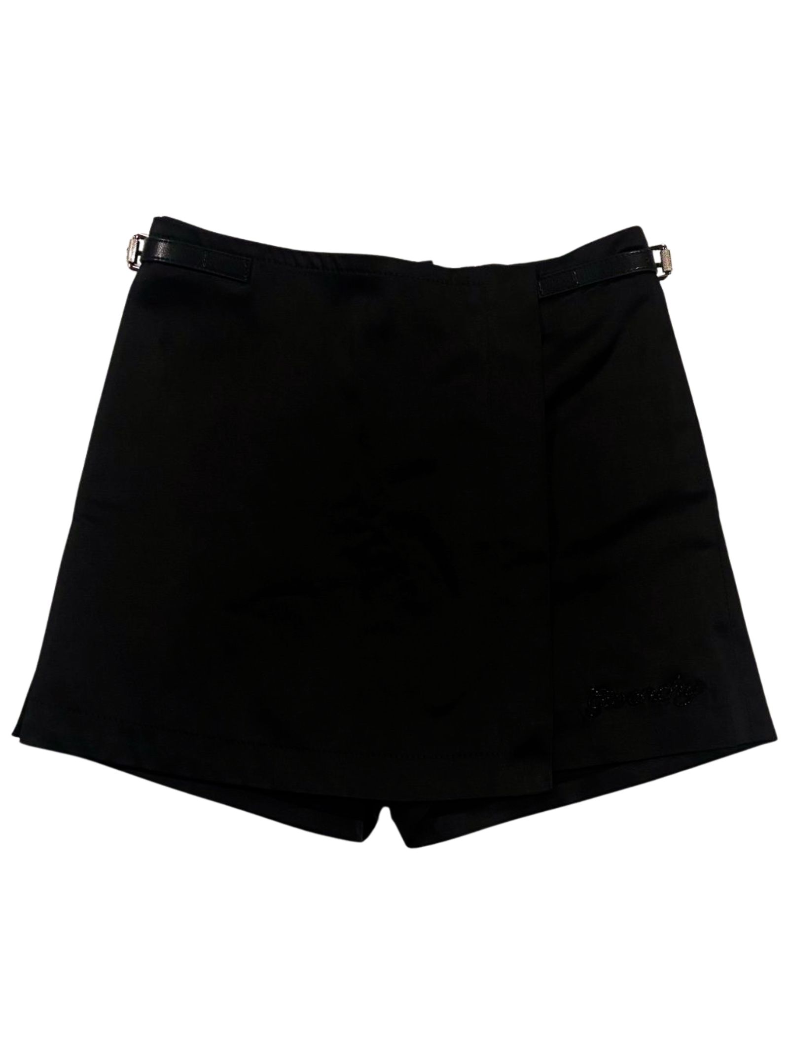 Givenchy Kids black shorts, made from a soft satin-effect blend, featuring a skirt design, an elasticated waist at the back, side buckles, and logo embroidery. Composition: 58% polyester, 39% cotton, 3% elastane.