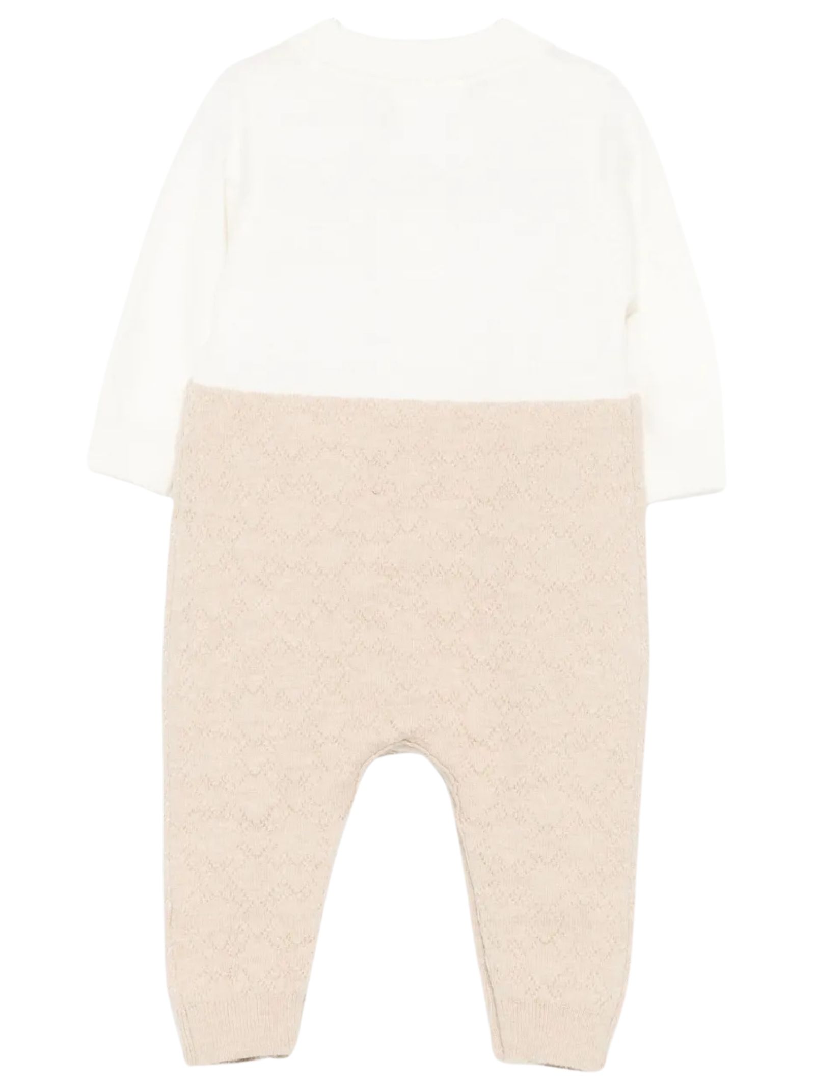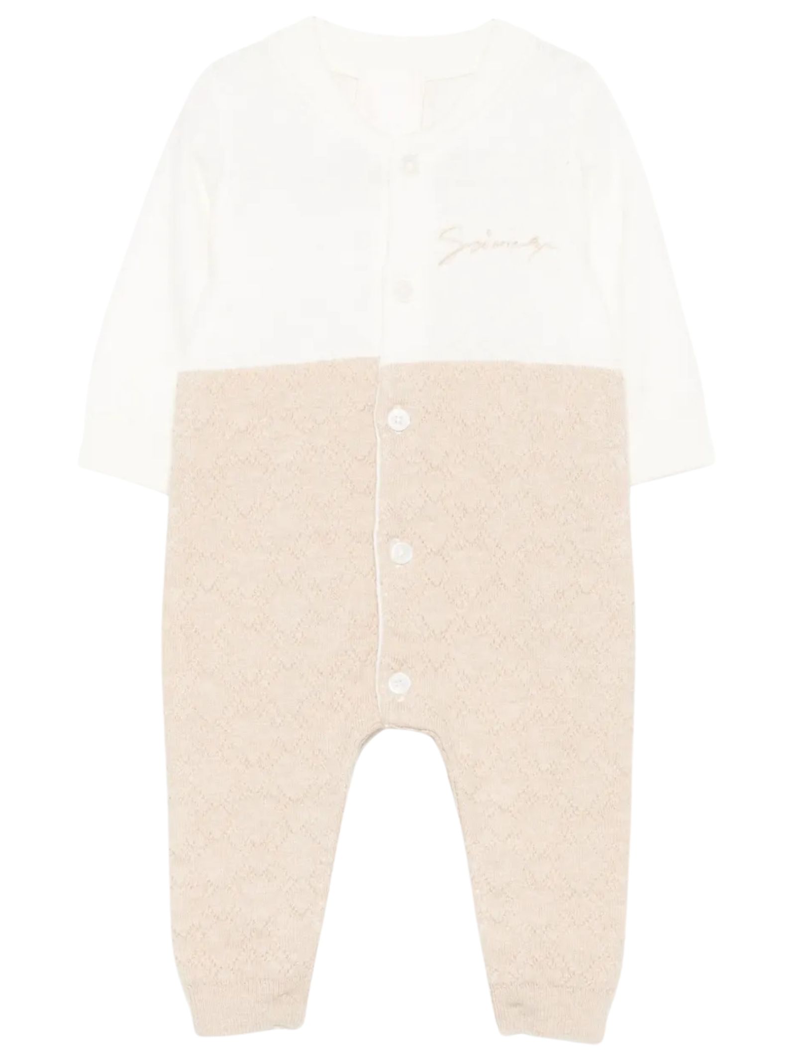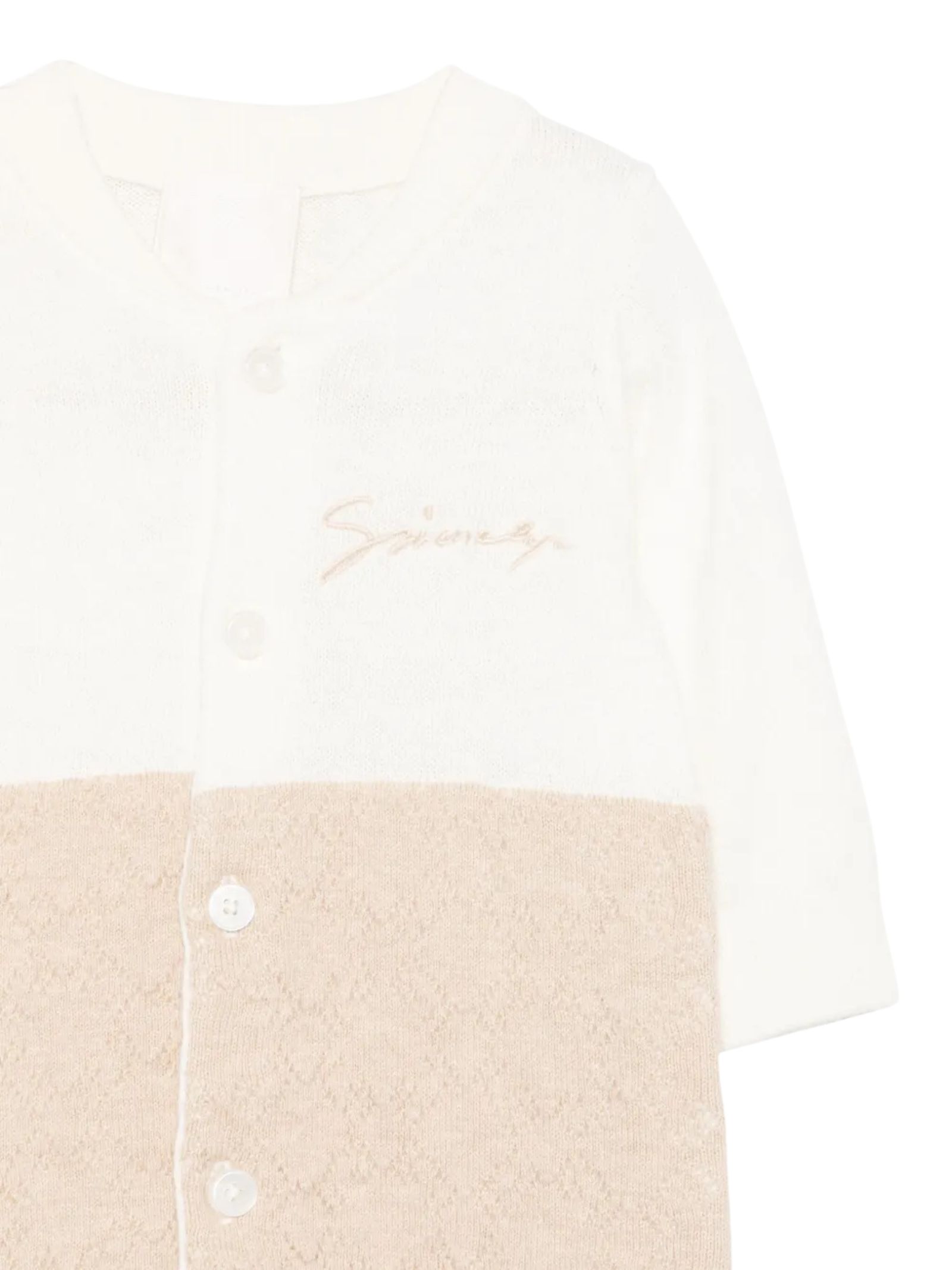 Givenchy Kids beige/cream onesie, made of soft knit, crew neck, long sleeves, contrasting embroidered logo on the chest, ribbed hems, buttons on the front and at the crotch, regular fit. Composition: 95% cotton 5% cashmere.
