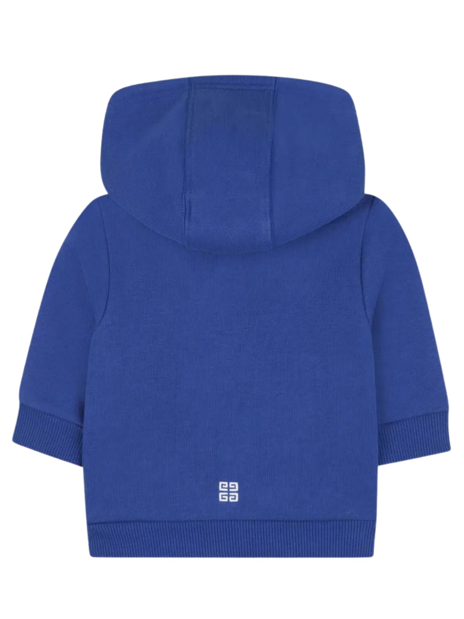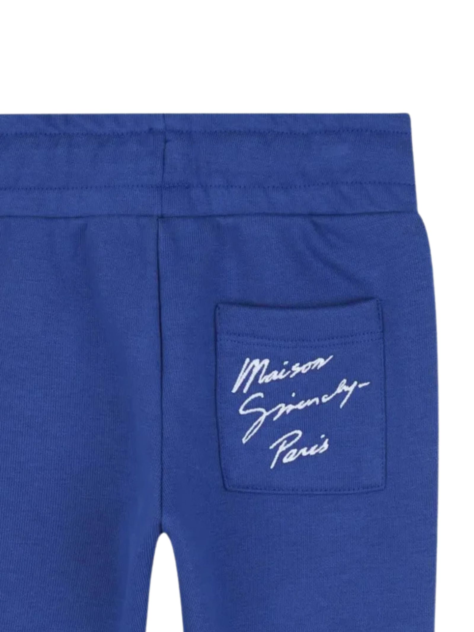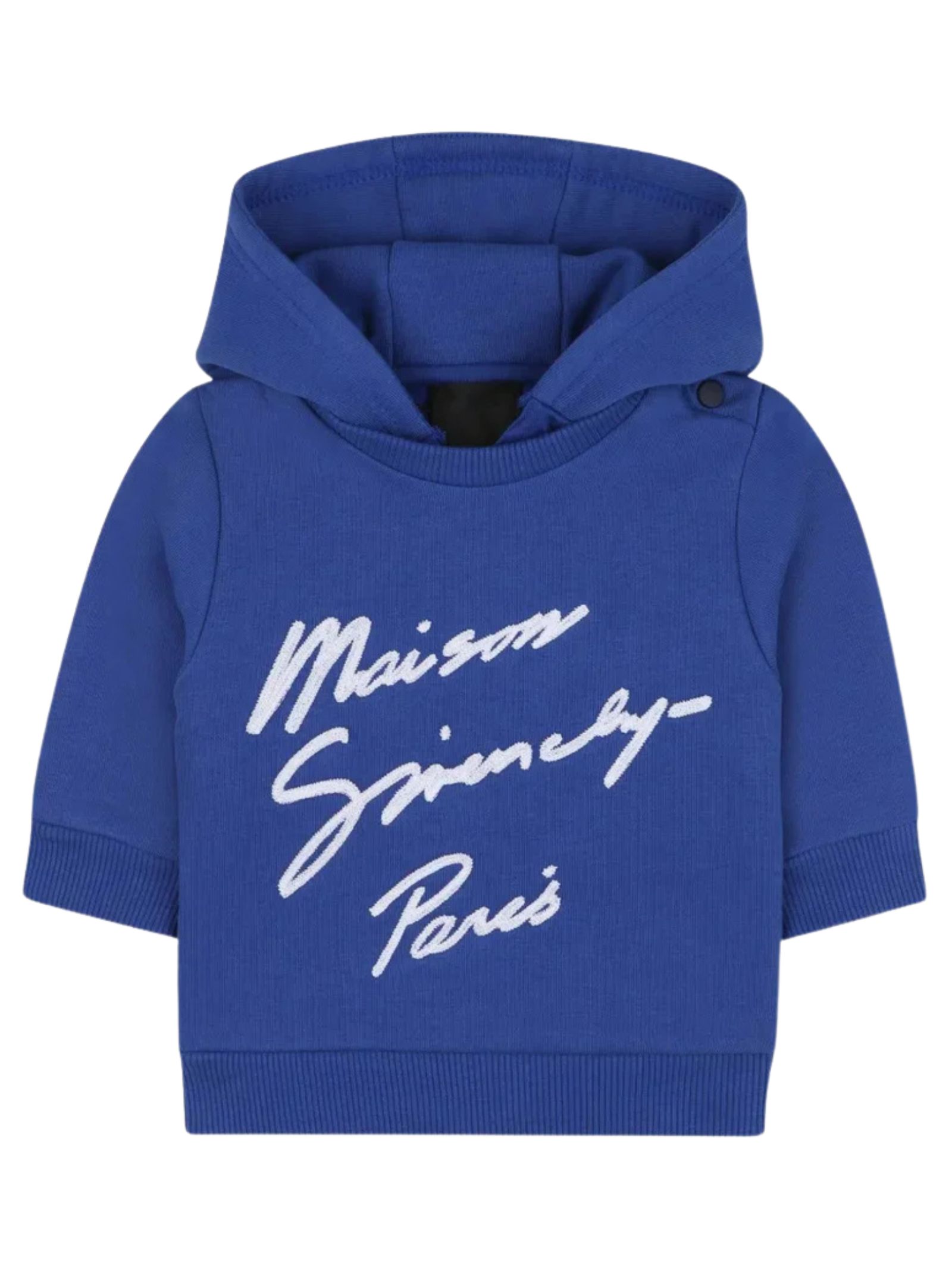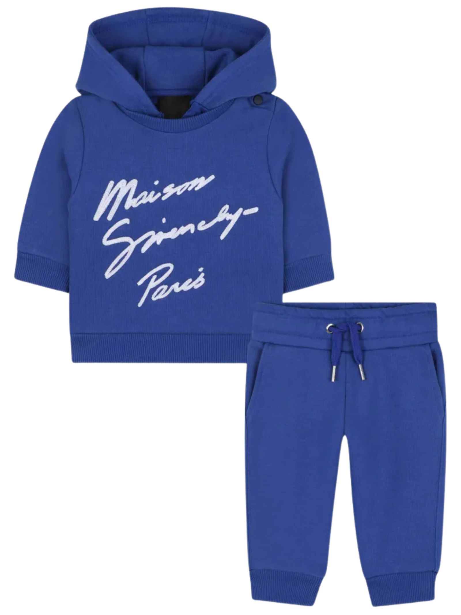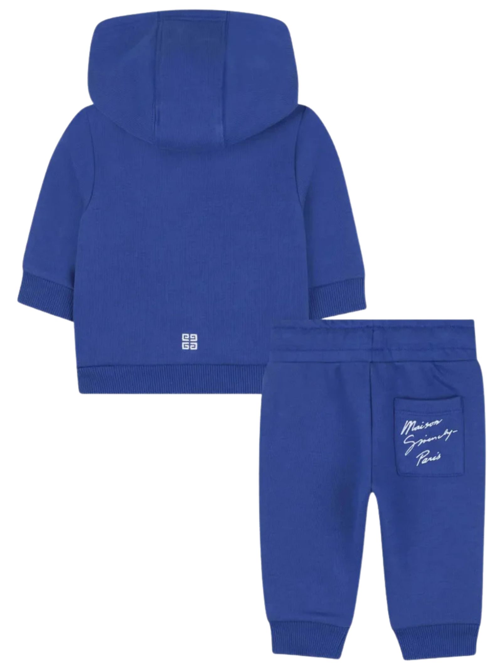 Givenchy Kids electric blue outfit, consisting of a hooded sweatshirt with long sleeves, two pockets, ribbed hem and cuffs, decorated with an embroidered logo, and matching trousers with an elastic waist and drawstring. Composition: 85% warm cotton, 15% polyester.