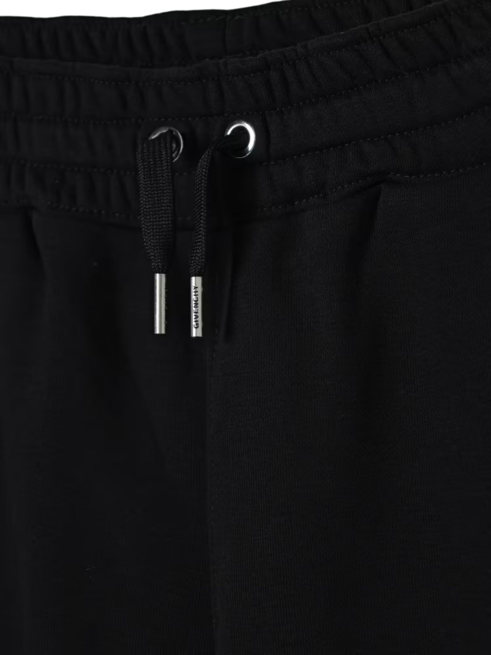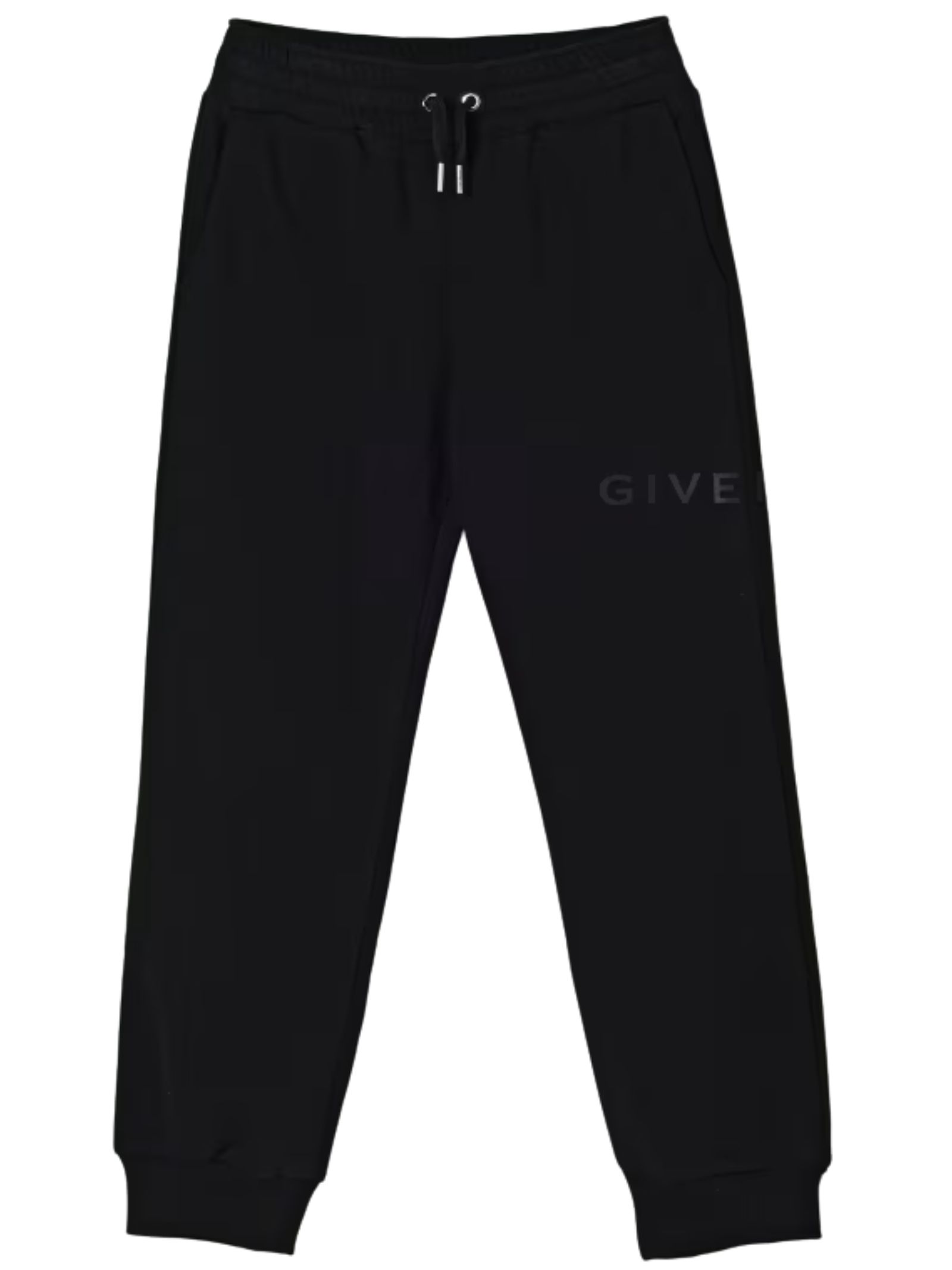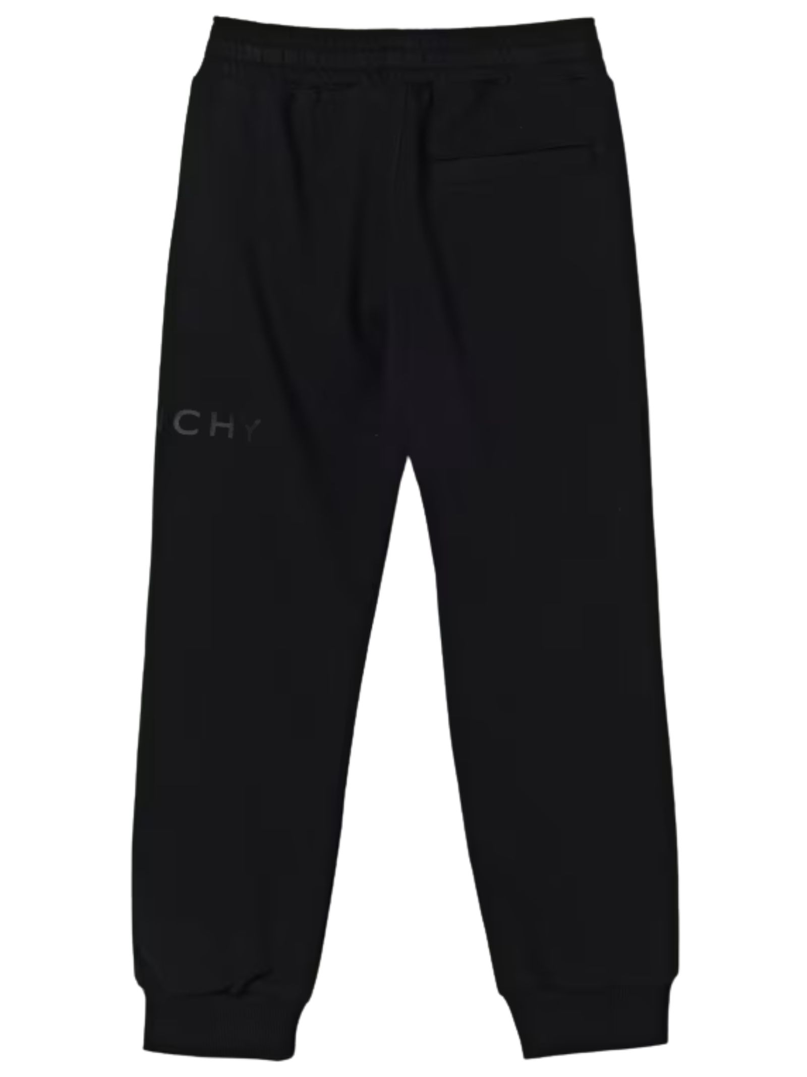 Givenchy Kids black trousers with an elasticated waist and drawstring, three pockets, a printed logo, elasticated ankles, and a regular fit. Composition: 85% cotton, 15% polyester.