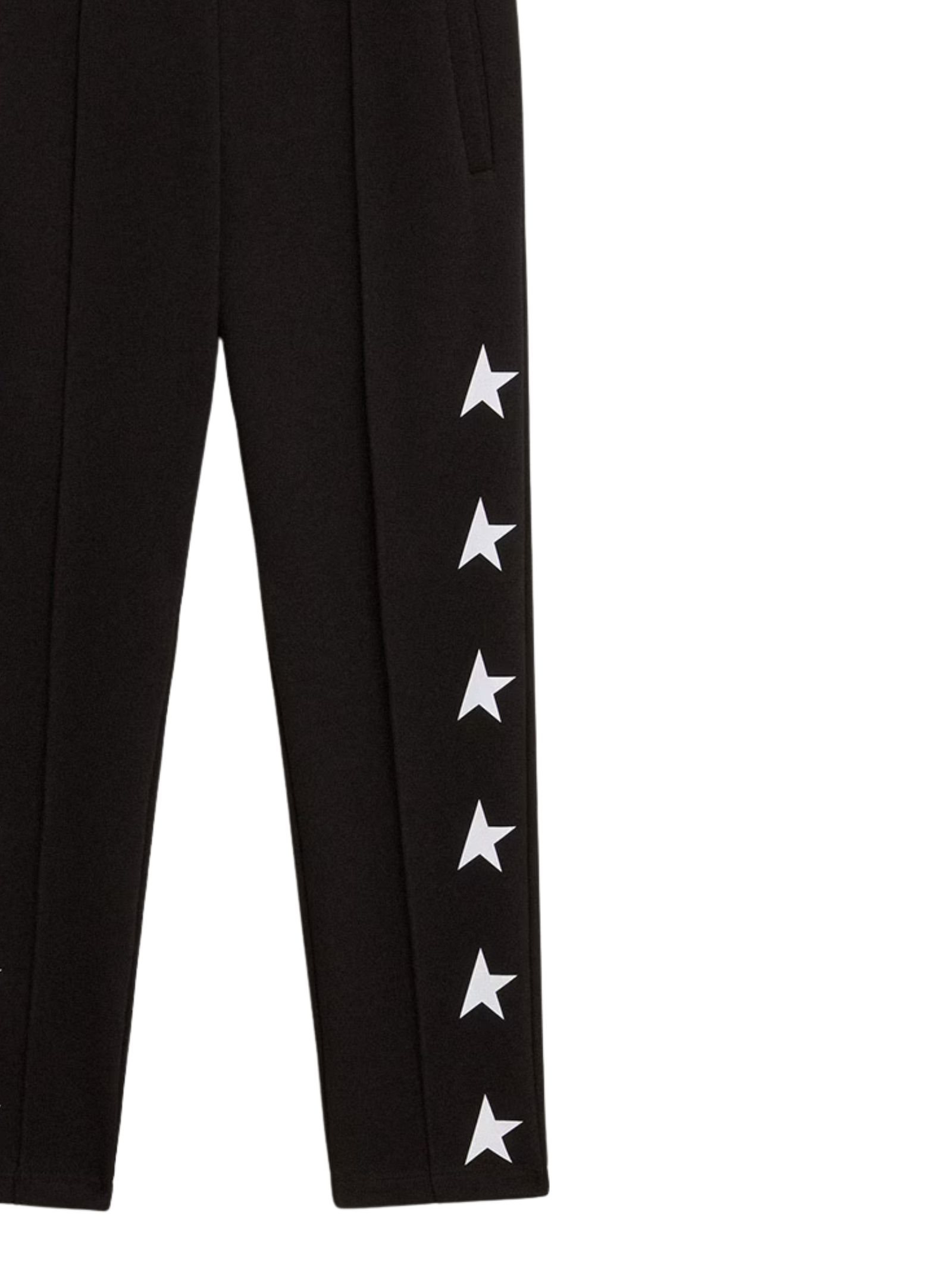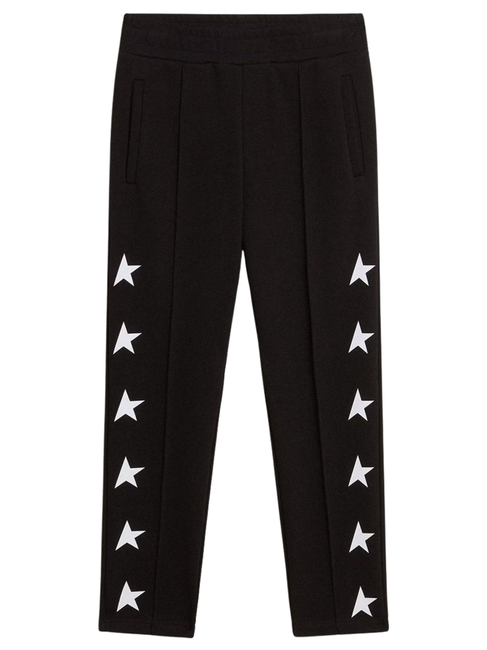 Golden Goose Kids black trousers with an elastic waistband, featuring a contrasting white star print on the side, three pockets, and a slightly stretchy fabric. Composition: 80% cotton, 20% polyester. Made in Italy.