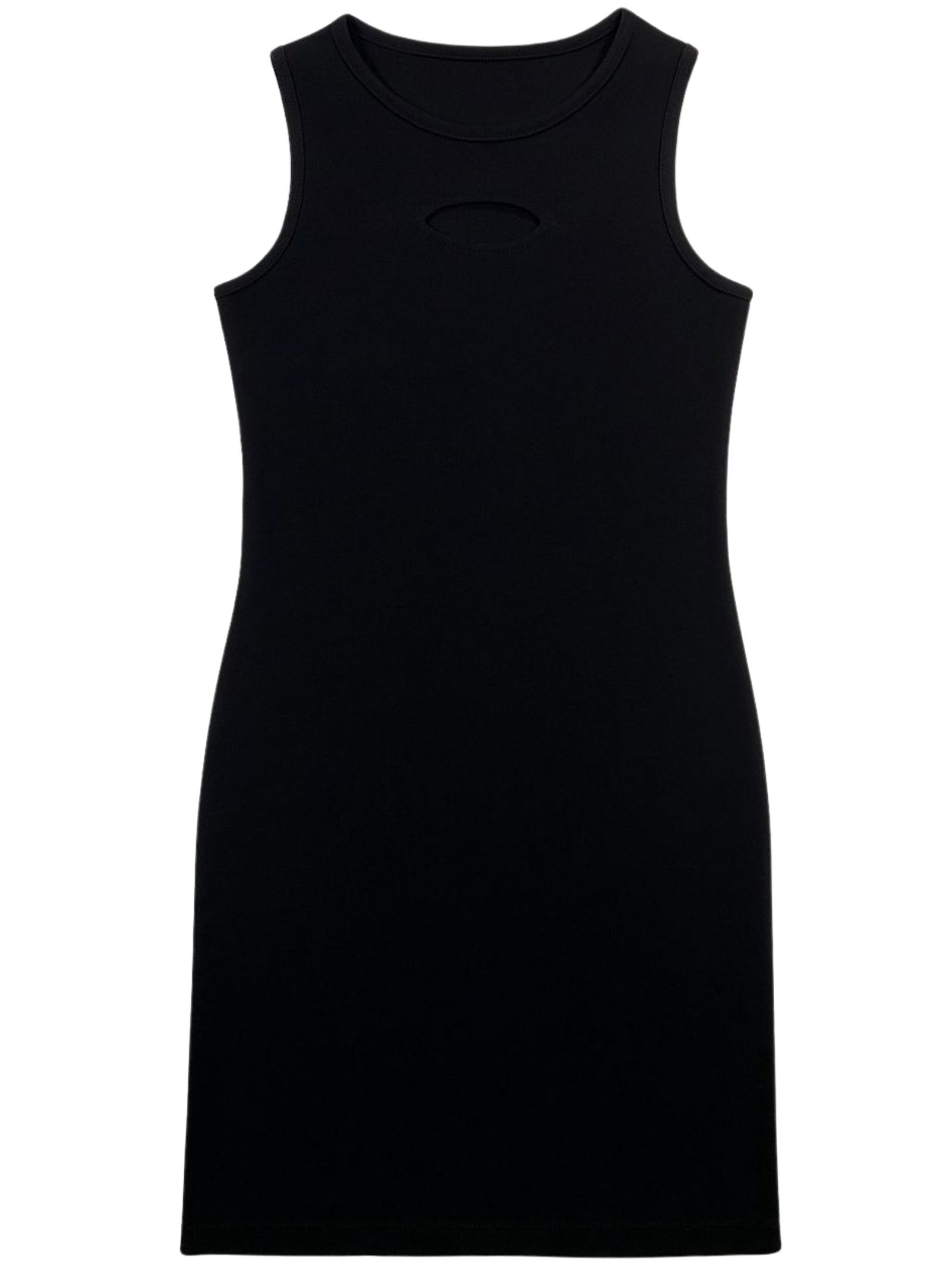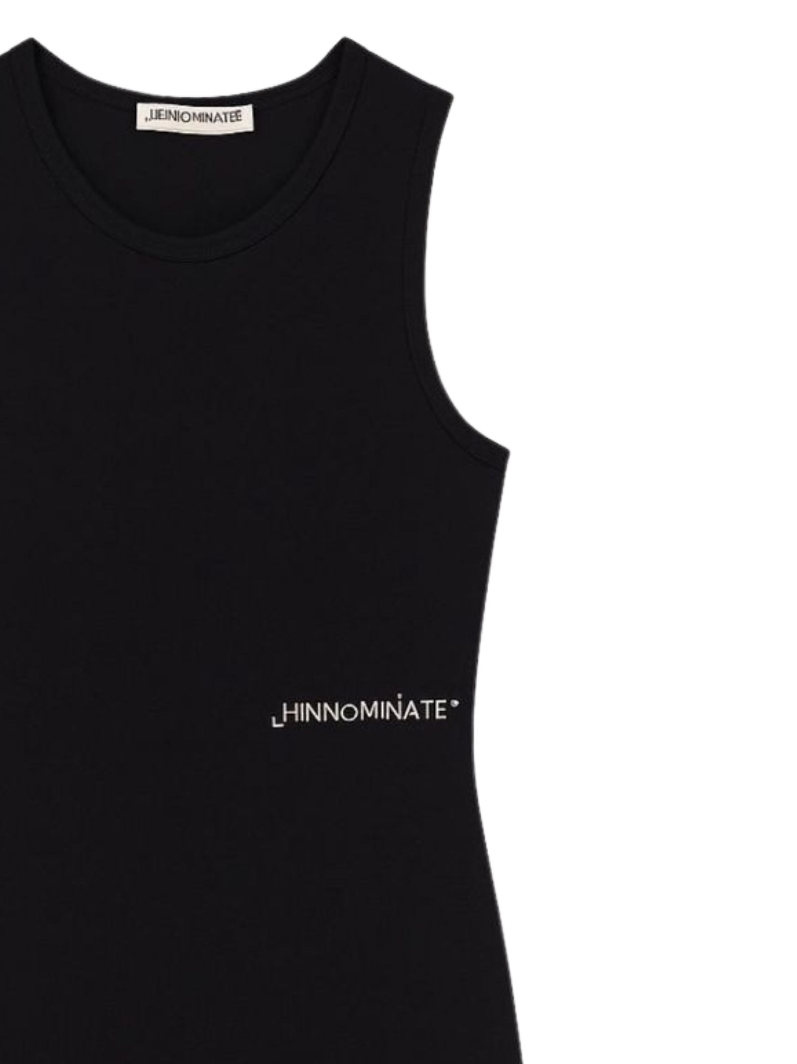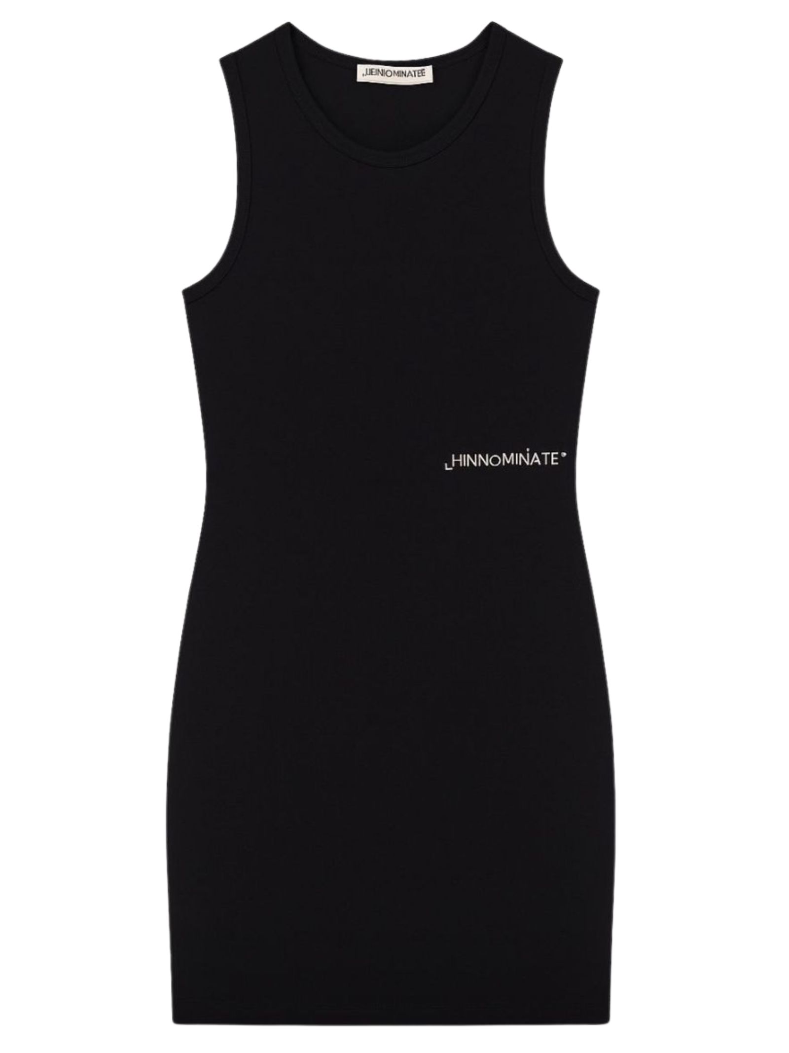Hinnominate Kids black dress with armholes, a round neckline, a cutout detail on the back, a contrasting logo print, and a fitted design. Composition: 90% cotton, 10% elastane. Made in Italy.