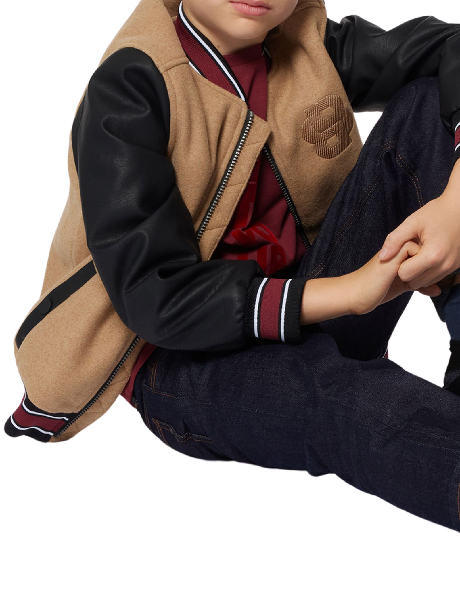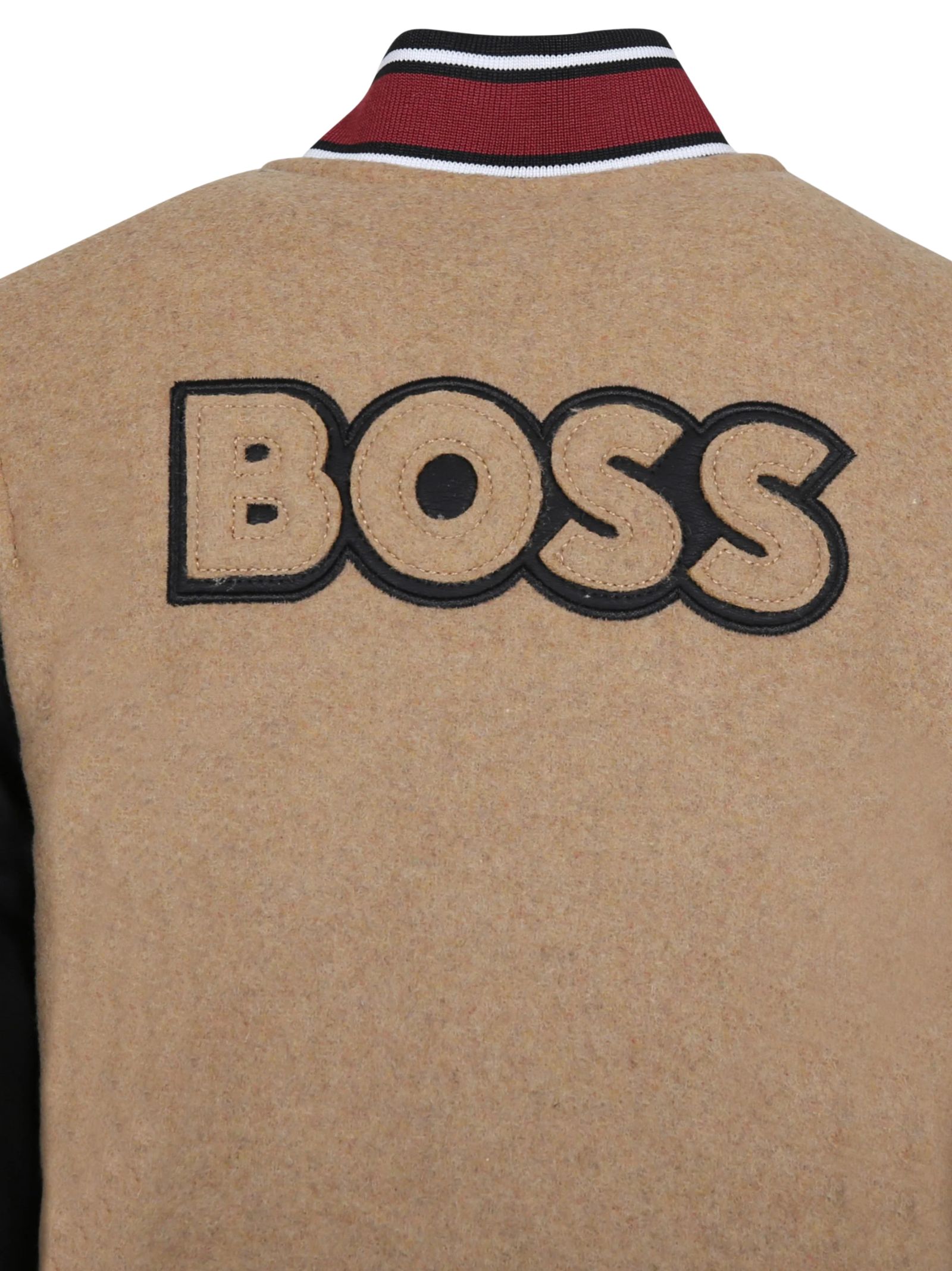 Hugo Boss Kids beige bomber jacket, inspired by American models, mandarin collar, side pockets, embroidery on the chest and elasticated stripes on the cuffs and bottom. Composition: 53% polyester 42% wool 3% acrylic 1% polyamide 1% viscose. Padding: 100% polyester