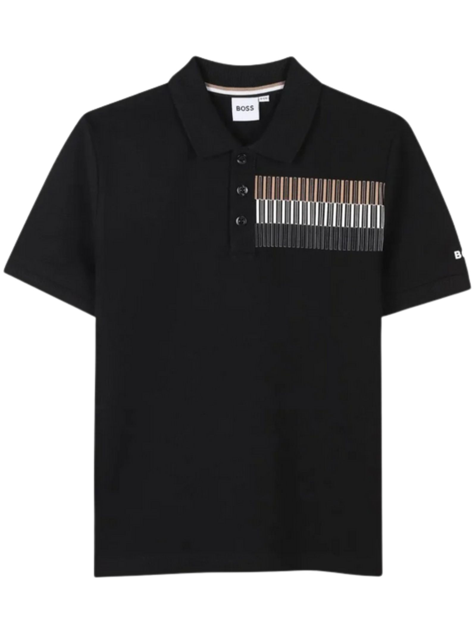 Hugo Boss Kids black polo shirt with multicolor print on the chest, short sleeves, logo on the arm, side vents, regular fit. Composition: 96% cotton, 4% elastane.